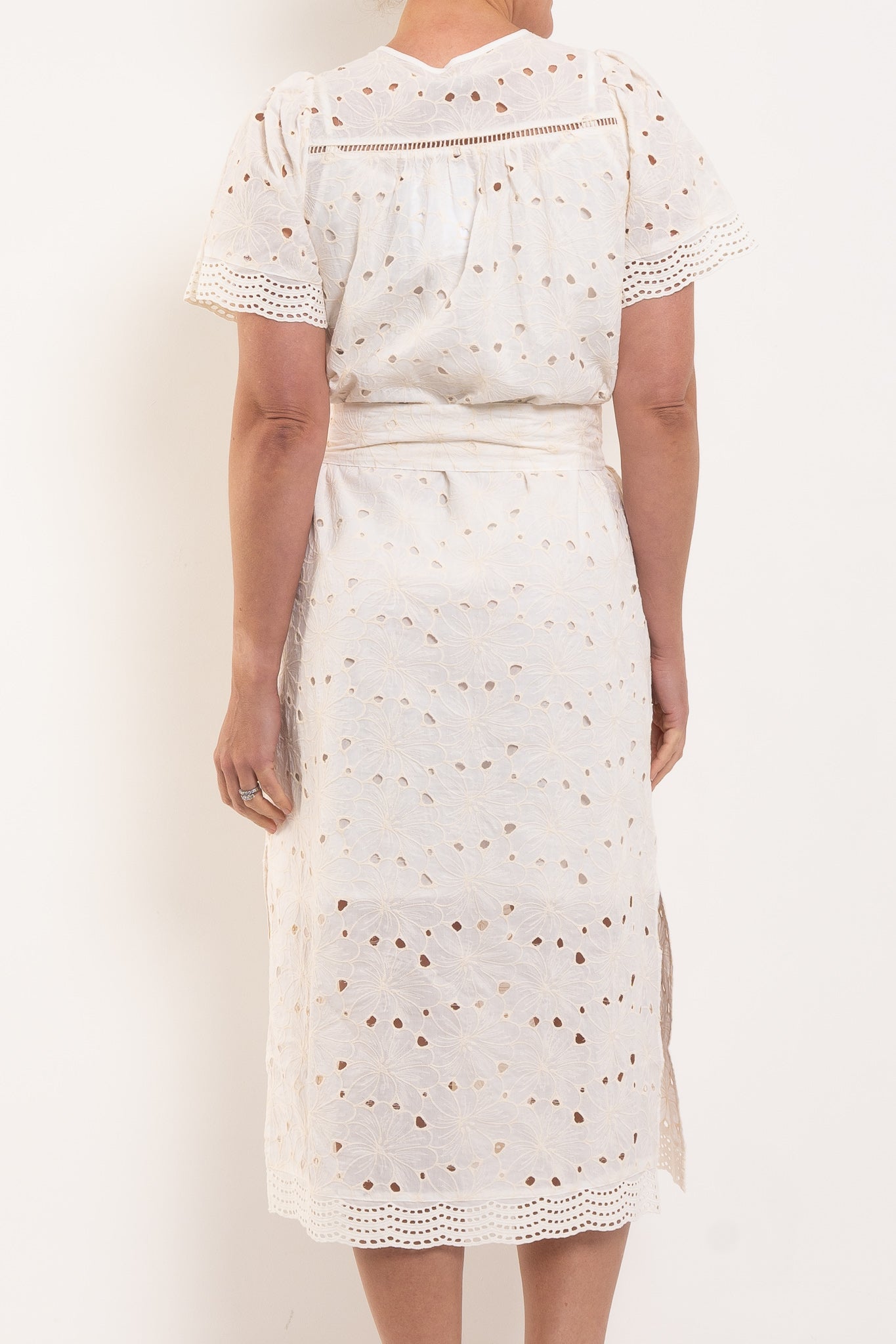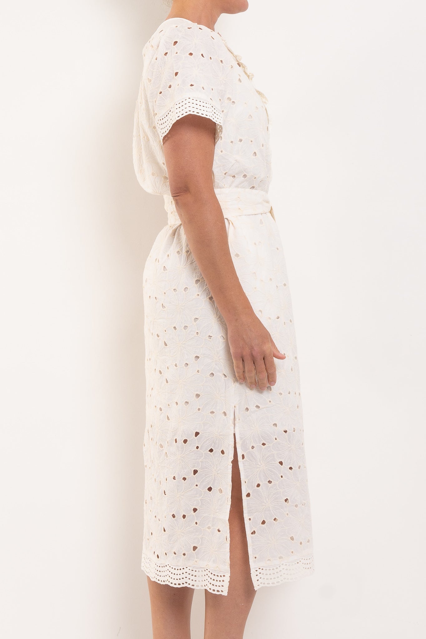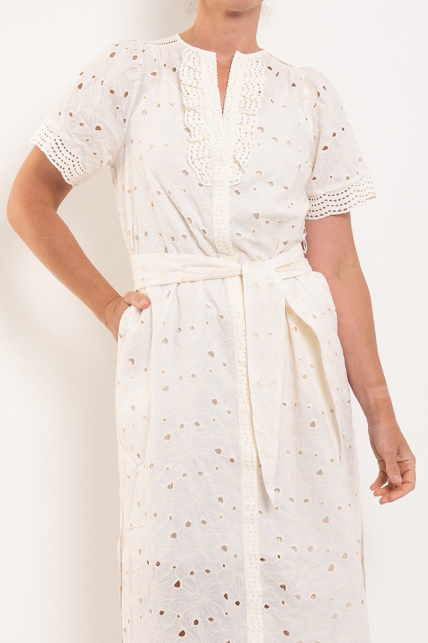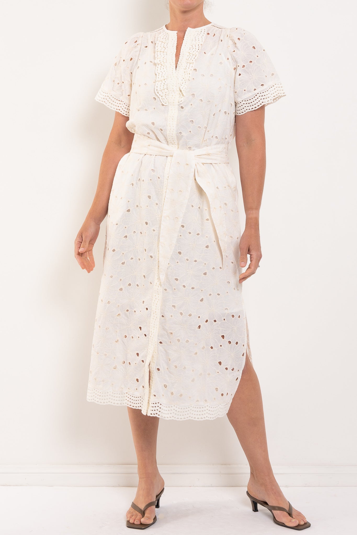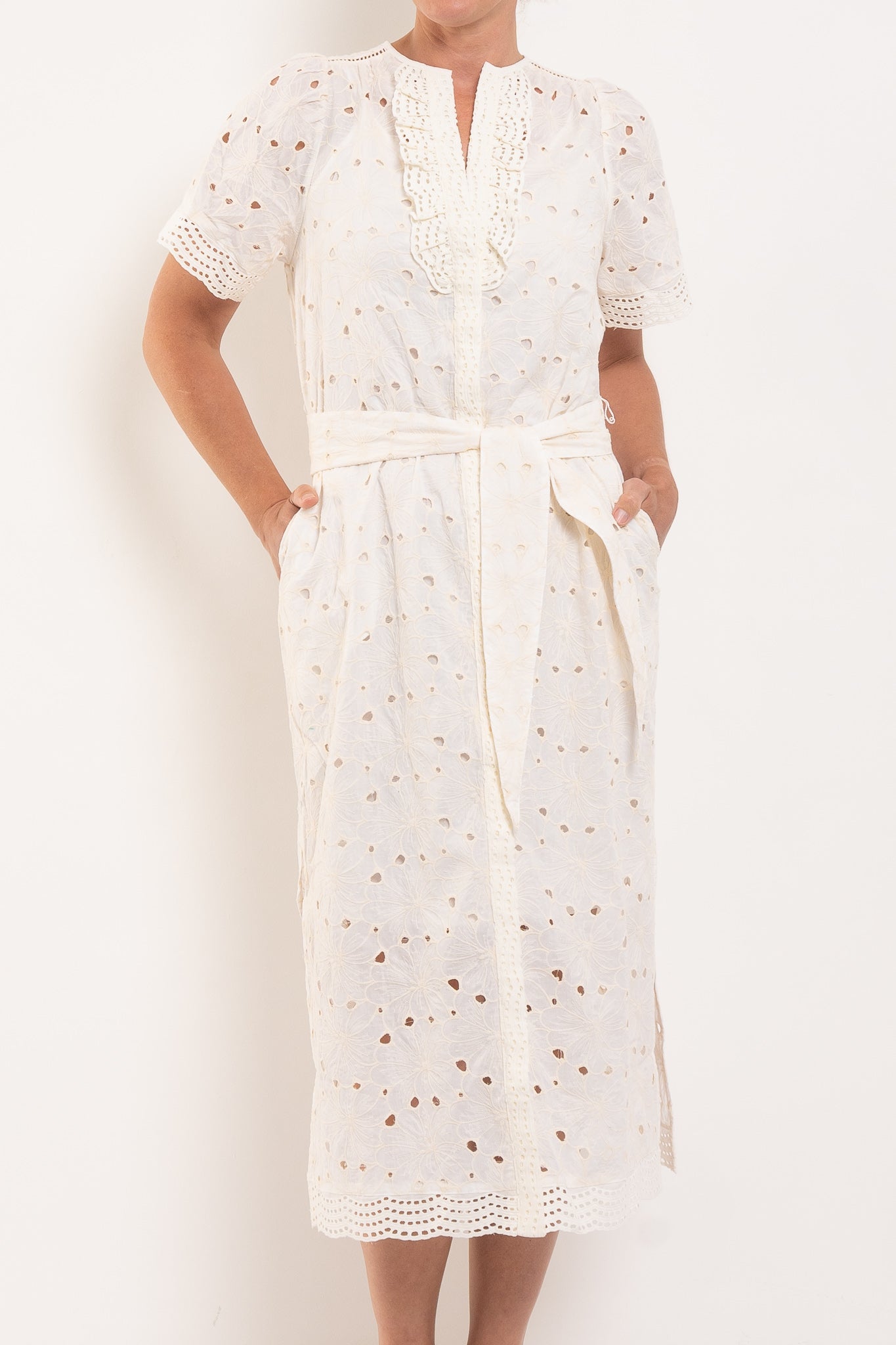 Crafted in intricate embroidered cotton with a softly structured drape, the Voyage Dress features delicate lace trim, short sleeves, and a refined split neckline framed with frill detailing. The optional self-tie belt lets you choose between a cinched waist or relaxed silhouette, while side splits at the hem keep it breezy and wearable. Offered in a striking emerald or fresh cream, it’s the perfect blend of polish and nonchalance — the kind of dress that feels at home everywhere from brunch to barefoot evenings by the sea.