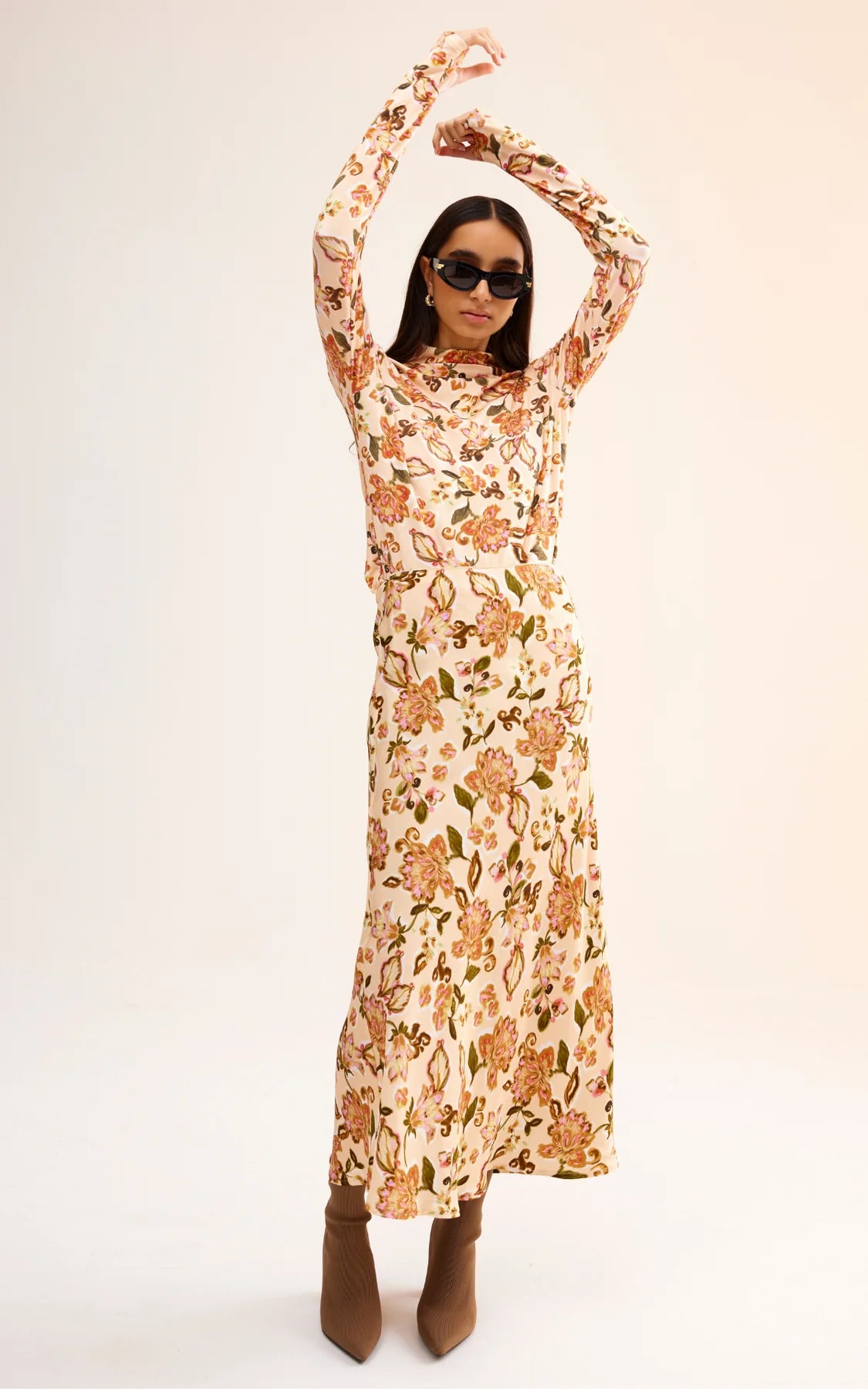 The exclusive Garden print brings warmth to this piece with a whimsical array of florals in soft peachy tones.