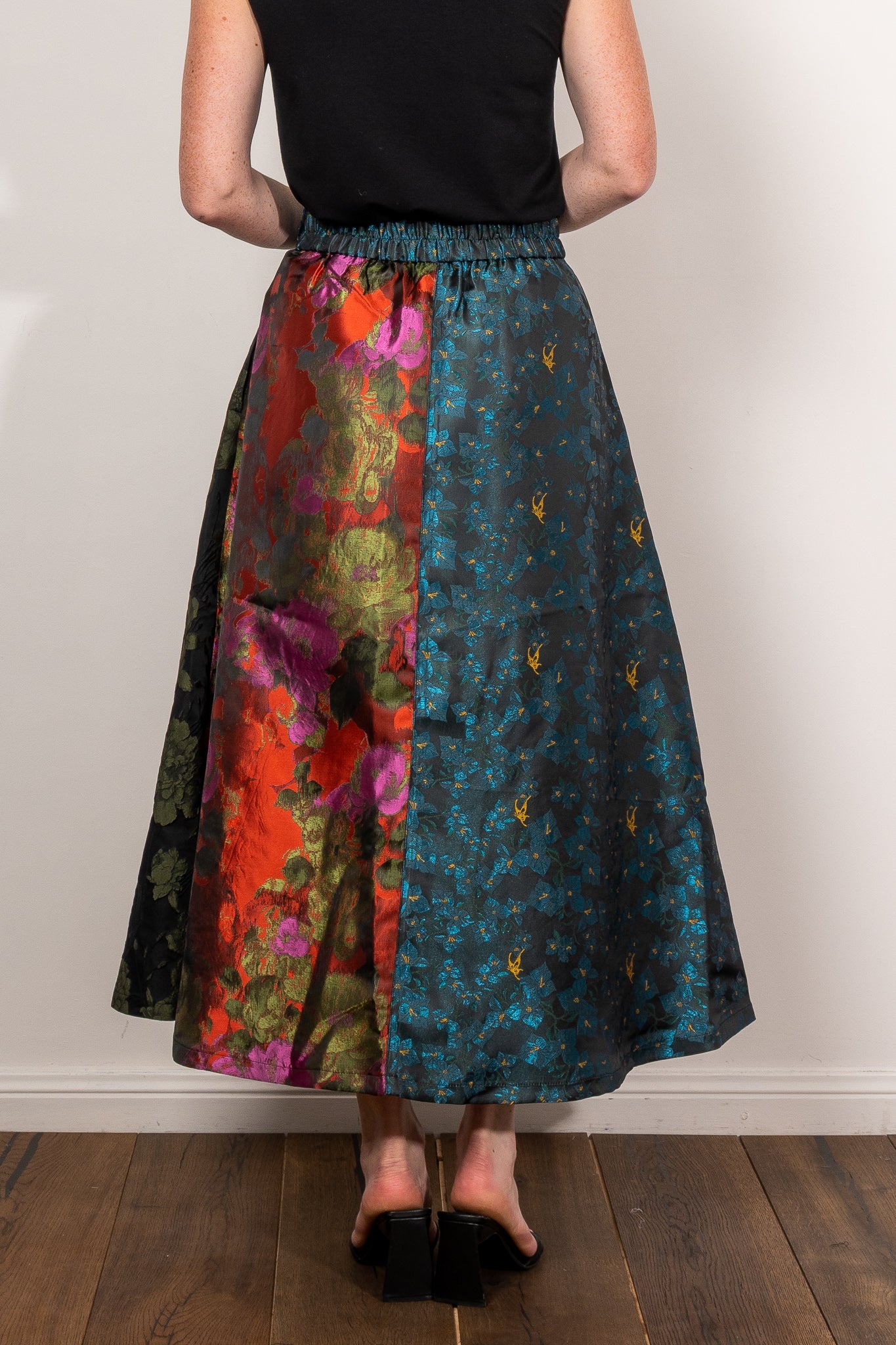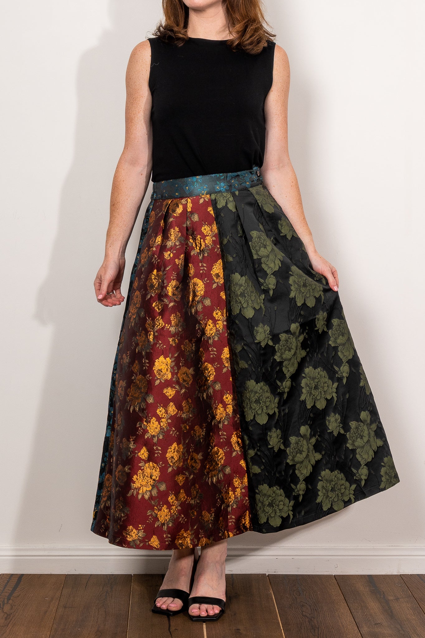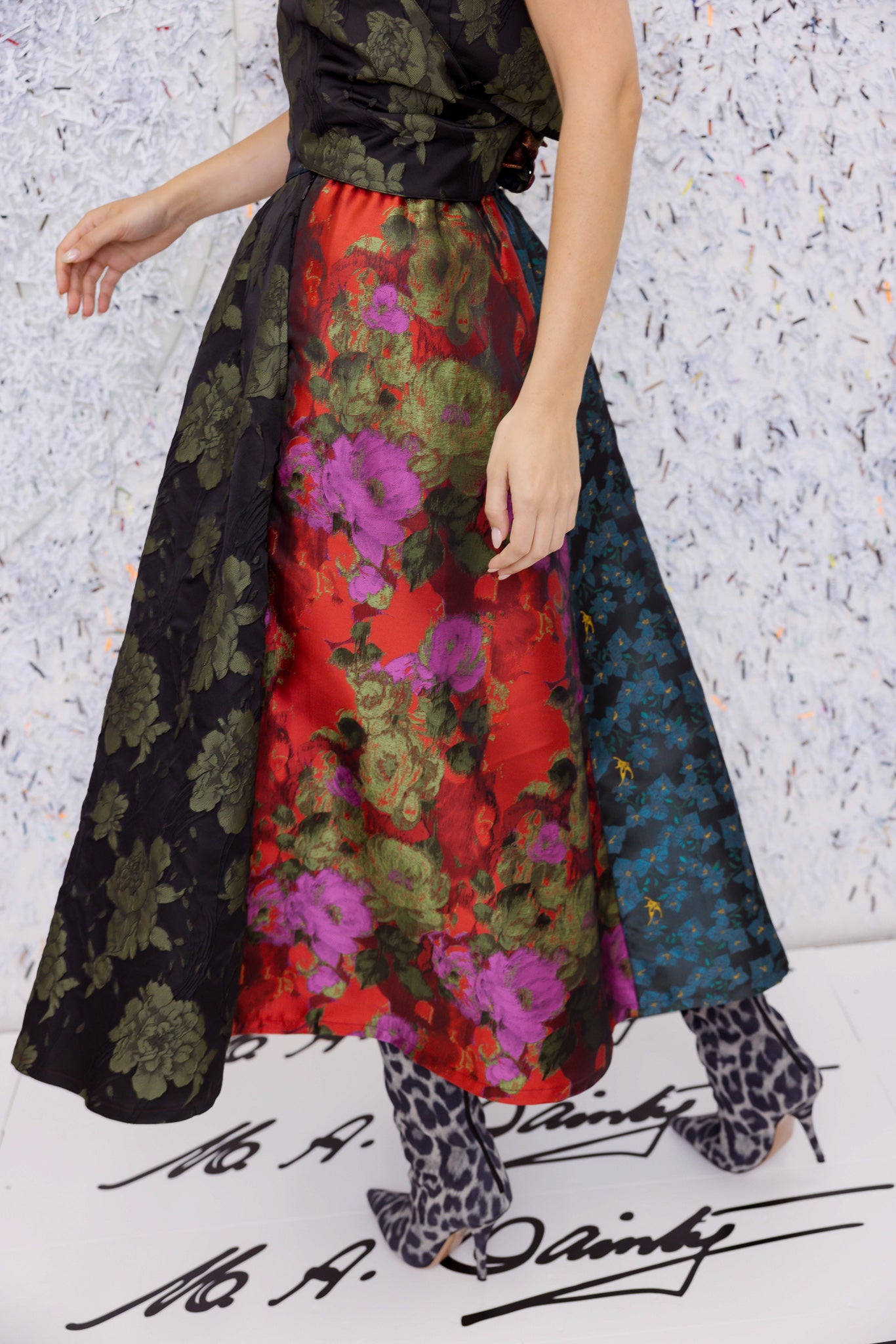 Indulge in the opulent style of the M.A. Dainty Parted Skirt! This full maxi skirt features bold jacquard printed panels, a high waist, and pockets for practicality. The elastic back waistband adds comfort while the lining adds a luxurious touch. Make a statement by pairing this skirt with the Part Dress for a stunning evening look.