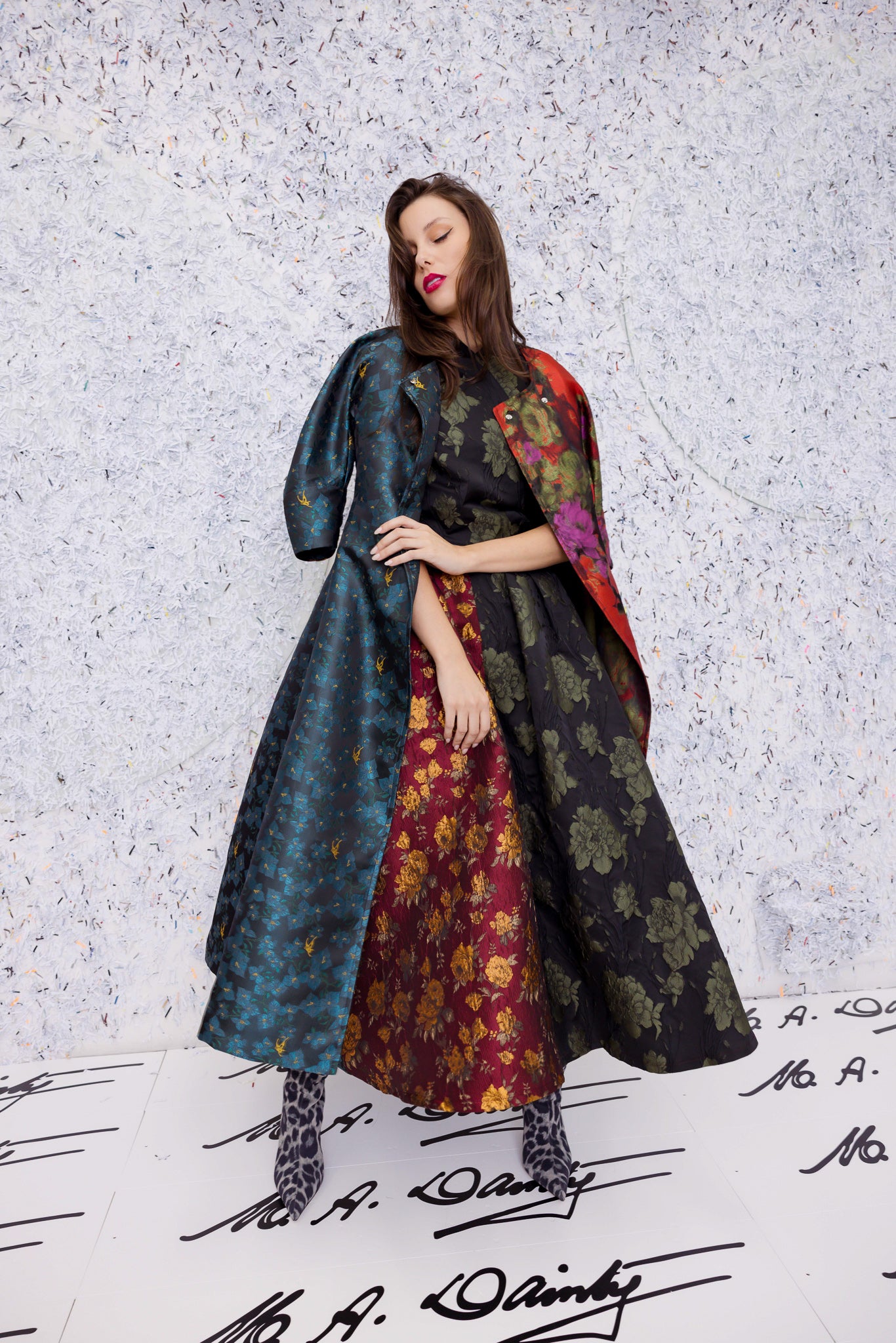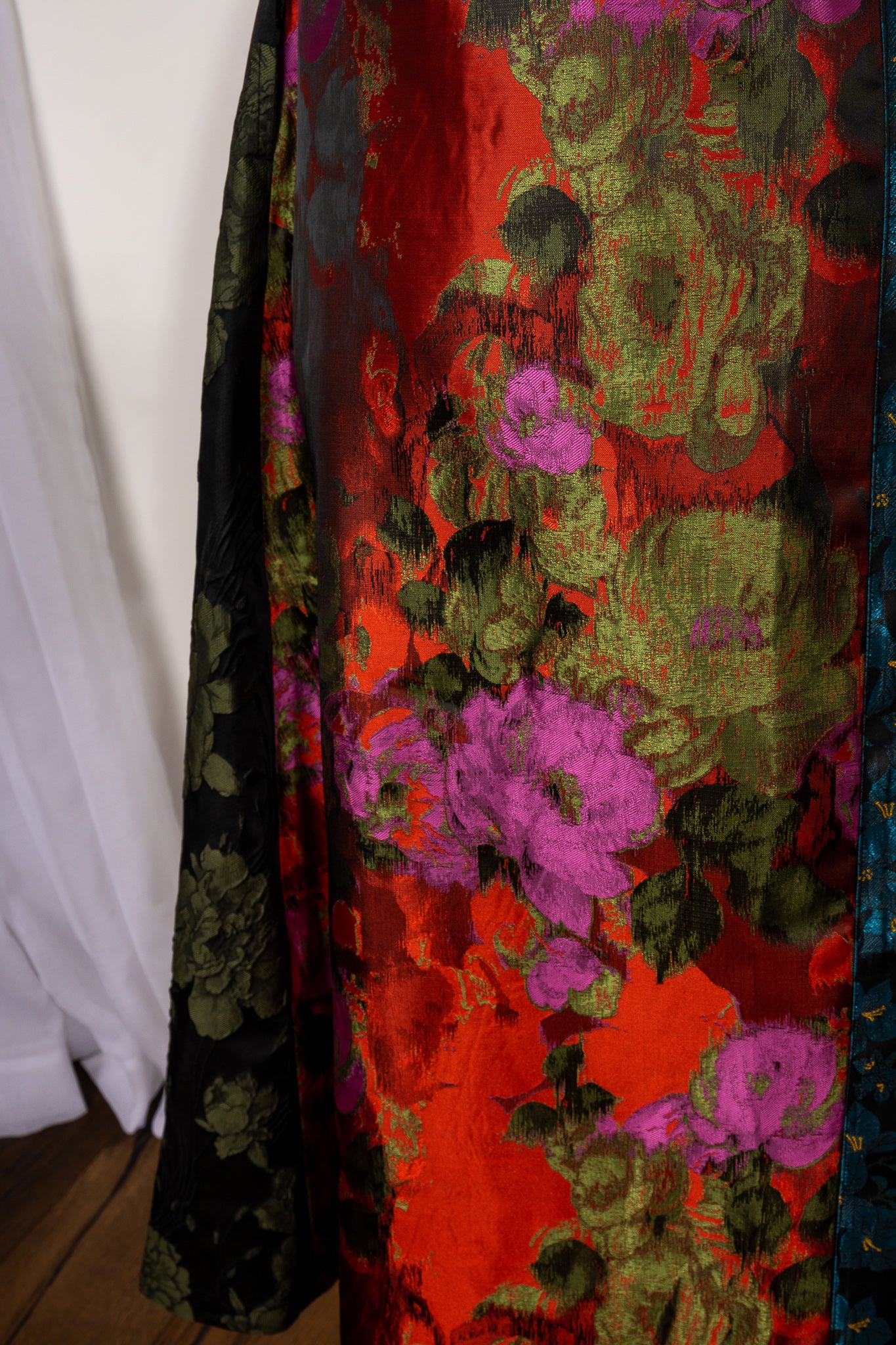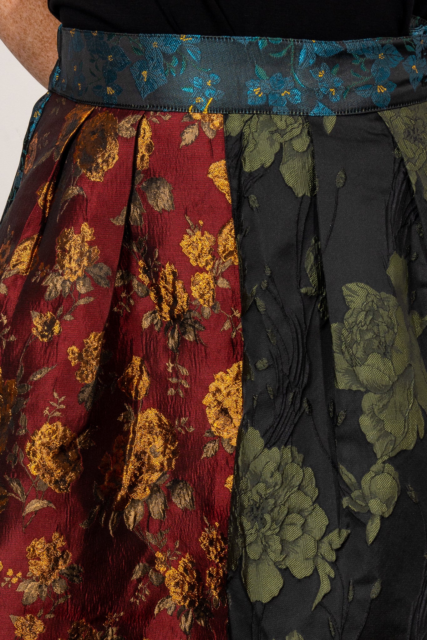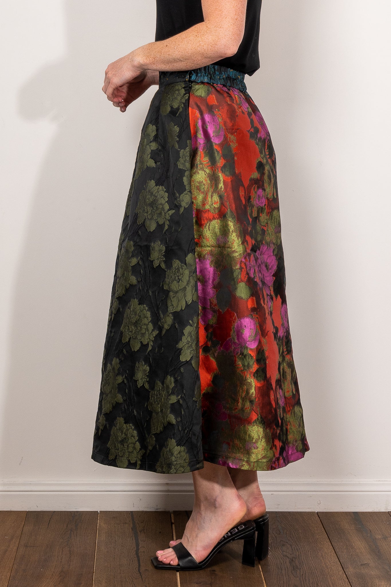 Indulge in the opulent style of the M.A. Dainty Parted Skirt! This full maxi skirt features bold jacquard printed panels, a high waist, and pockets for practicality. The elastic back waistband adds comfort while the lining adds a luxurious touch. Make a statement by pairing this skirt with the Part Dress for a stunning evening look.
