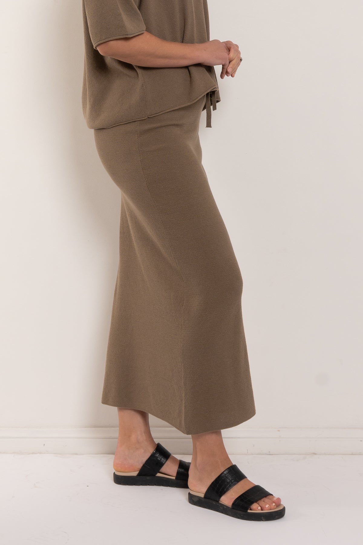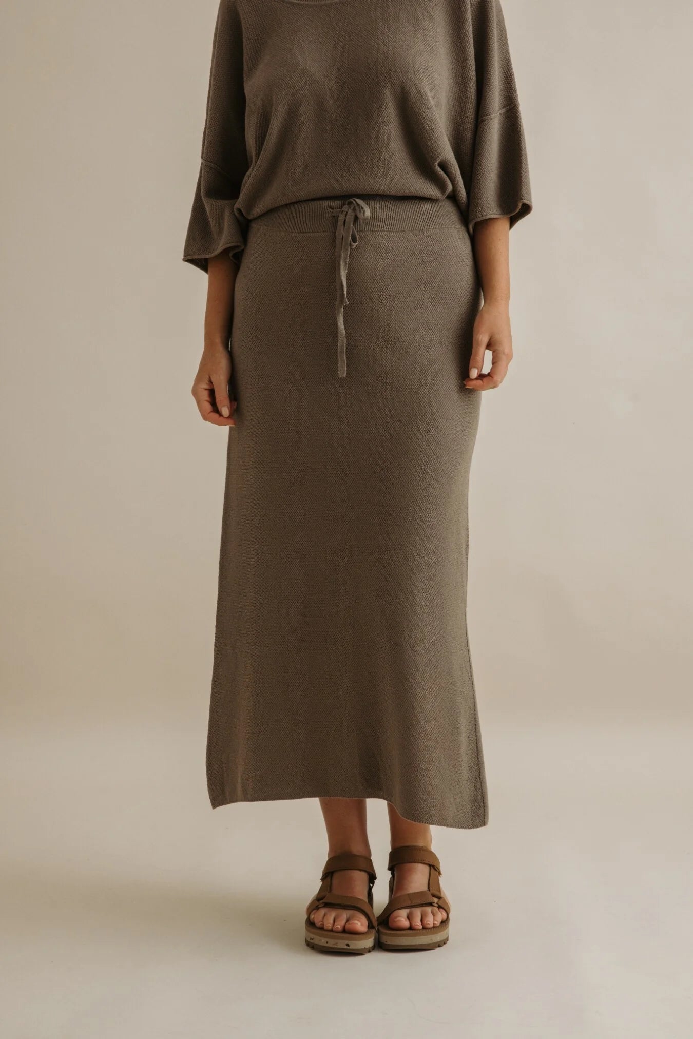 Talamaya’s Retreat Cotton Twist Skirt is the epitome of laid-back luxury. Knitted from 100% cotton in a softly twisted tuck stitch, it drapes with ease while offering just the right amount of structure. The relaxed fit, elastic waist and subtle side split make this skirt as comfortable as it is versatile. Finished with a drawstring detail, it’s the kind of piece you’ll slip on for everyday ease and elevated styling alike. Style back with the matching Retreat Cotton Twist Tee Pullover for a simple, polished set.