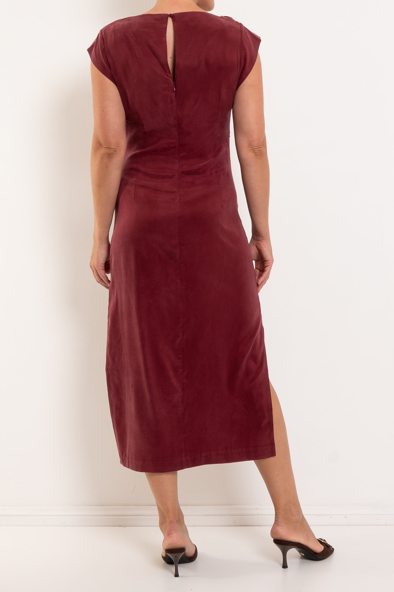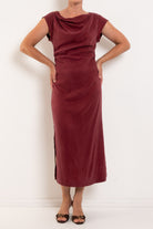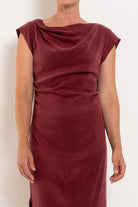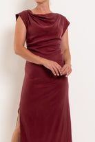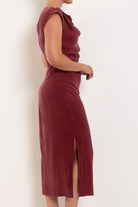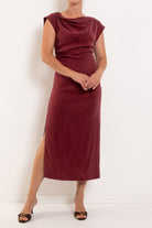 Sophisticated elegance meets luminous allure in the Once Was Monique Draped Neck Gold Detail Dress. This statement piece features premium cupro viscose stretch fabric with a subtle gold sheen, delivering fluid drape that moves gracefully with you. The softly draped neckline frames your décolletage with effortless refinement, while the streamlined column silhouette creates a sleek, elongating effect. Rich ruby tones capture warmth and depth, perfect for evening events and elevated celebrations.