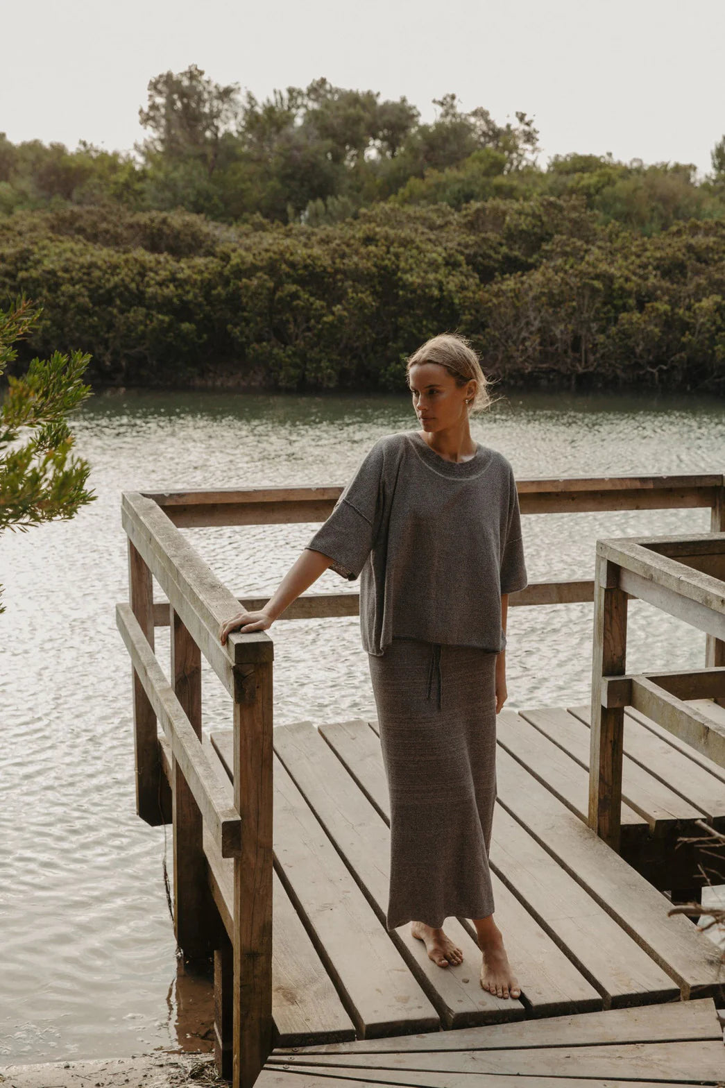 Our model Philippa is an Aus size 10 and wears size S here. She is 178cm tall, Bust: 89cm // Waist: 71cm / 28in // Hip : 96cm / 38in. Philippa is wearing the Salt colourway layered over the Shoreline Fine Slub Singlet.