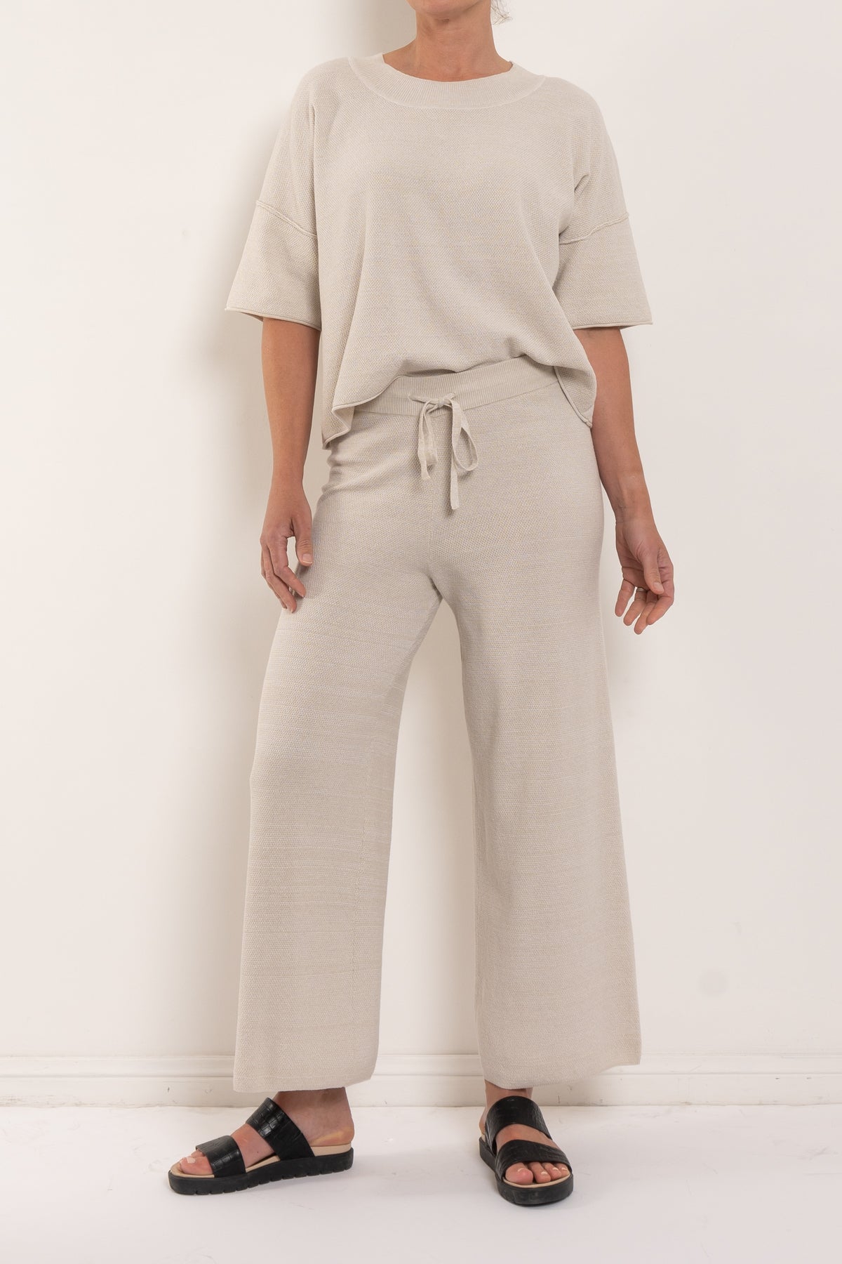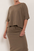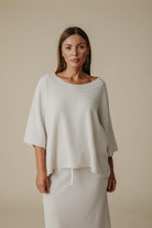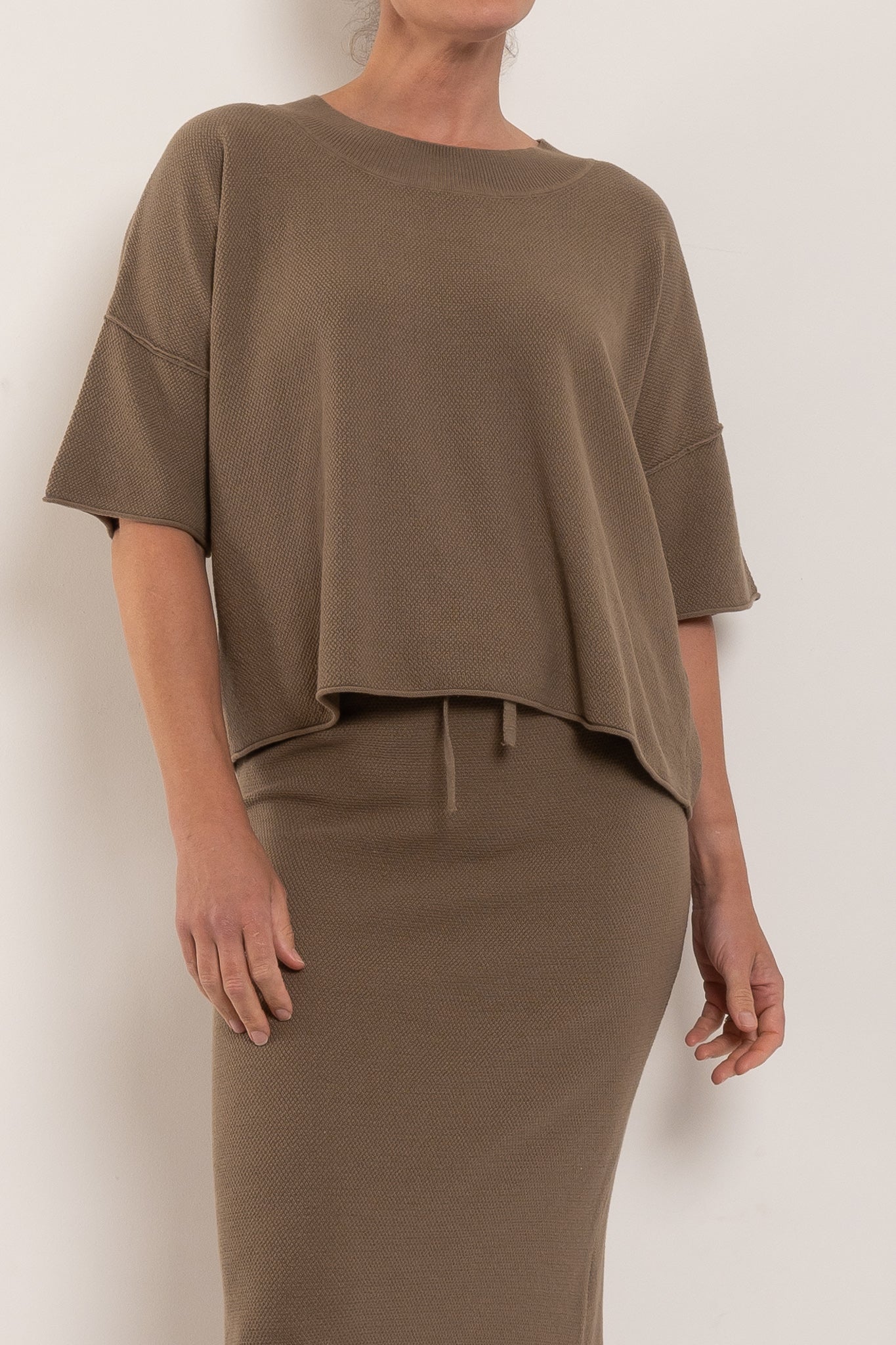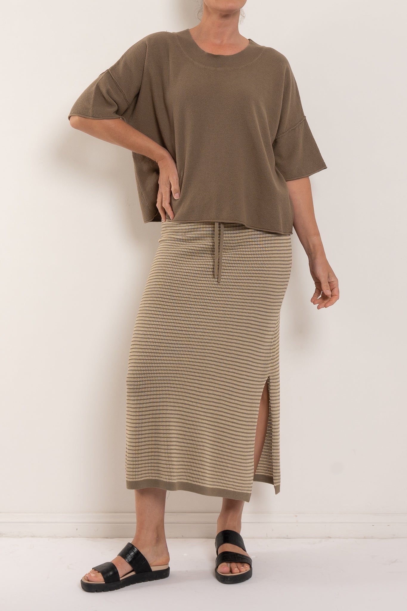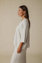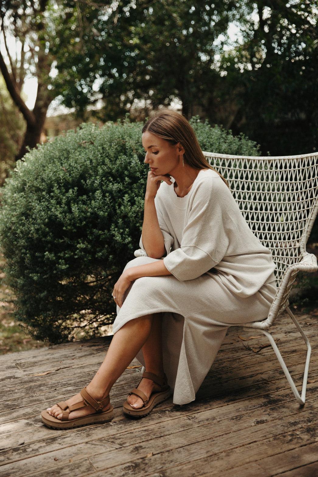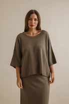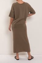 Talamaya’s Retreat Cotton Twist Tee Pullover is a modern essential you’ll live in season after season. Knitted from 100% cotton in a softly twisted tuck stitch, it offers an easy relaxed fit with drop shoulders and a straight hemline that skims at the high hip. Exposed seam details give it that little extra edge, while the breathable knit ensures all-day comfort. Available in the versatile Khaki/Olive and Silver/Salt colourways, this is the perfect partner to the matching Retreat Cotton Twist Skirt — or to mix seamlessly with your everyday wardrobe.