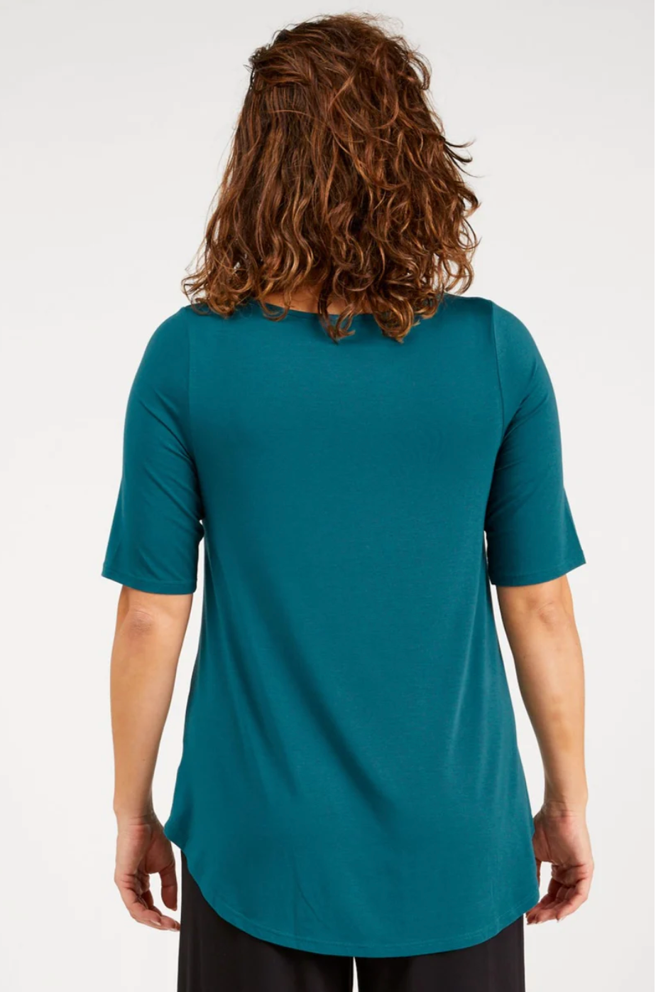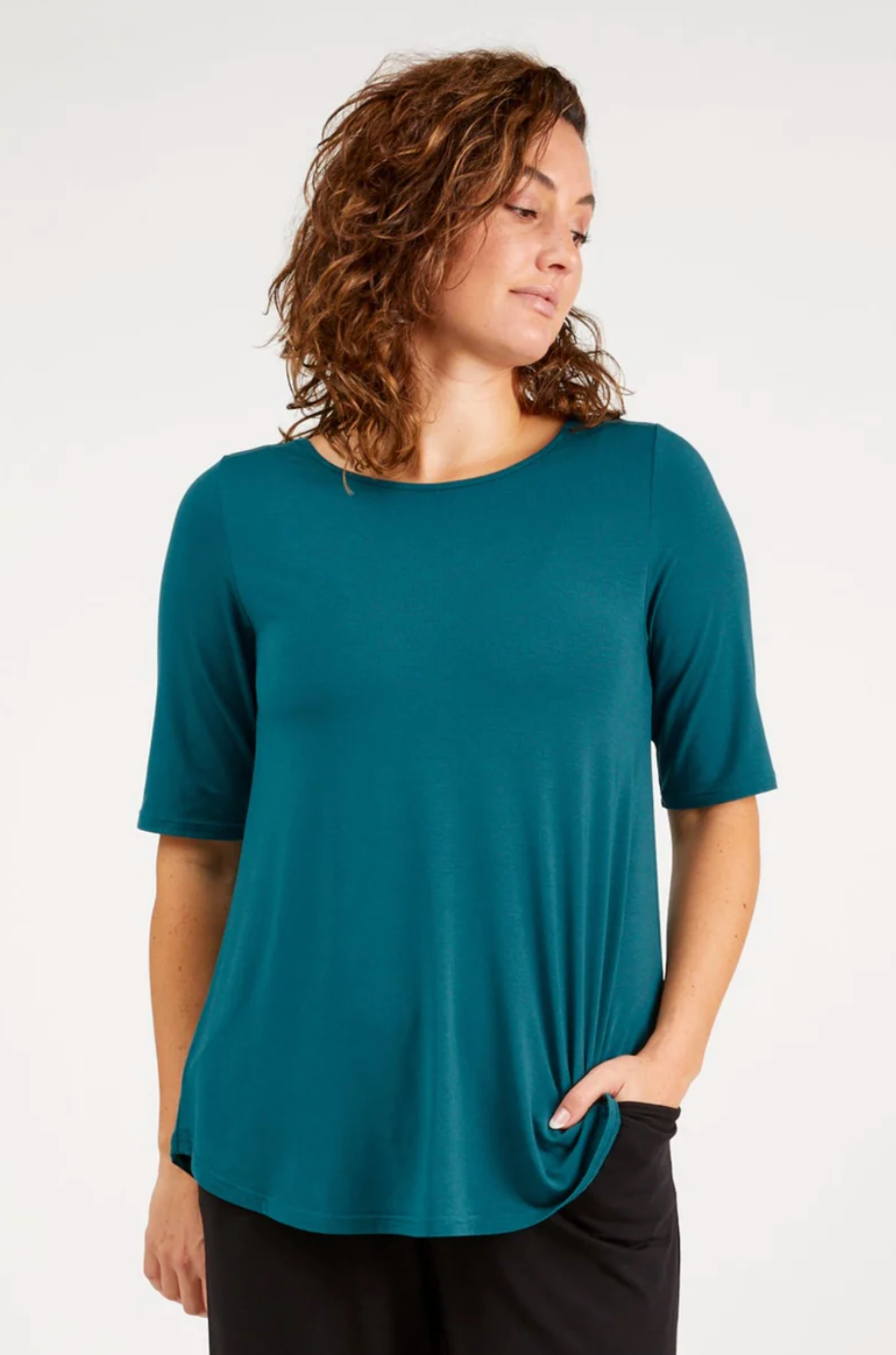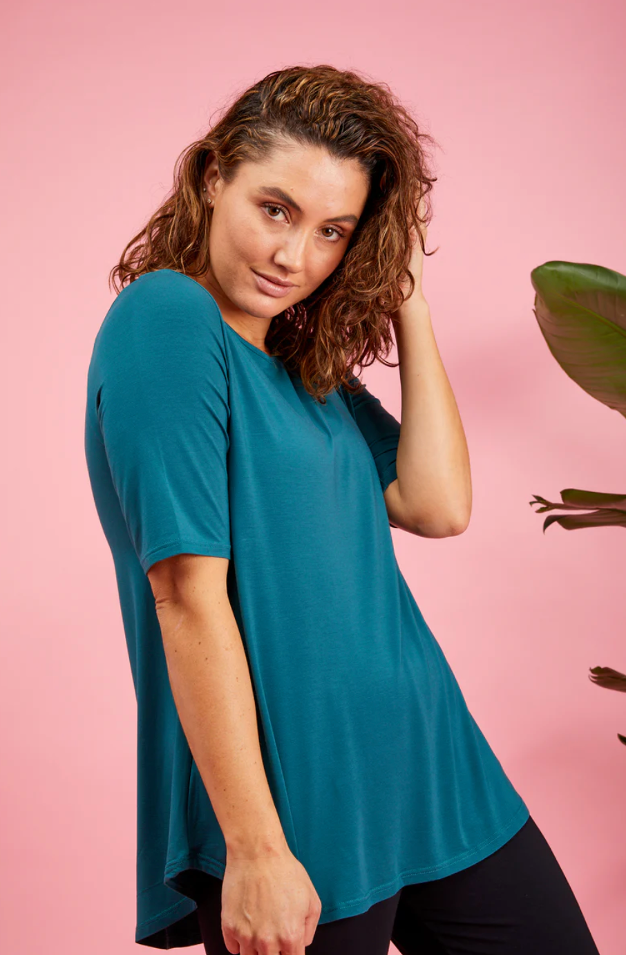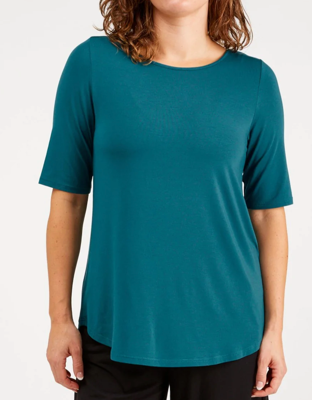 This style has become a wardrobe essential as it is based on the best selling Swing Tee. With added body length front and back and a soft, curved hemline, the Elbow Swing Tee is perfect for the office and dressing up on the weekend. The swing fit allows the body room to move and the elbow length sleeve is one of the many reasons it is a much loved basic in our Tani collection.