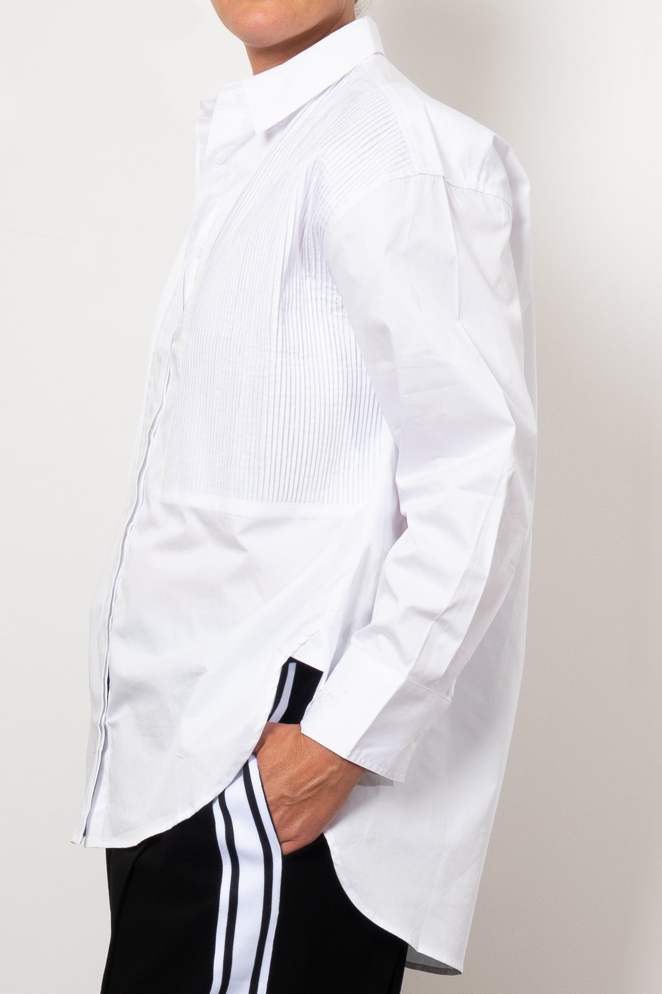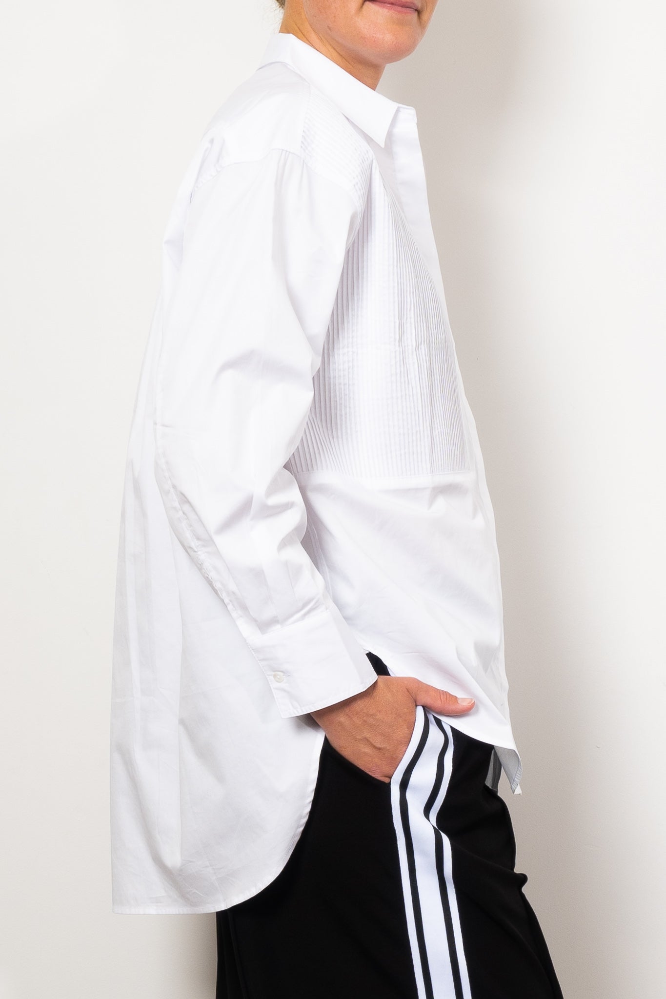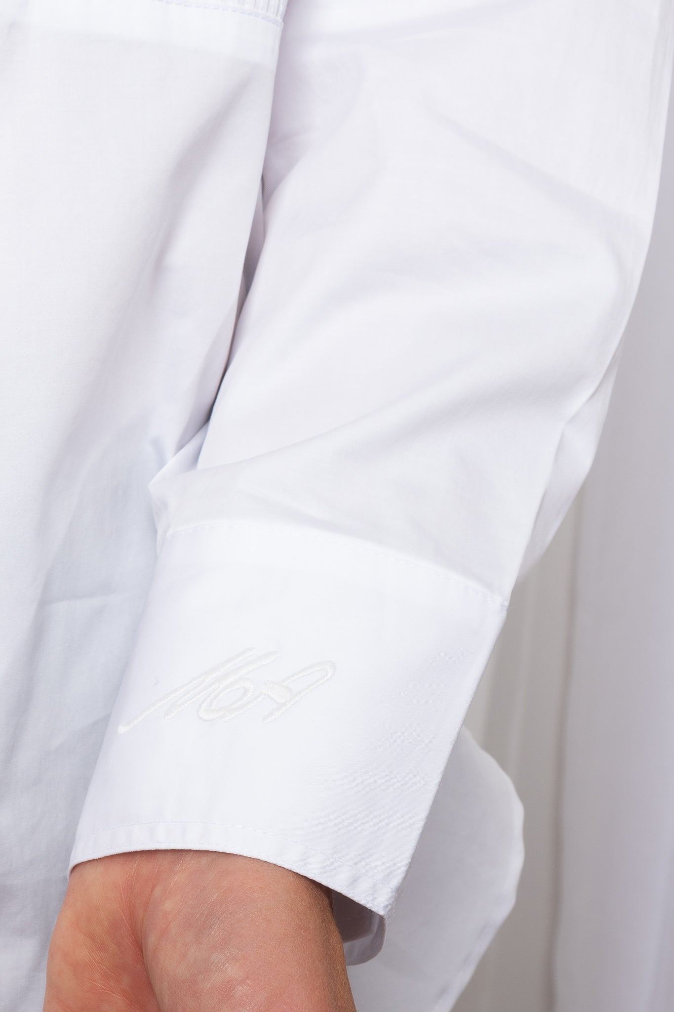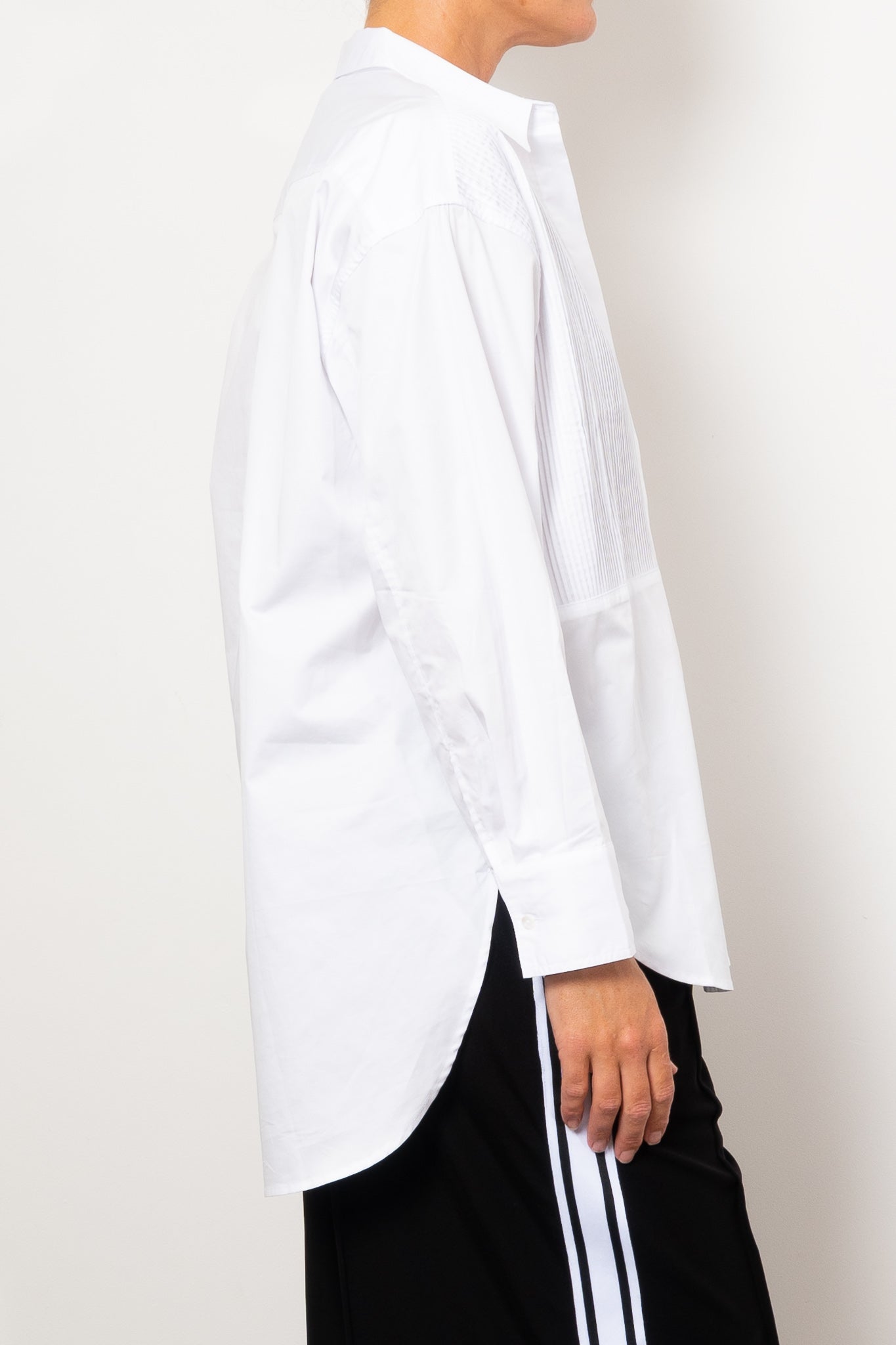 Elevate your wardrobe with the M.A. Dainty Bobby Pin Shirt. Crafted from crisp white cotton, this shirt features fancy pin tuck detailing and an oversized fit for a unique and stylish look. The cuffs are adorned with embroidered MA details and the back has a dipped hem, adding a touch of elegance to this must-have piece.