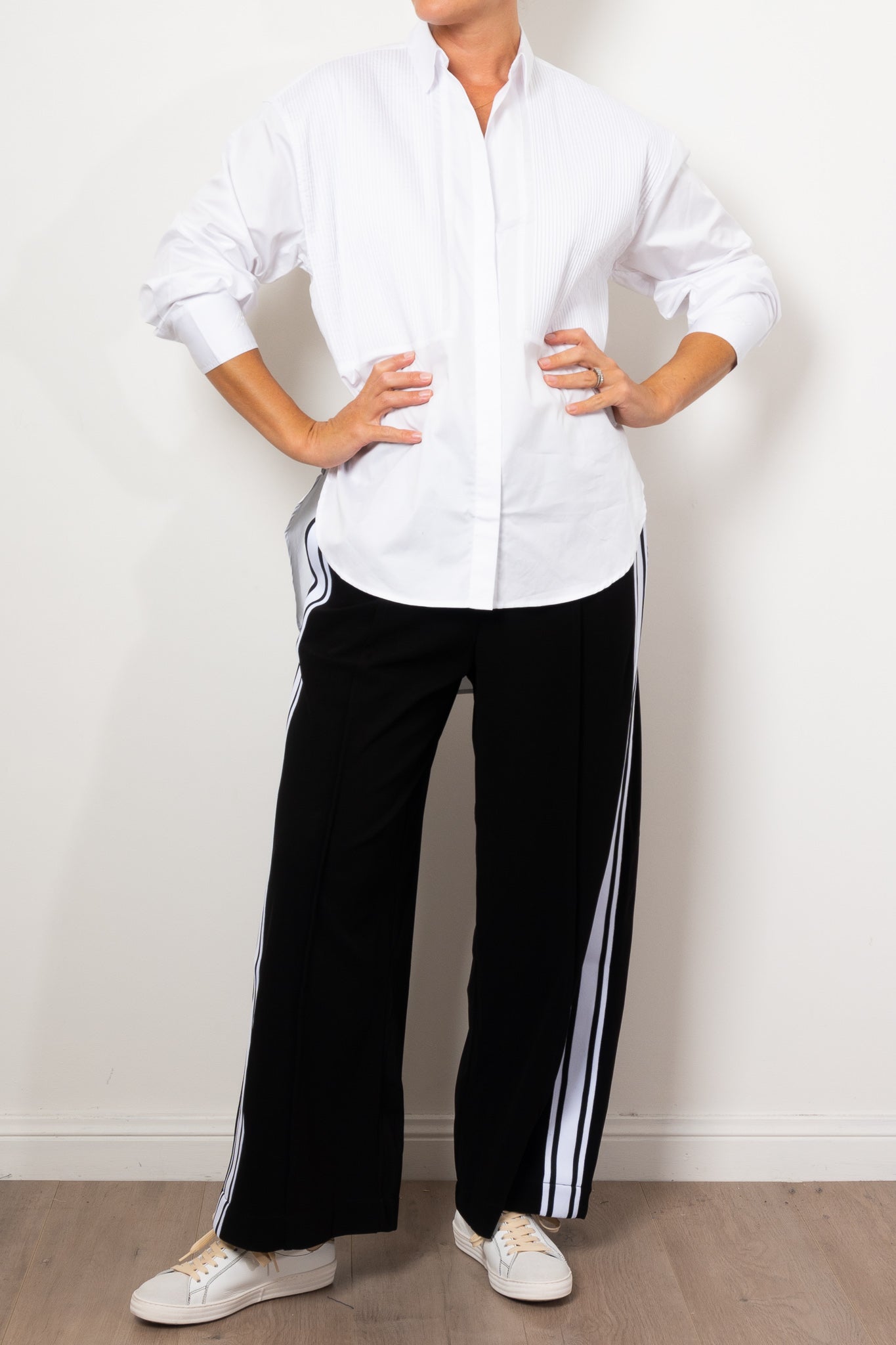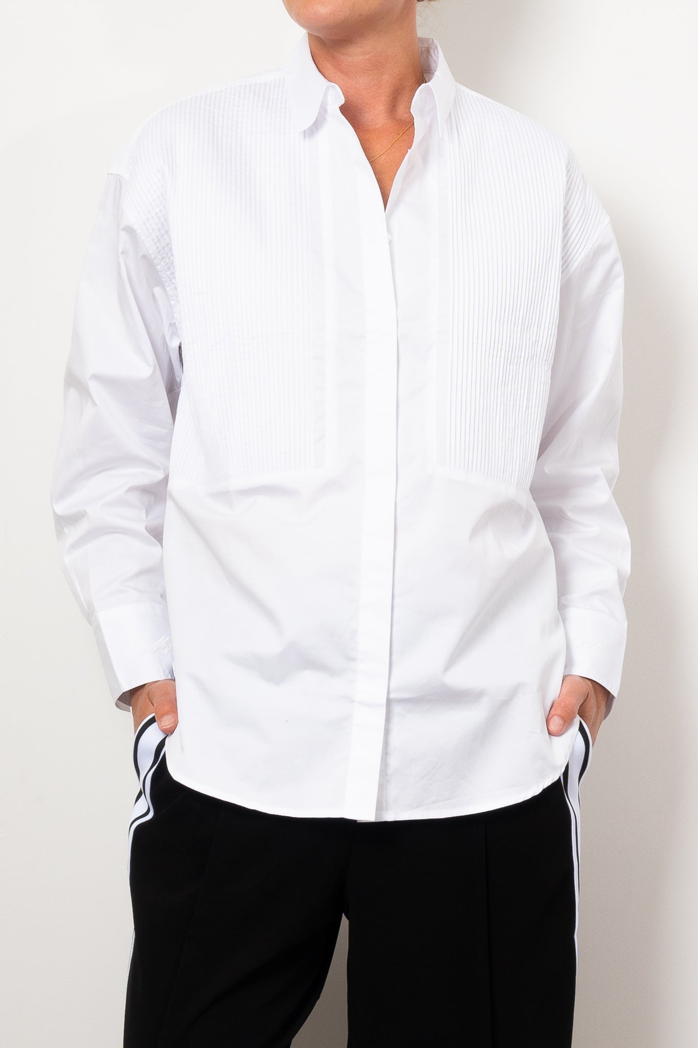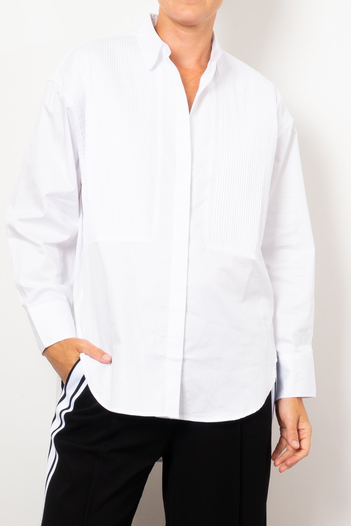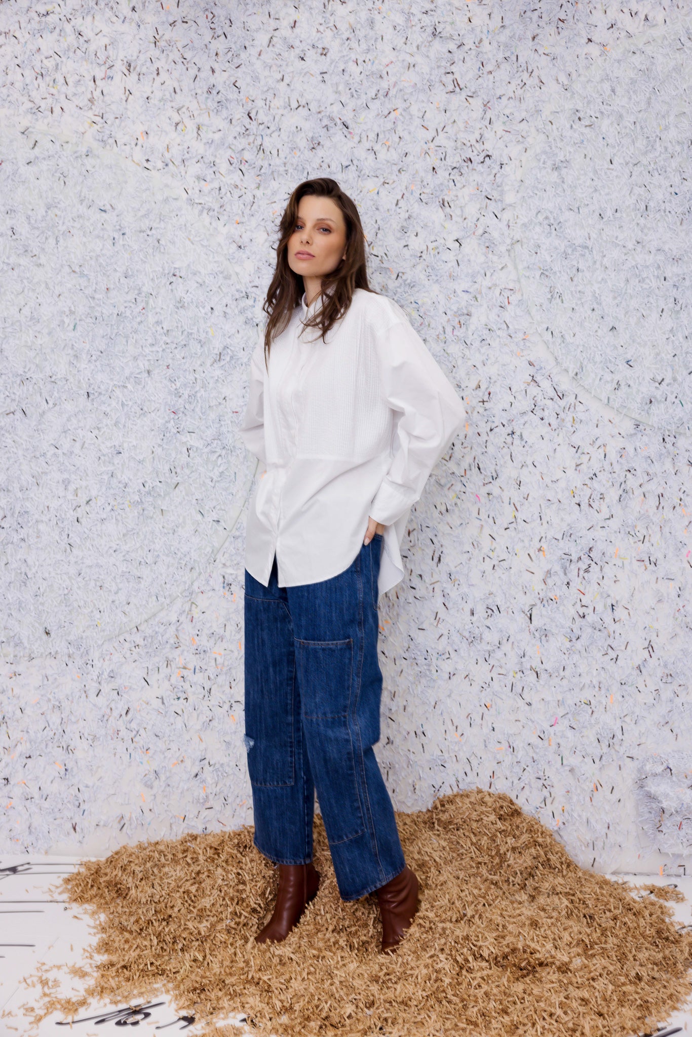 Elevate your wardrobe with the M.A. Dainty Bobby Pin Shirt. Crafted from crisp white cotton, this shirt features fancy pin tuck detailing and an oversized fit for a unique and stylish look. The cuffs are adorned with embroidered MA details and the back has a dipped hem, adding a touch of elegance to this must-have piece.