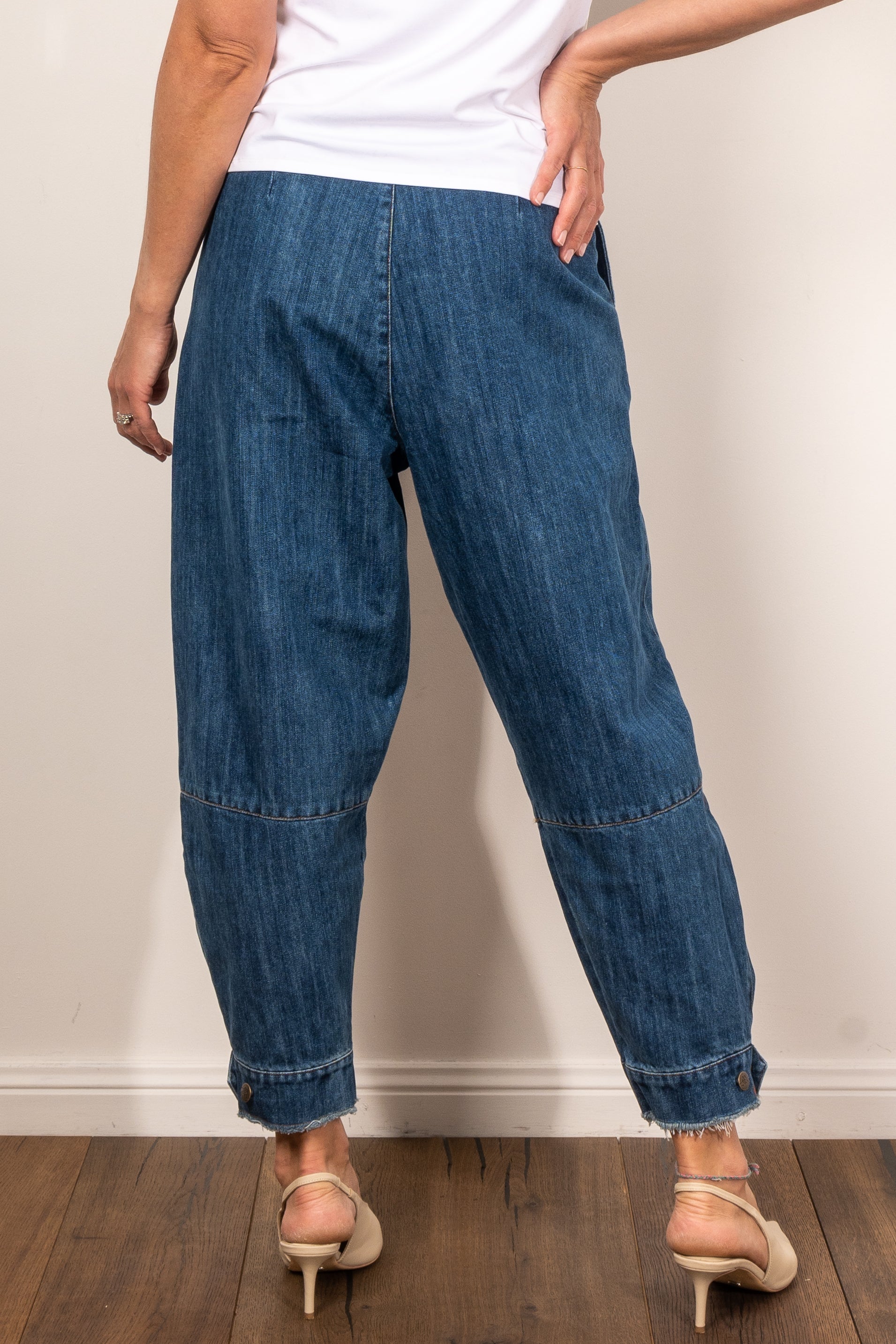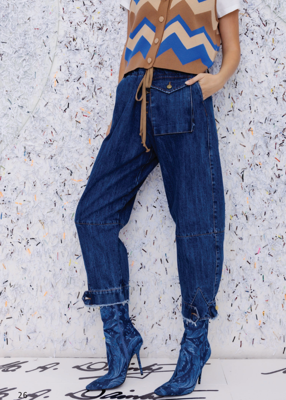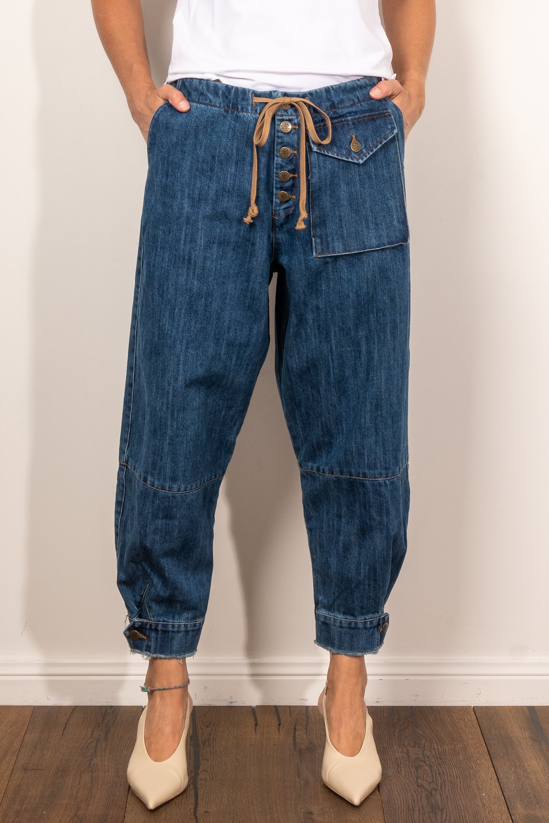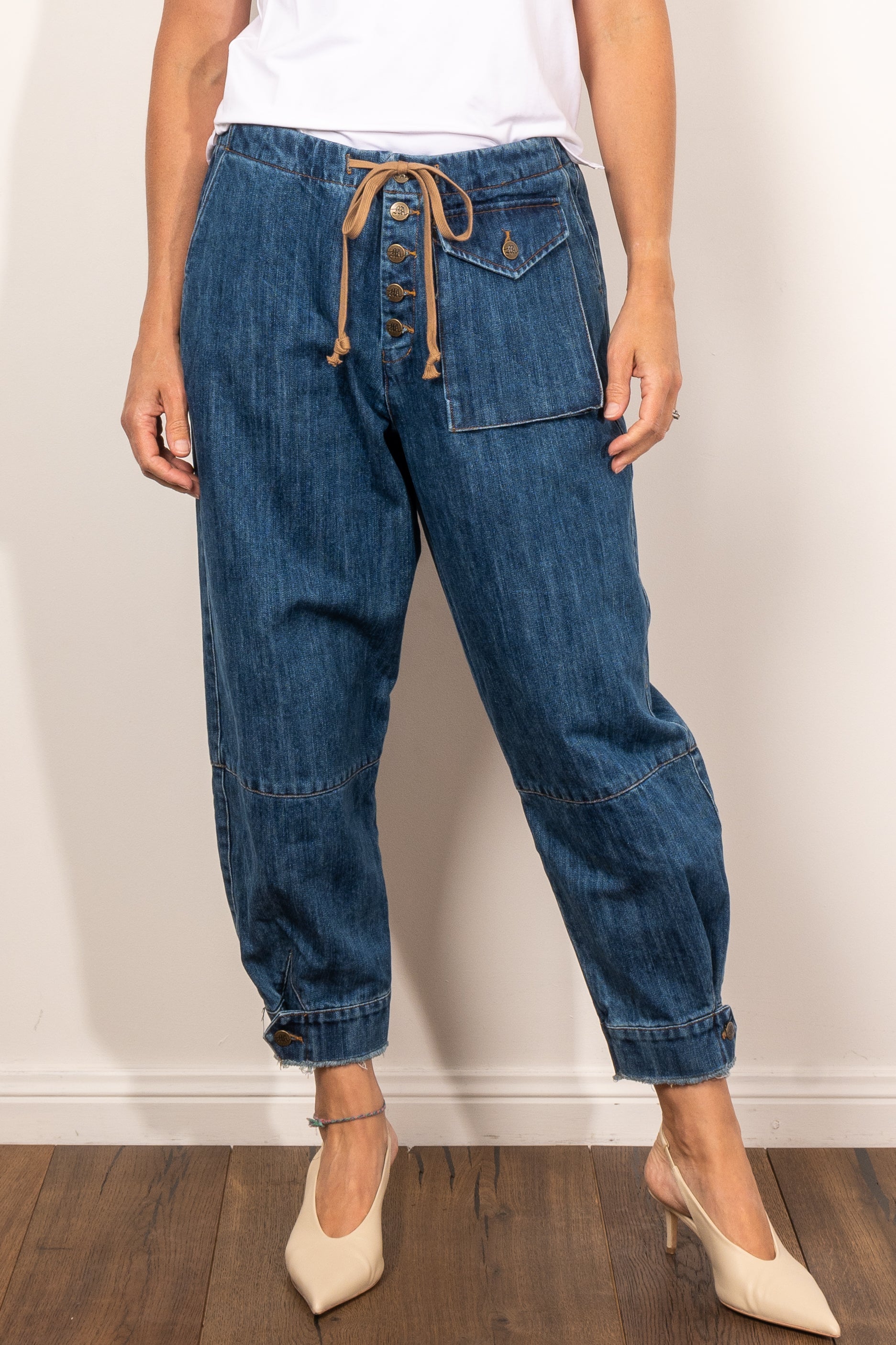 The M.A. Dainty Trucker Jean are a fashion-forward and edgy addition to any wardrobe. Featuring a tie-up drawstring, large cargo-style pockets, and a customisable tapered leg, these jeans also have a unique feature - the lower leg section can be zipped off to transform them into shorts. Elevate your style with these versatile and statement-making jeans!