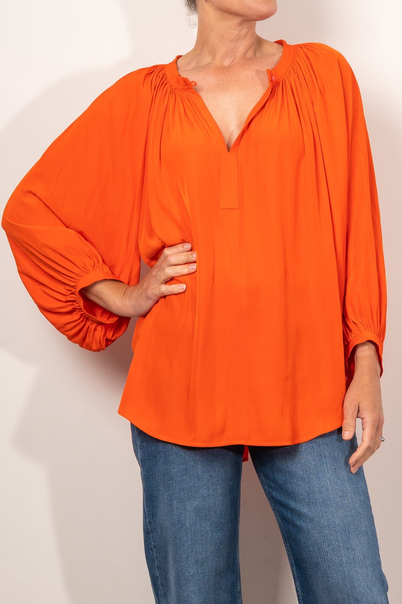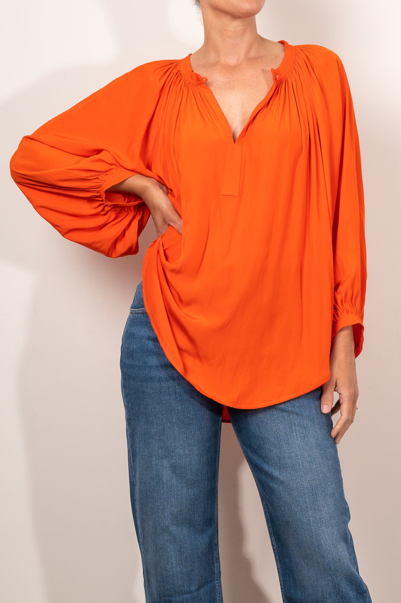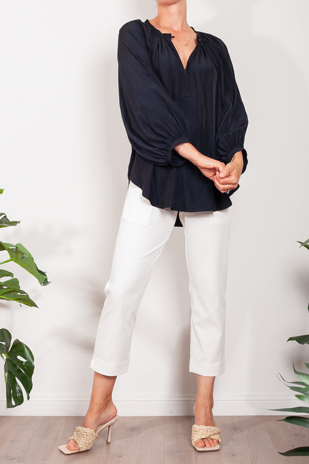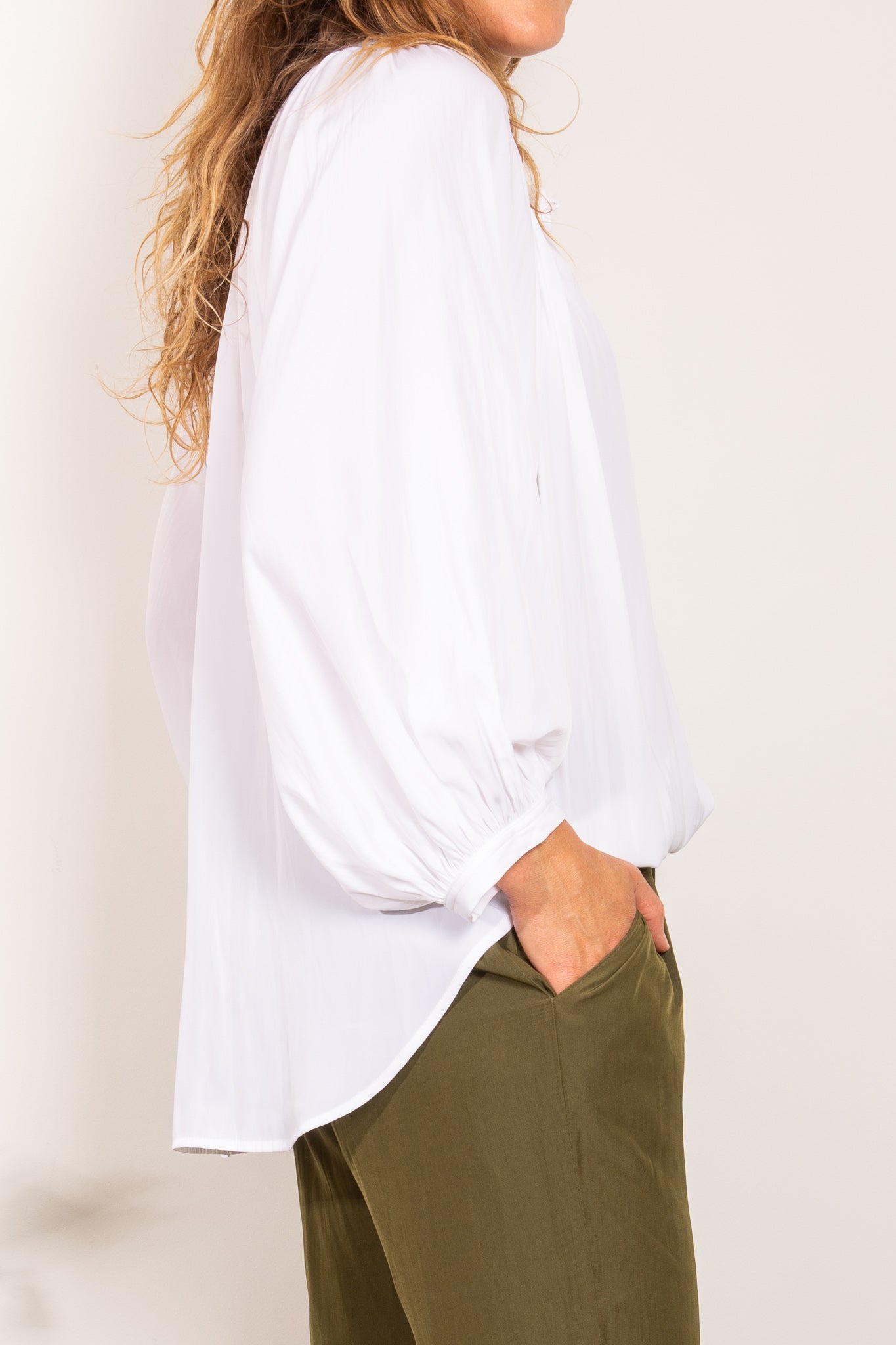 Made from Mela Purdie's exclusive Mache fabrication, the Escape Blouse is your perfect summer top, with a flattering neckline with option to wear open as V neck or single button up for a rounded finish. Gathering and fixed cuffs enhance the billowy shape of the sleeves, allowing you to have some fun with your styling.