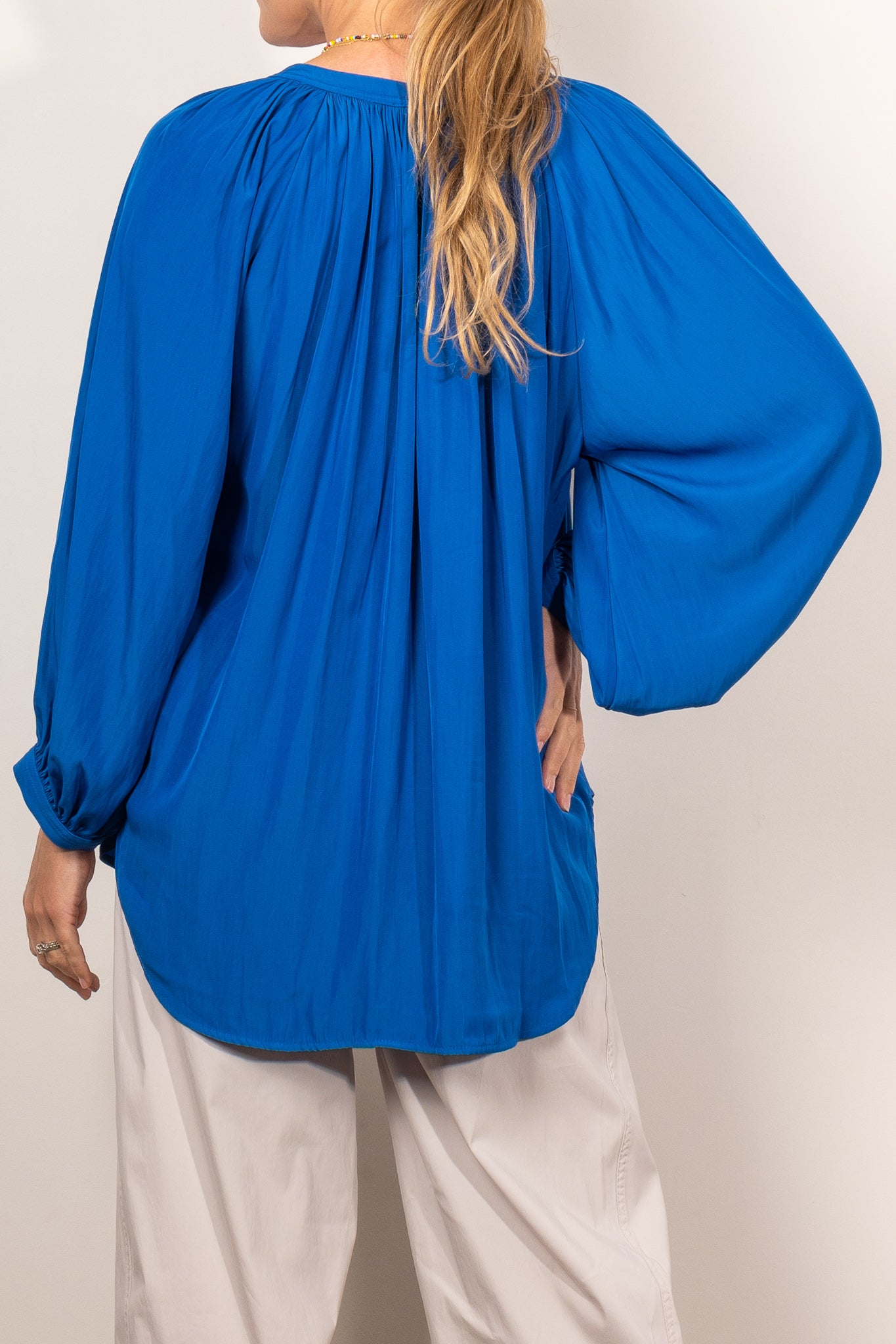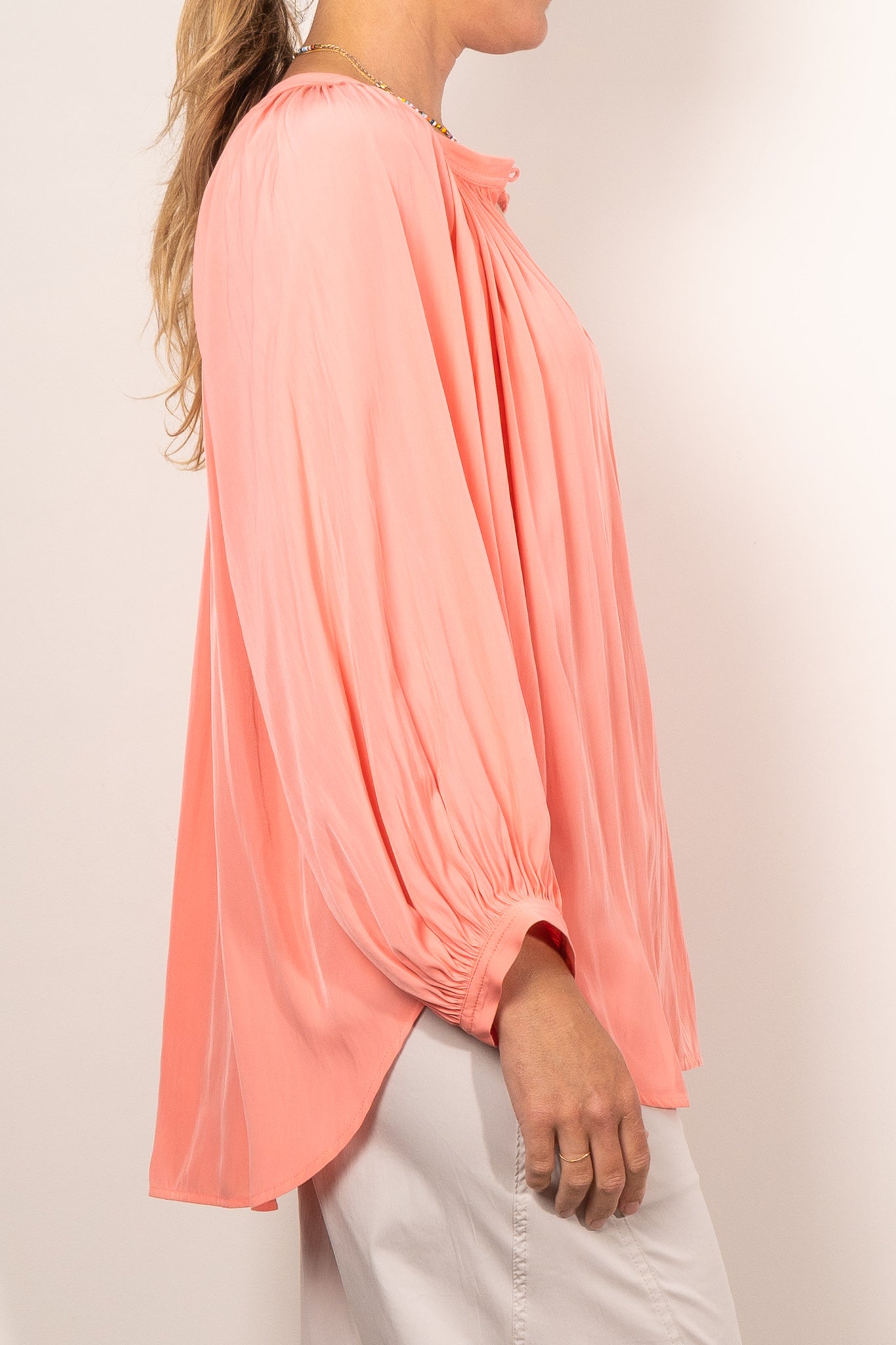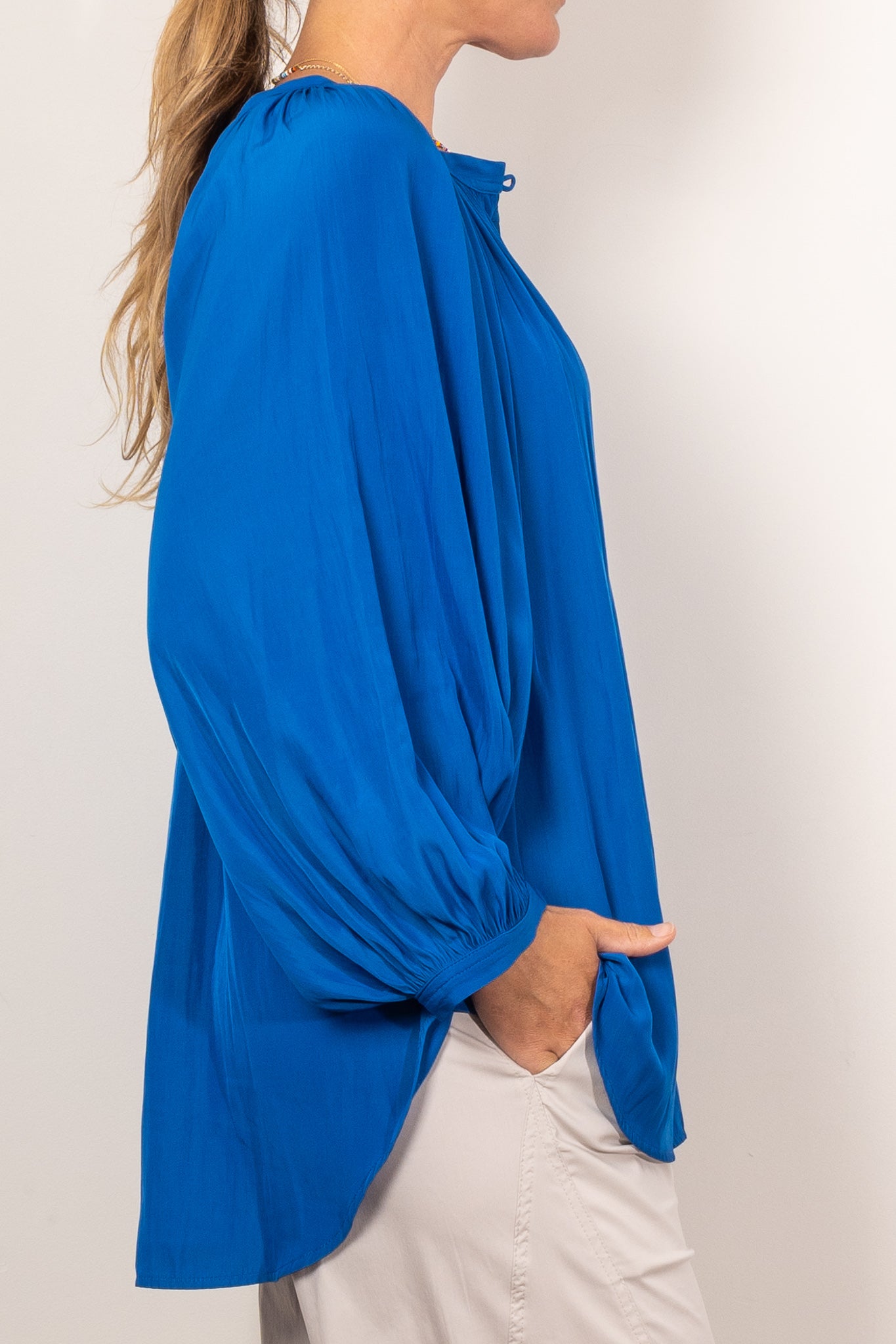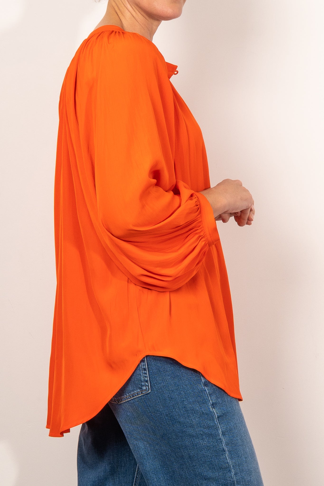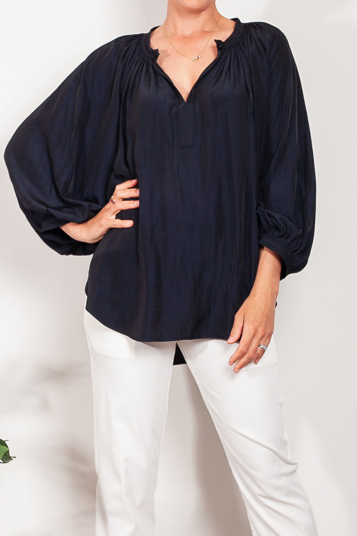 Made from Mela Purdie's exclusive Mache fabrication, the Escape Blouse is your perfect summer top, with a flattering neckline with option to wear open as V neck or single button up for a rounded finish. Gathering and fixed cuffs enhance the billowy shape of the sleeves, allowing you to have some fun with your styling.