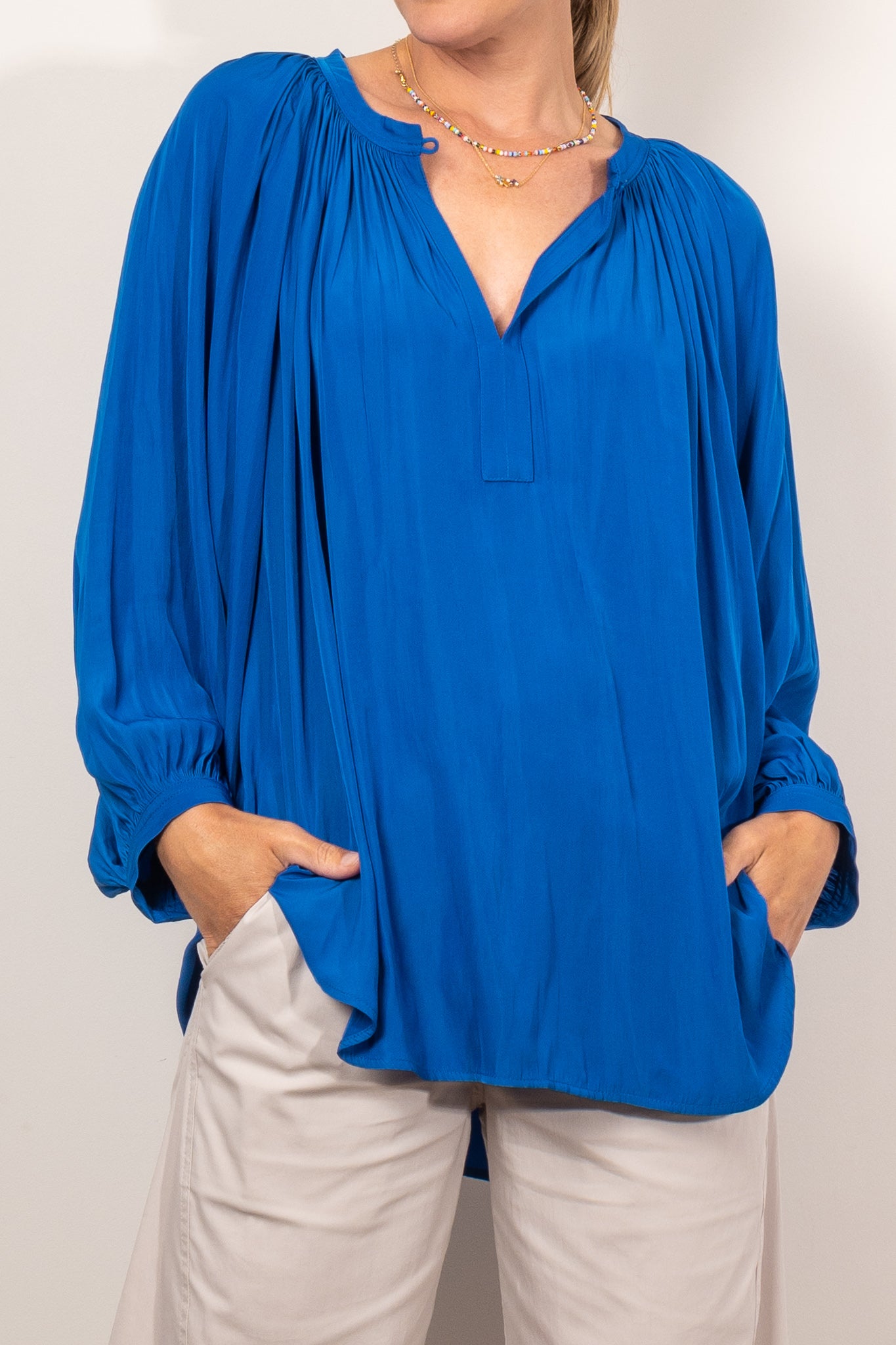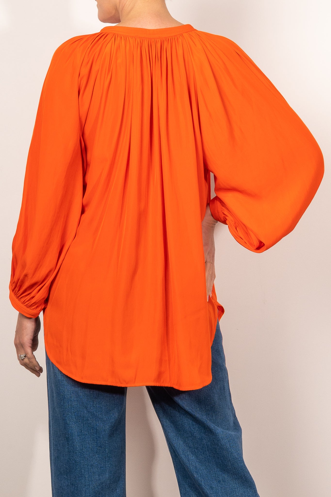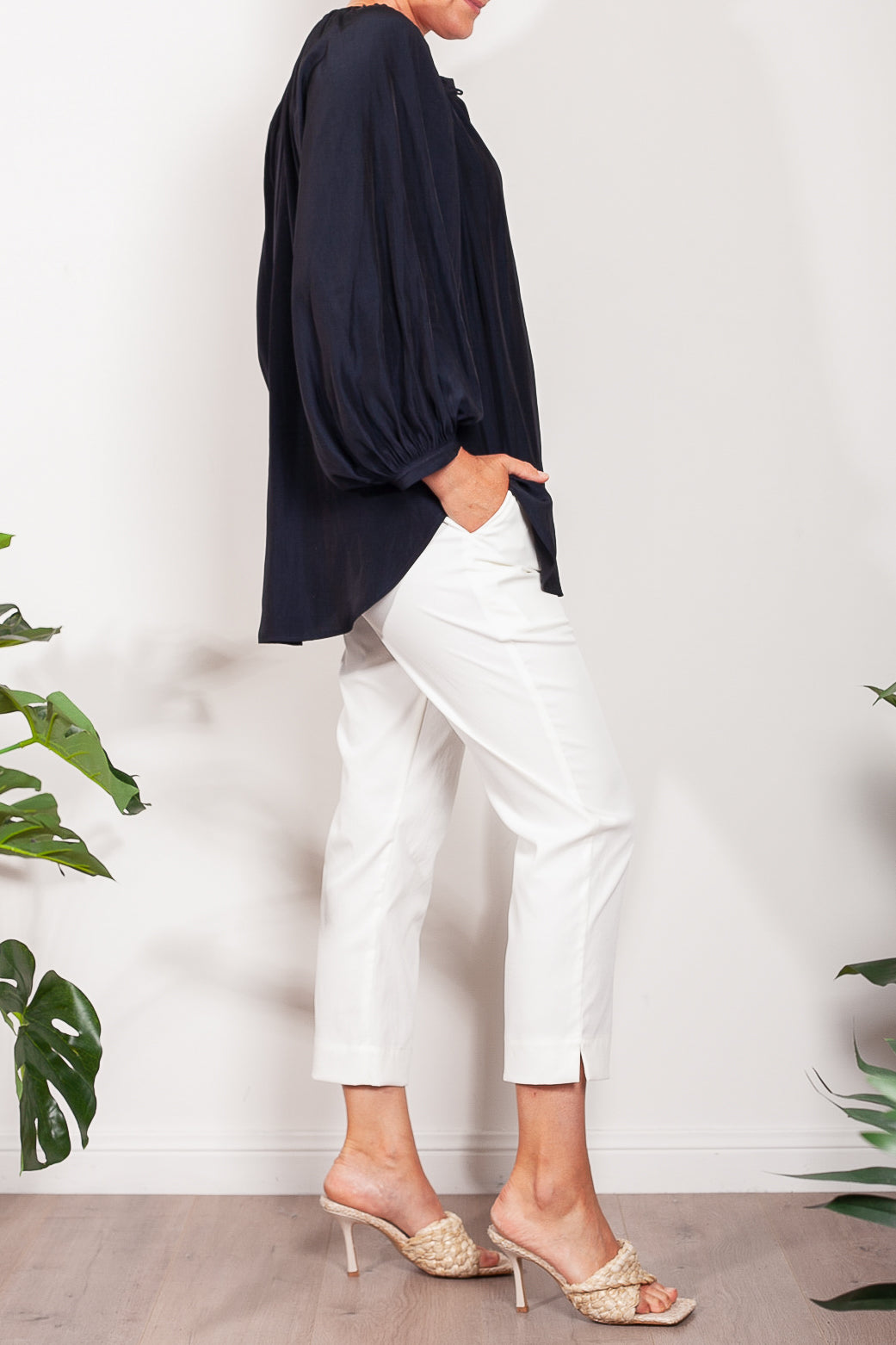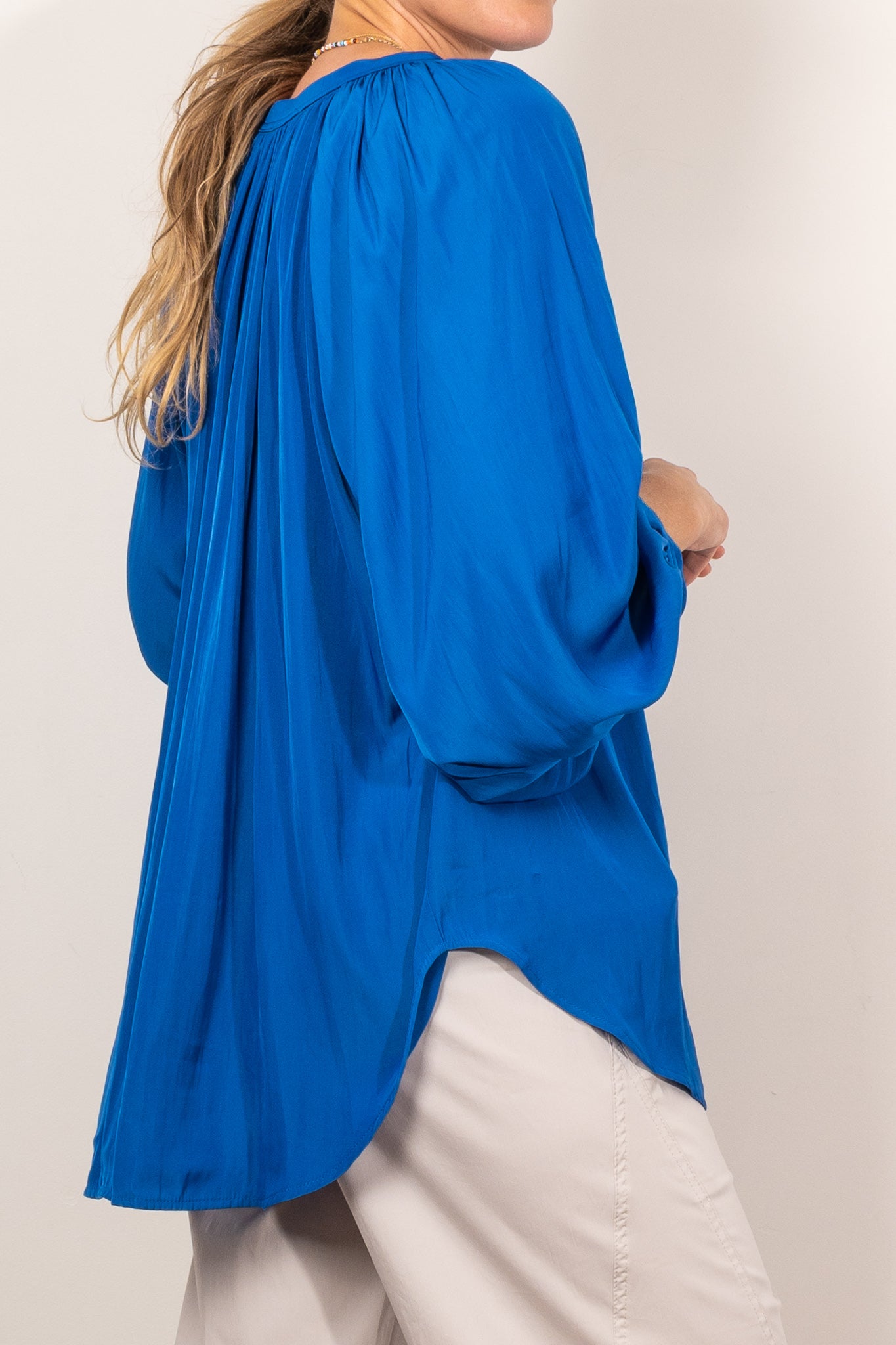 Made from Mela Purdie's exclusive Mache fabrication, the Escape Blouse is your perfect summer top, with a flattering neckline with option to wear open as V neck or single button up for a rounded finish. Gathering and fixed cuffs enhance the billowy shape of the sleeves, allowing you to have some fun with your styling.