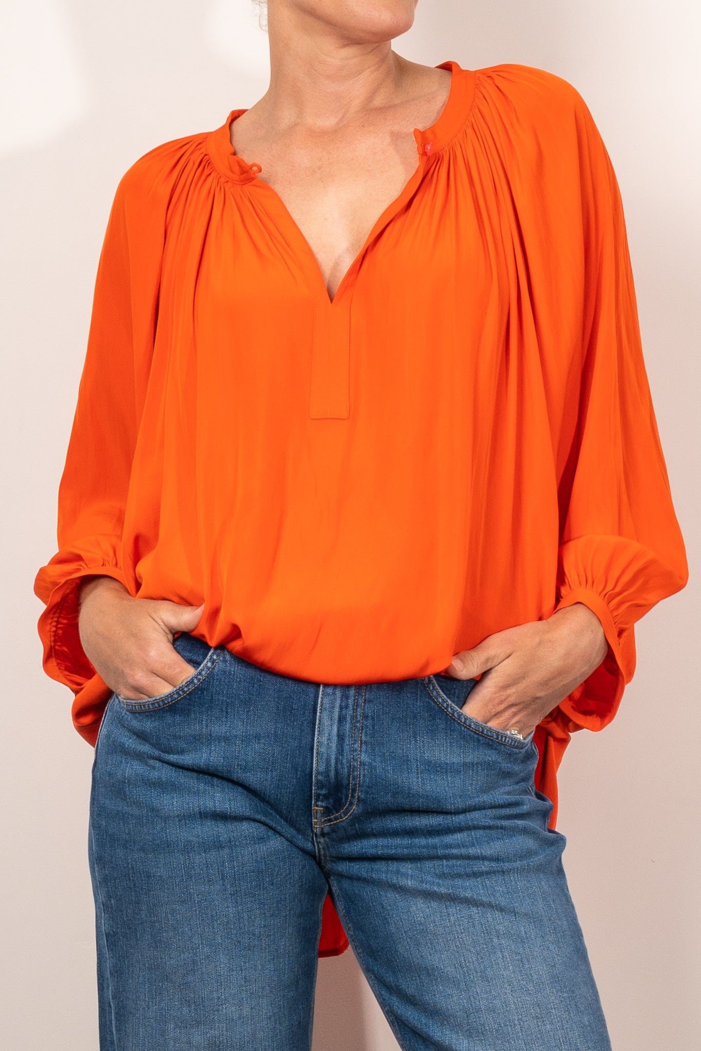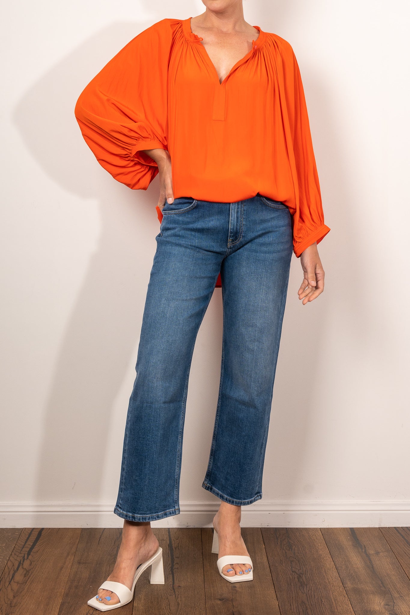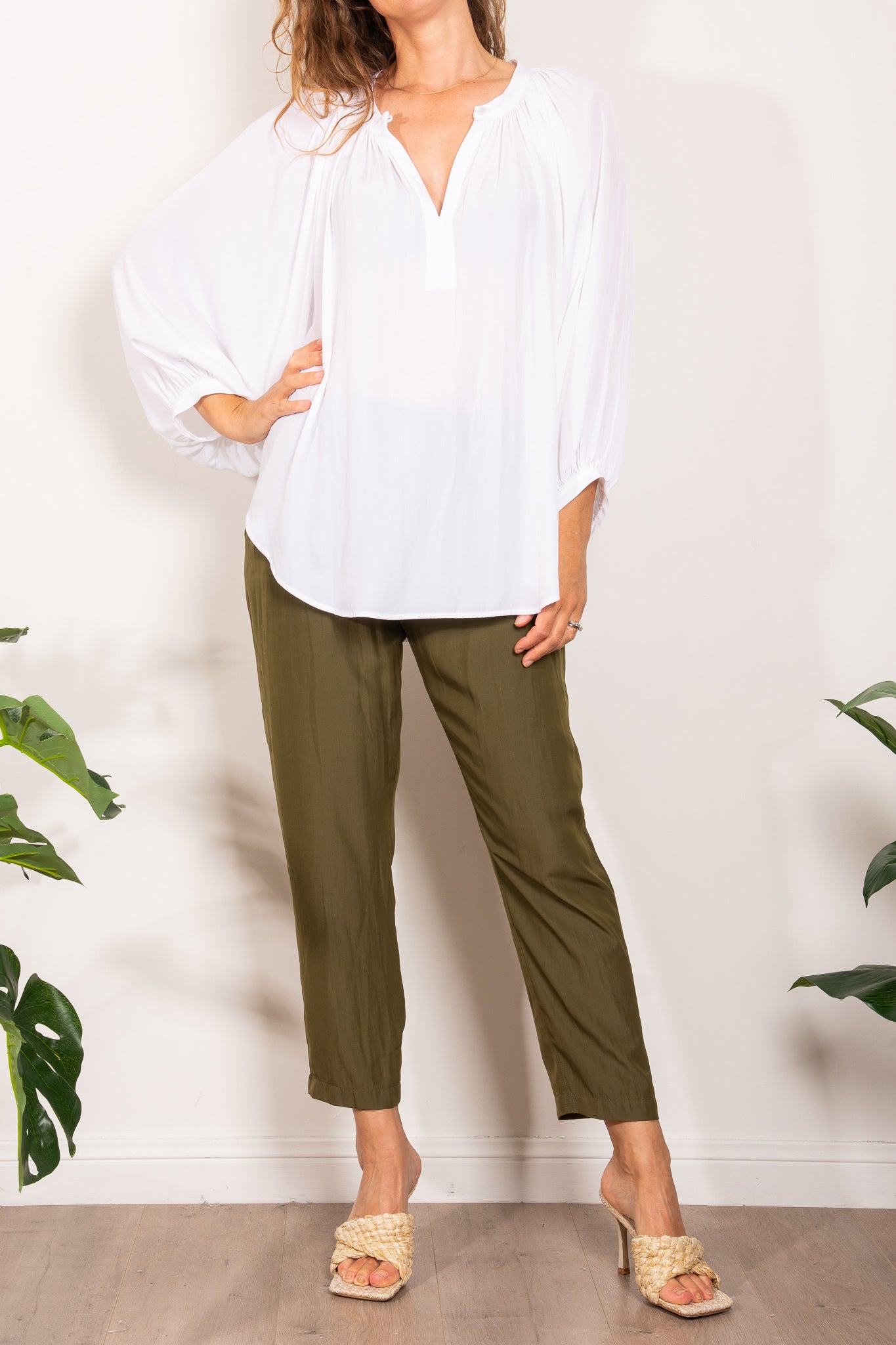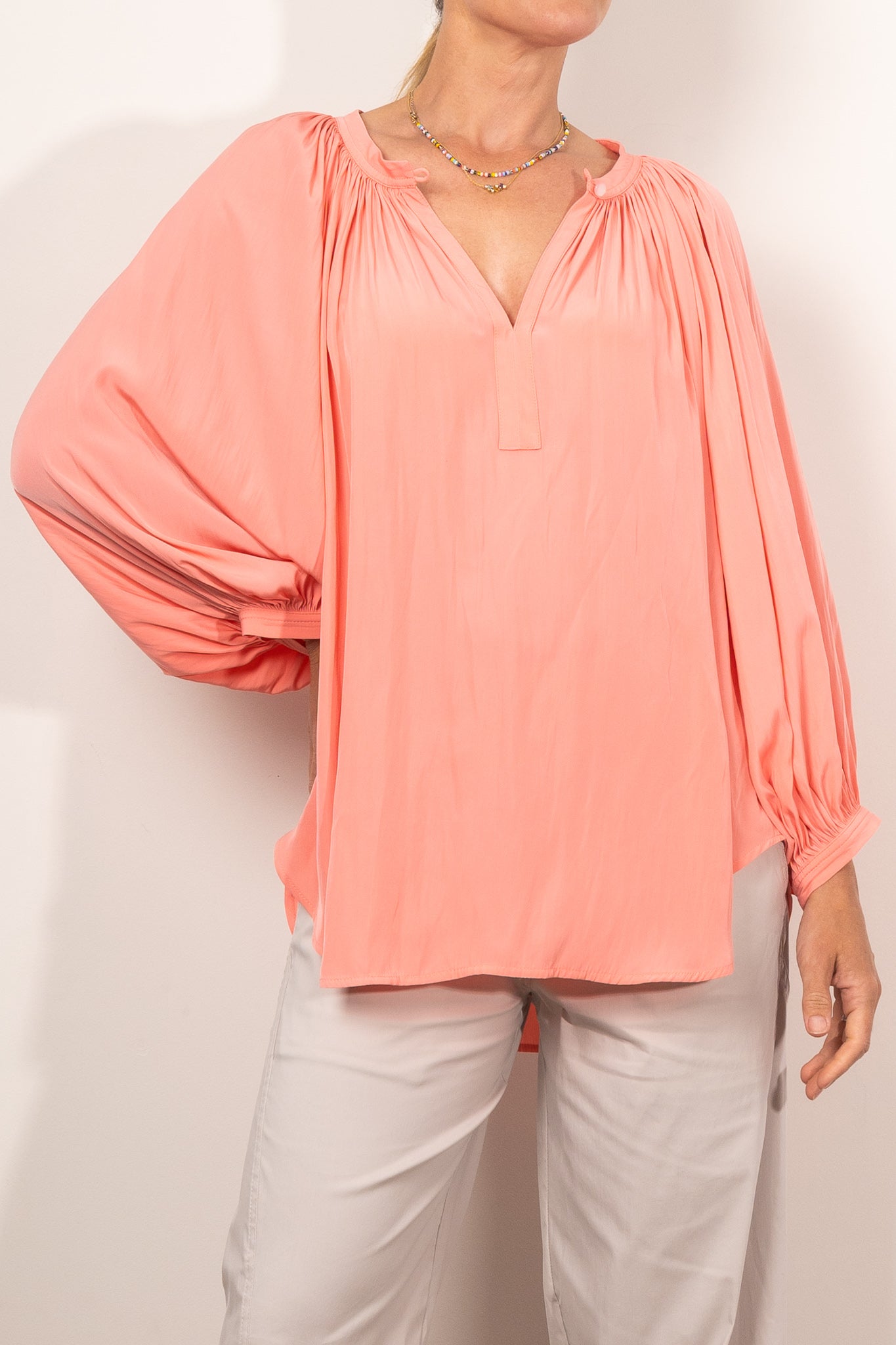 Made from Mela Purdie's exclusive Mache fabrication, the Escape Blouse is your perfect summer top, with a flattering neckline with option to wear open as V neck or single button up for a rounded finish. Gathering and fixed cuffs enhance the billowy shape of the sleeves, allowing you to have some fun with your styling.