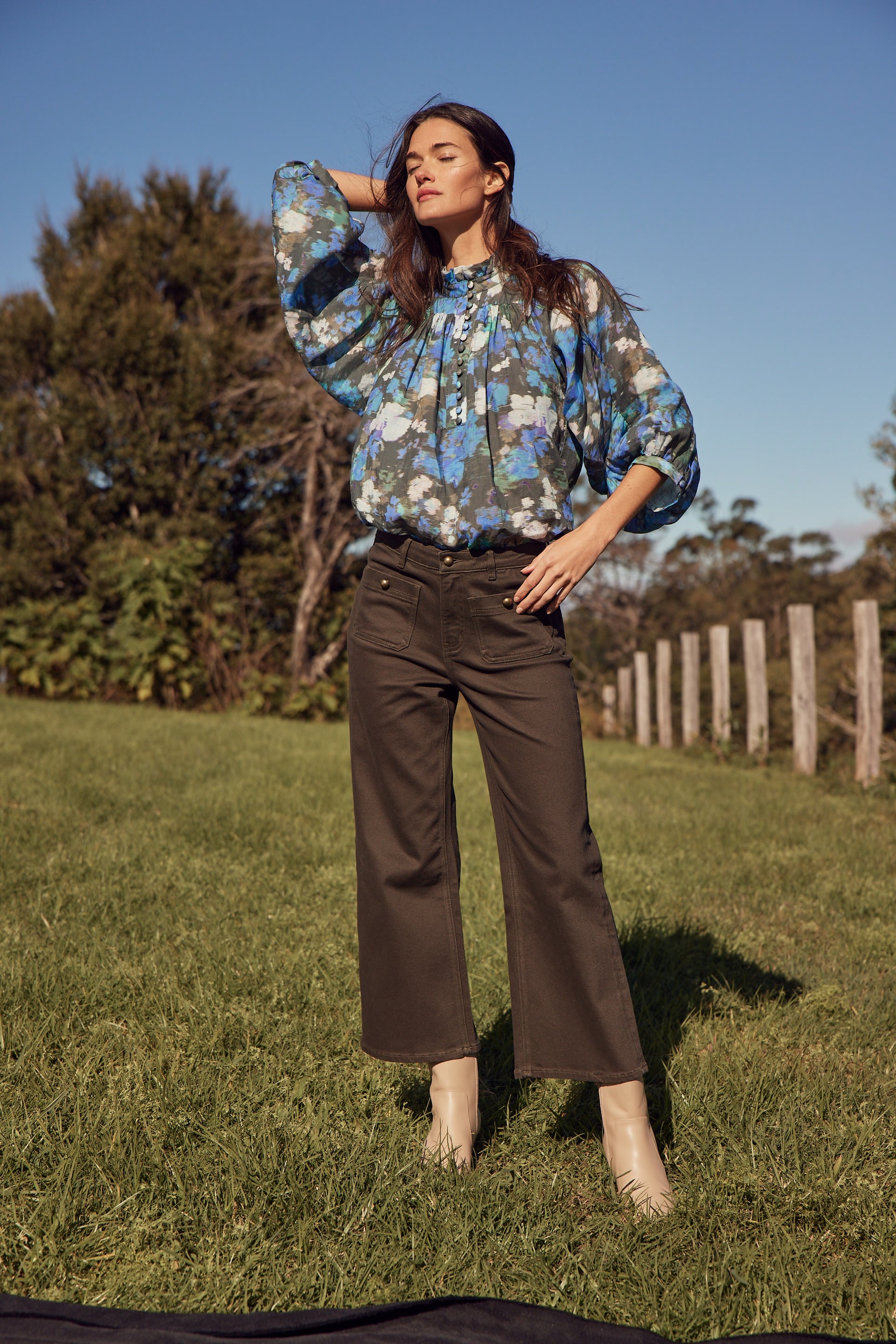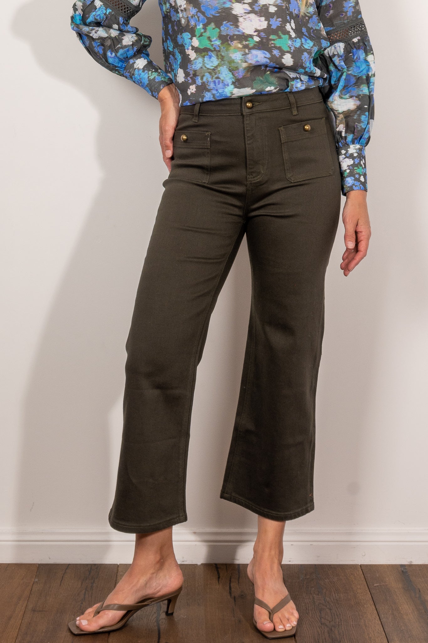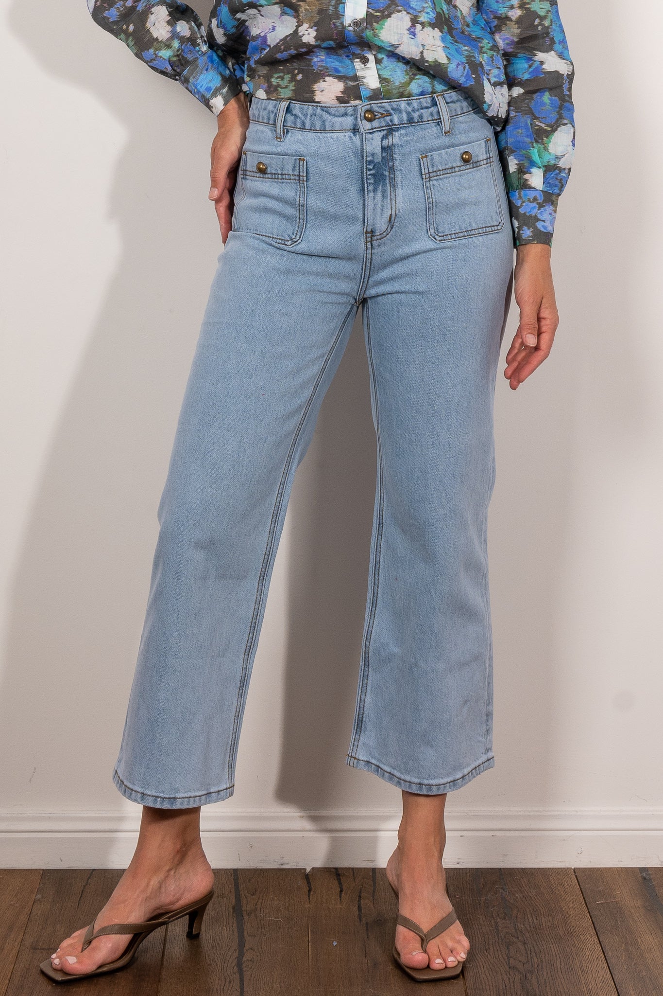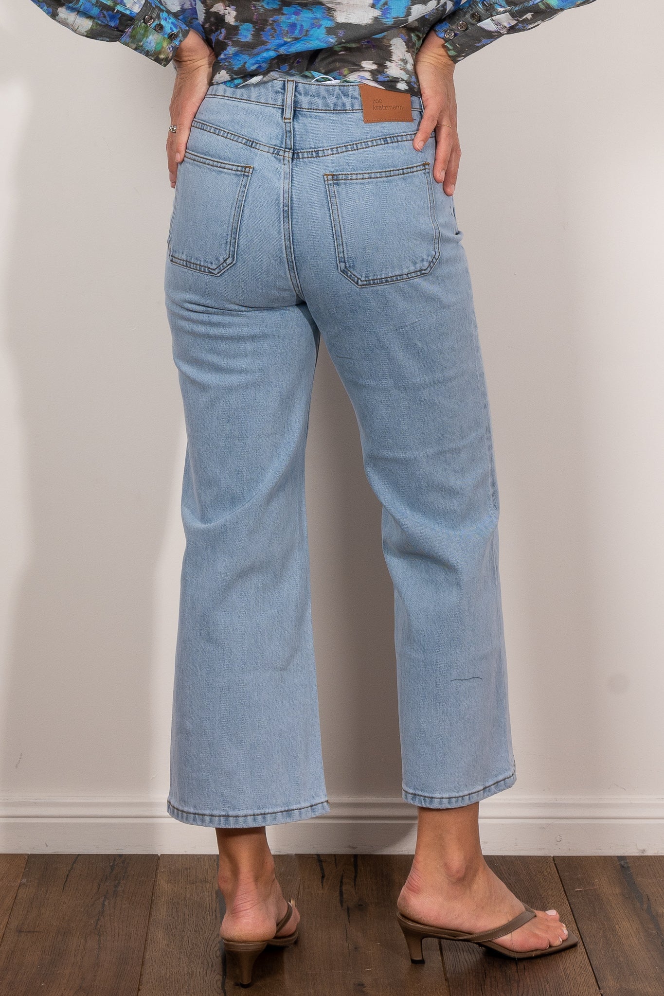Transform your wardrobe with the Zoe Kratzmann Surrender Jean. These high-waisted, wide-leg jeans exude vintage vibes with a modern twist. The cropped length and curved front pockets with brass buttons add personality and style. Plus, the touch of elastane offers a comfortable fit while maintaining its structured silhouette.