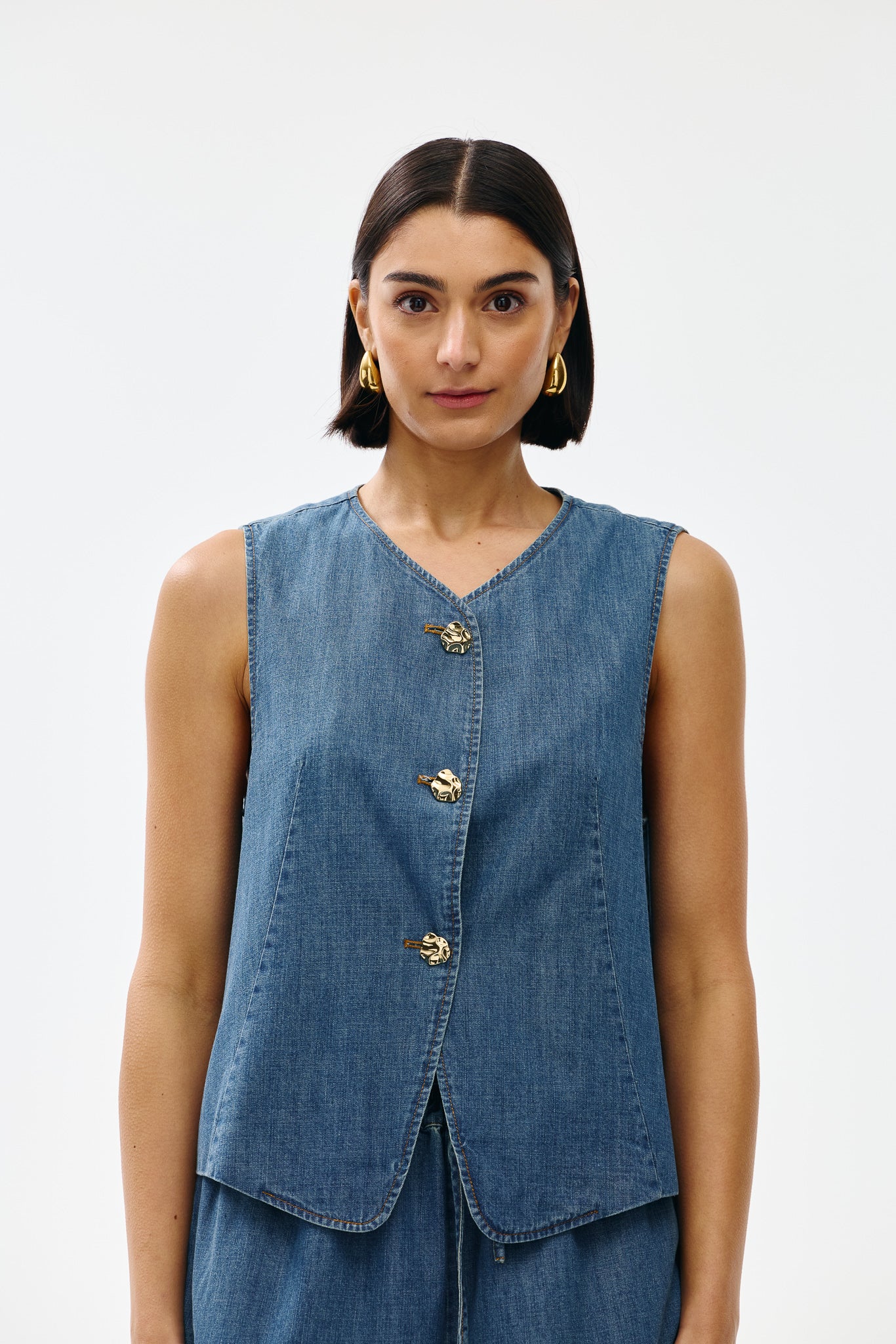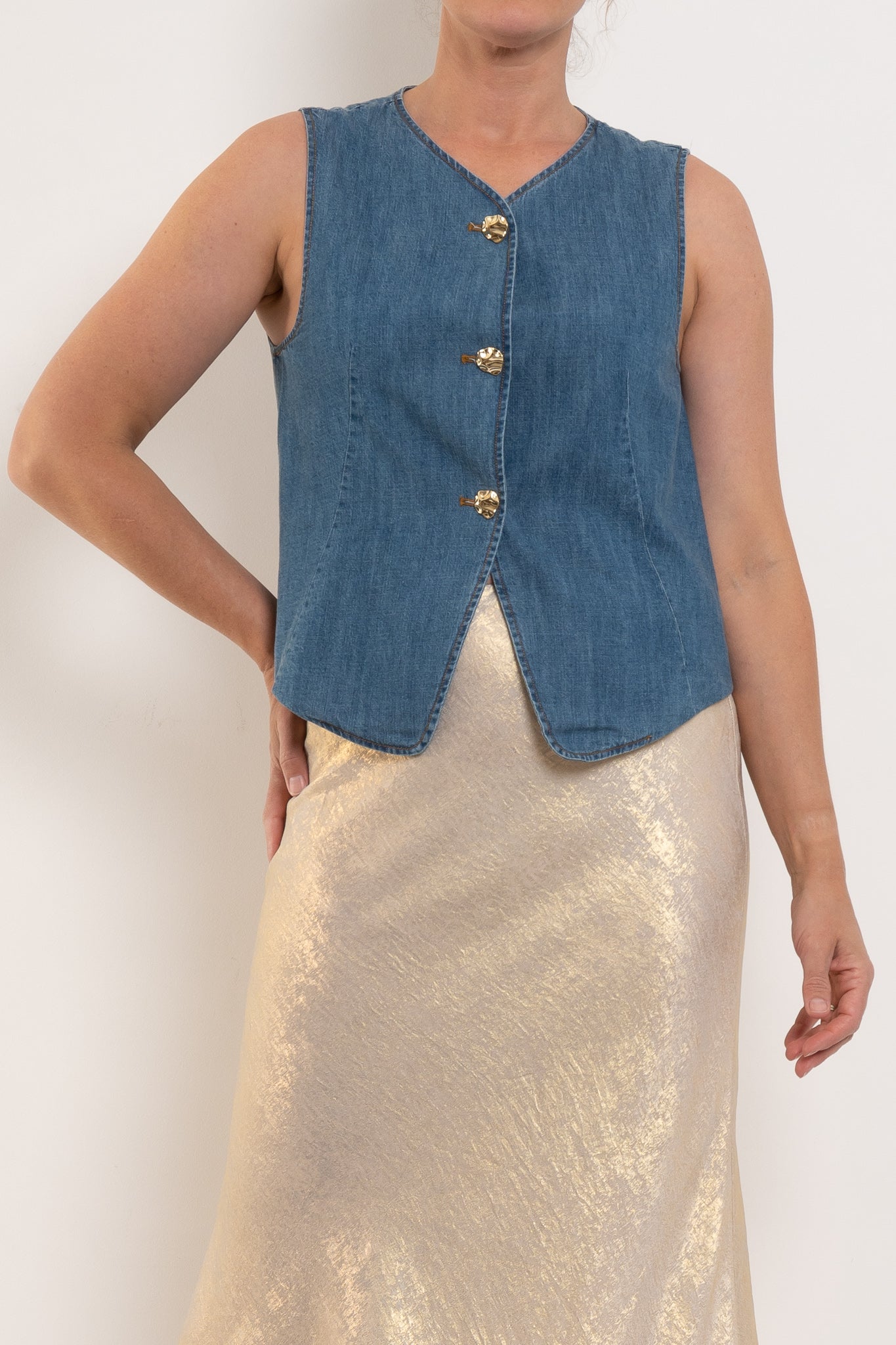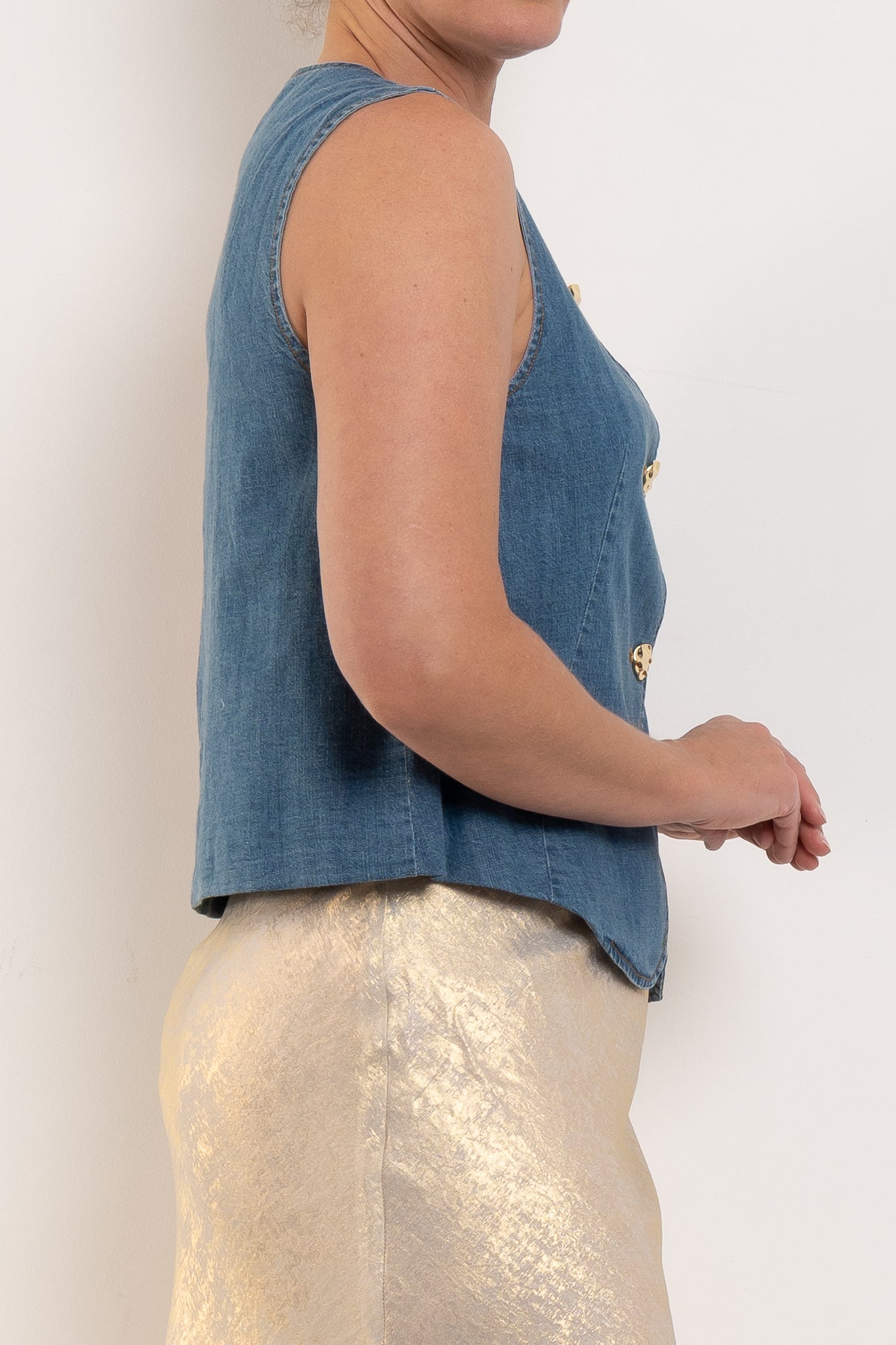 Crafted from soft, lightweight 100% cotton denim, Camille balances a clean V-neckline with a relaxed, sleeveless silhouette. The gold-toned buttons lend subtle polish, making this an easy piece to dress up or down - layered over shirting, paired with wide-leg pants, or worn solo for warm days.