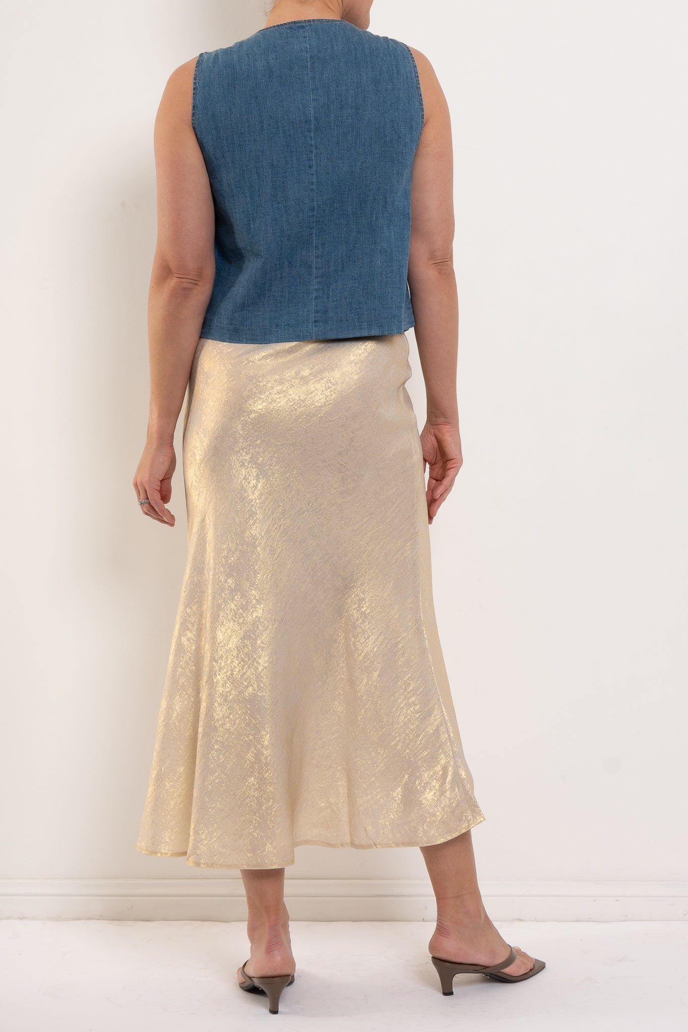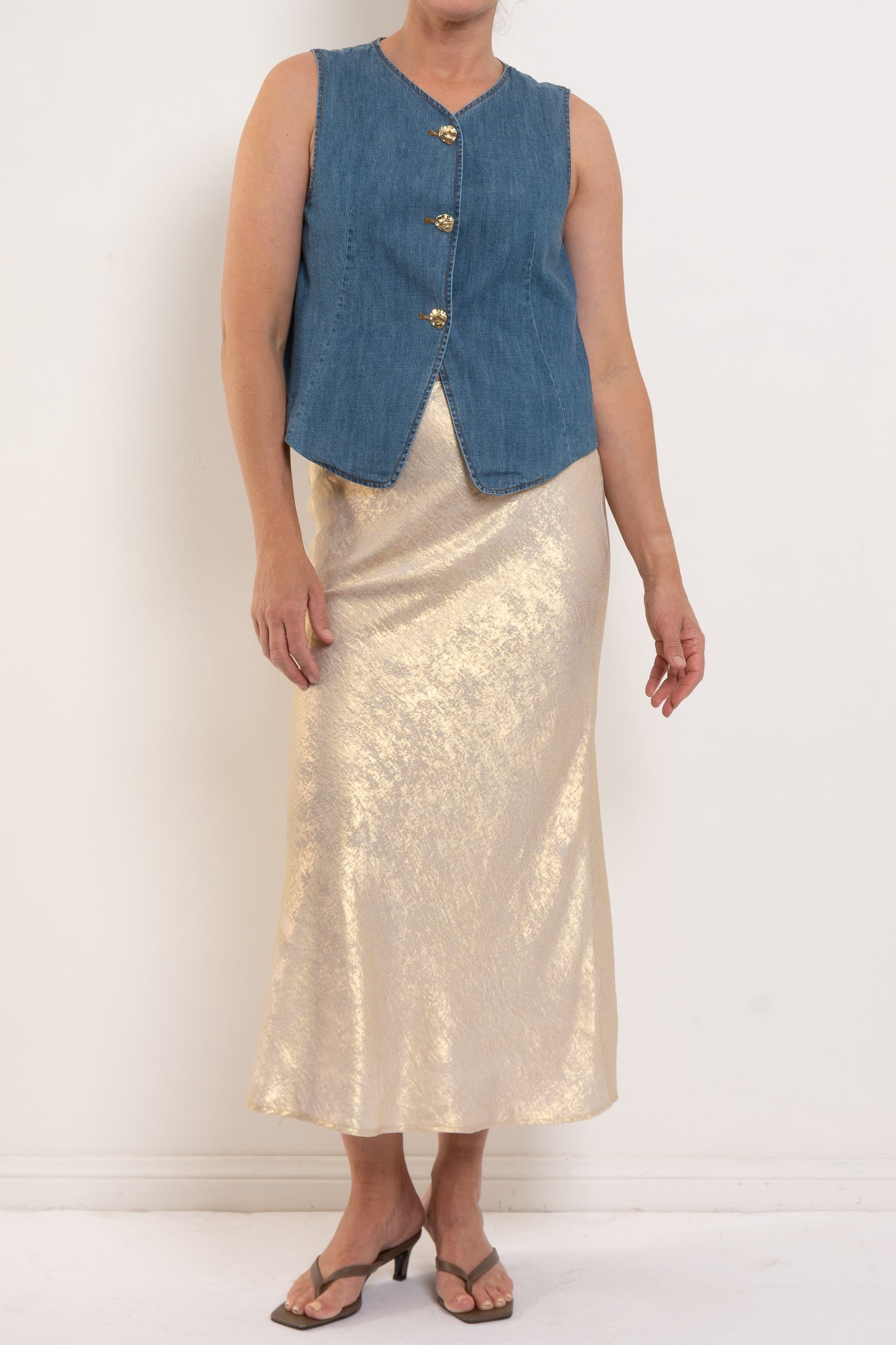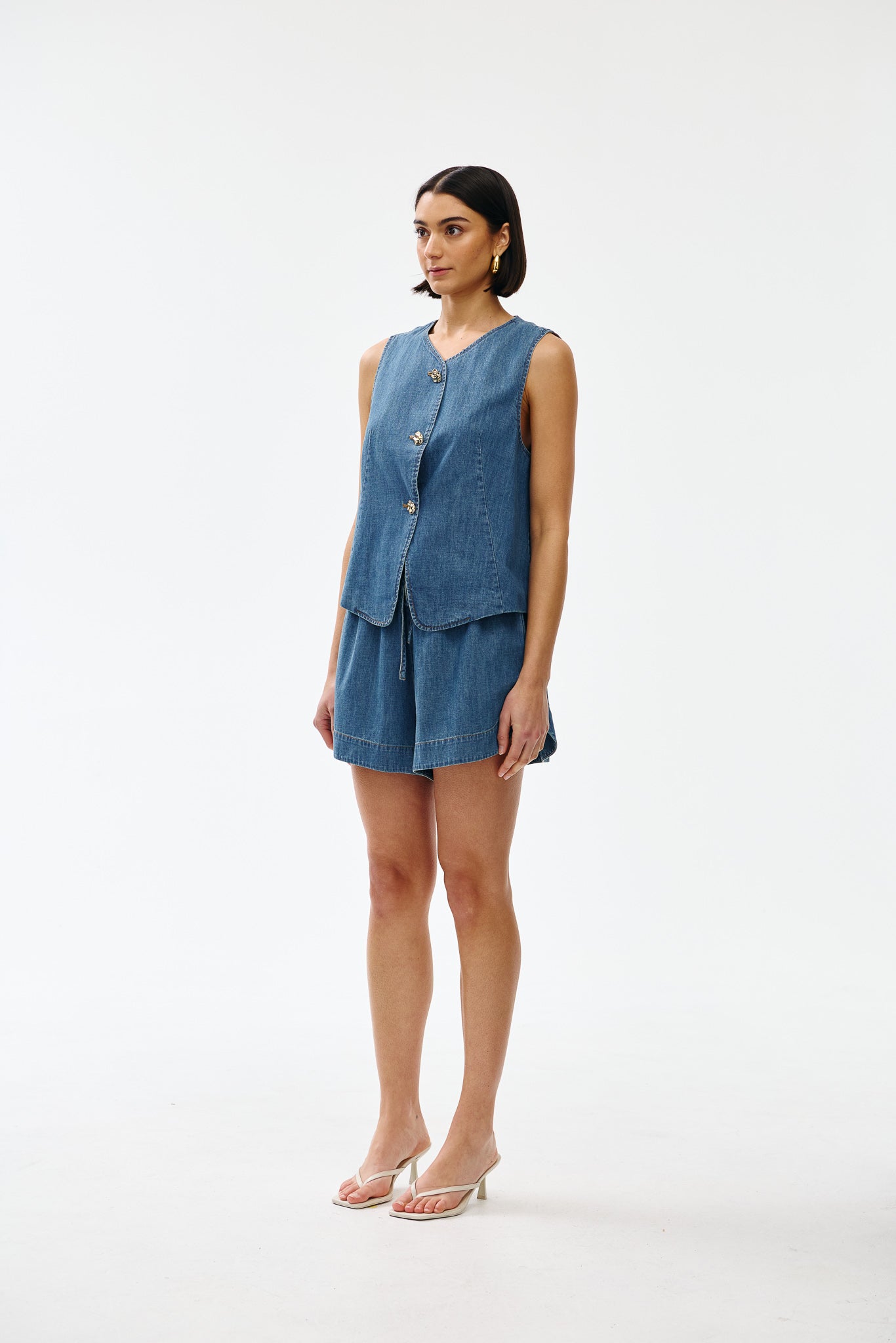 Crafted from soft, lightweight 100% cotton denim, Camille balances a clean V-neckline with a relaxed, sleeveless silhouette. The gold-toned buttons lend subtle polish, making this an easy piece to dress up or down - layered over shirting, paired with wide-leg pants, or worn solo for warm days.