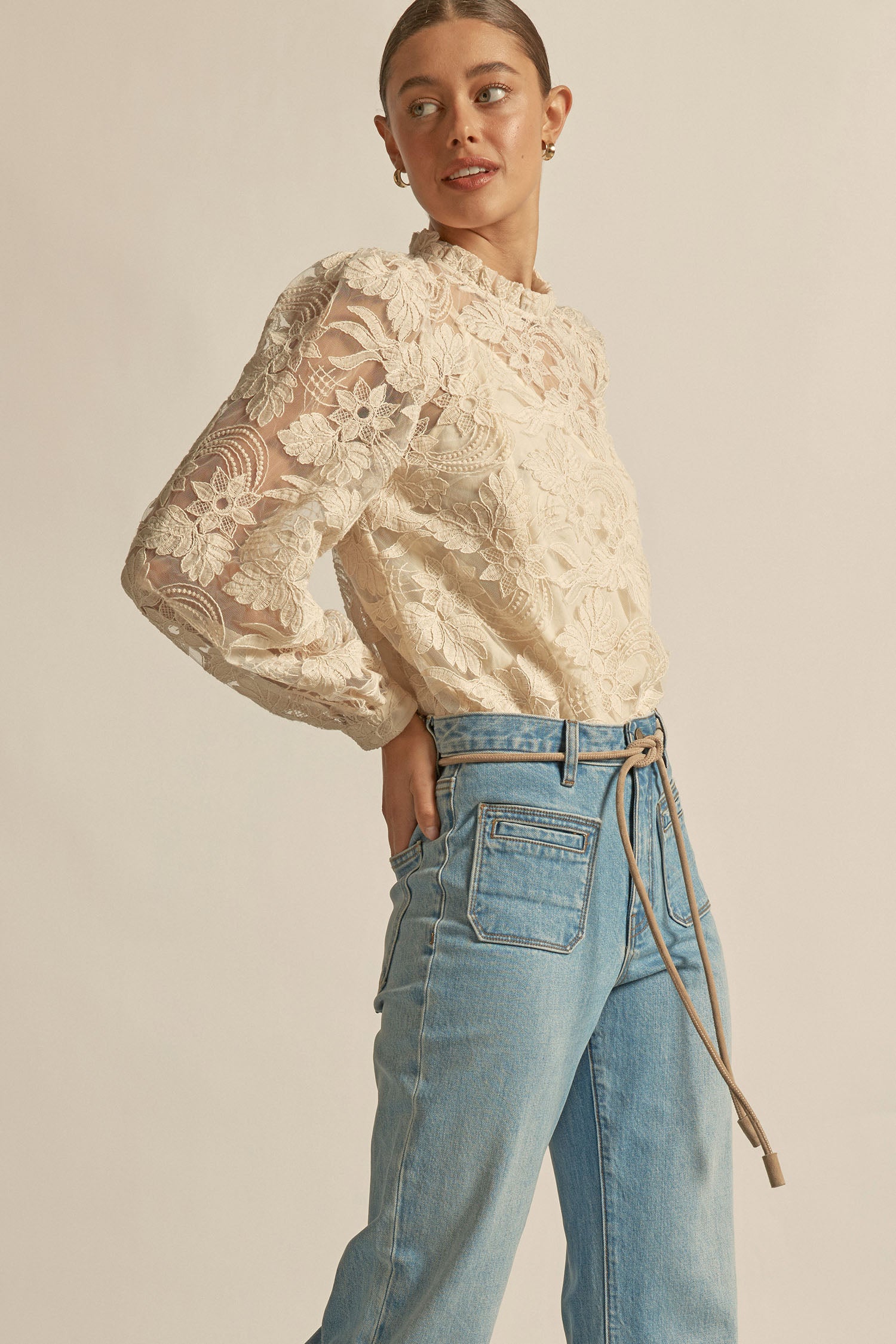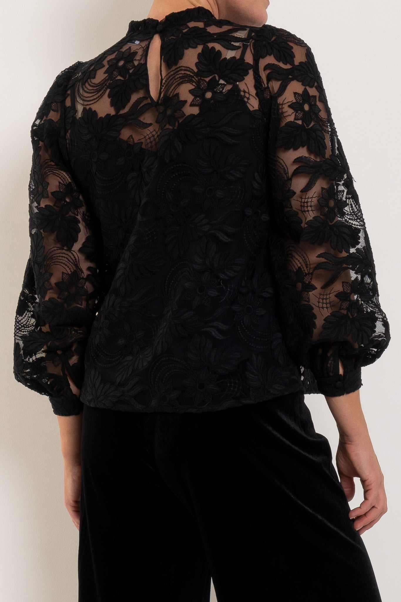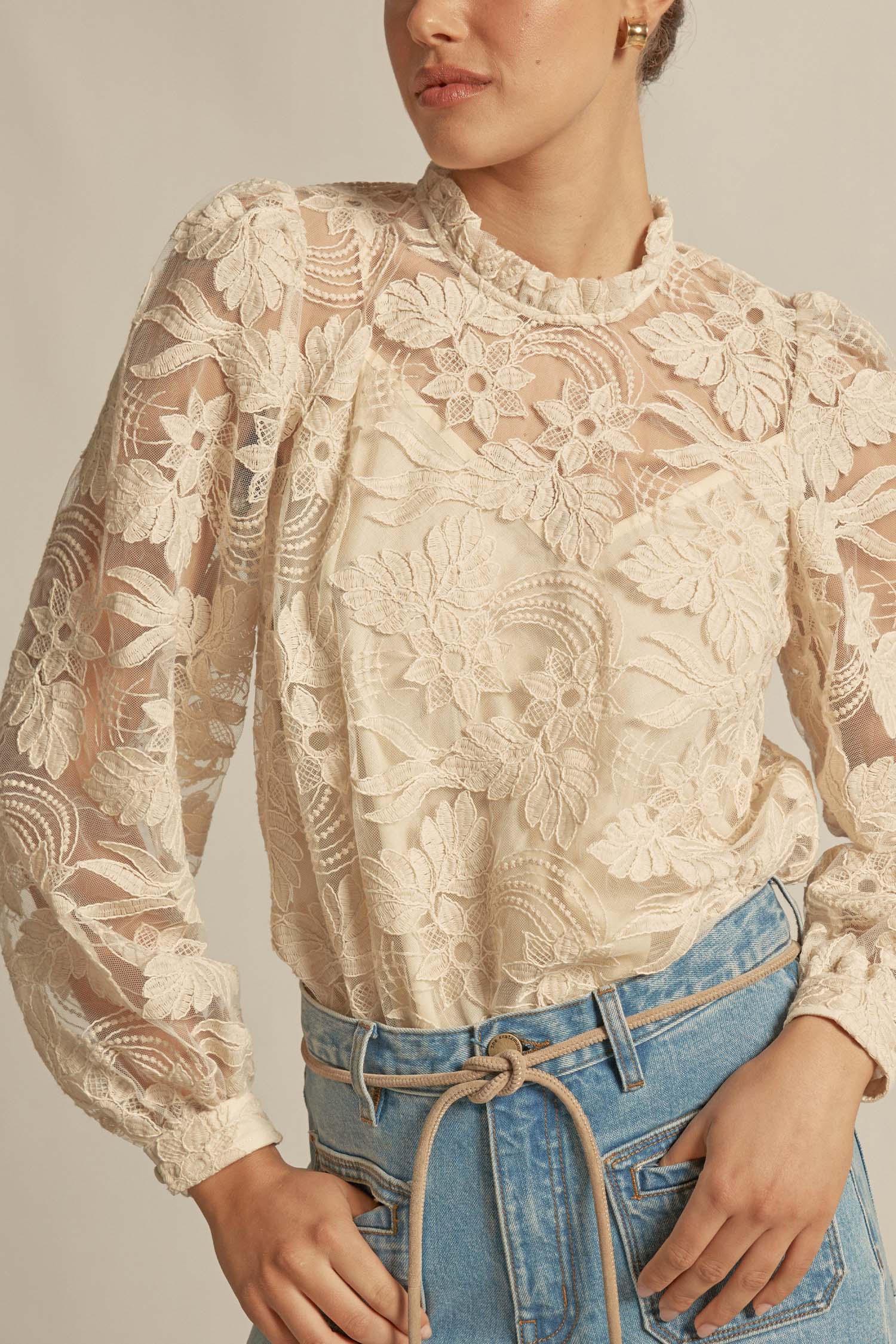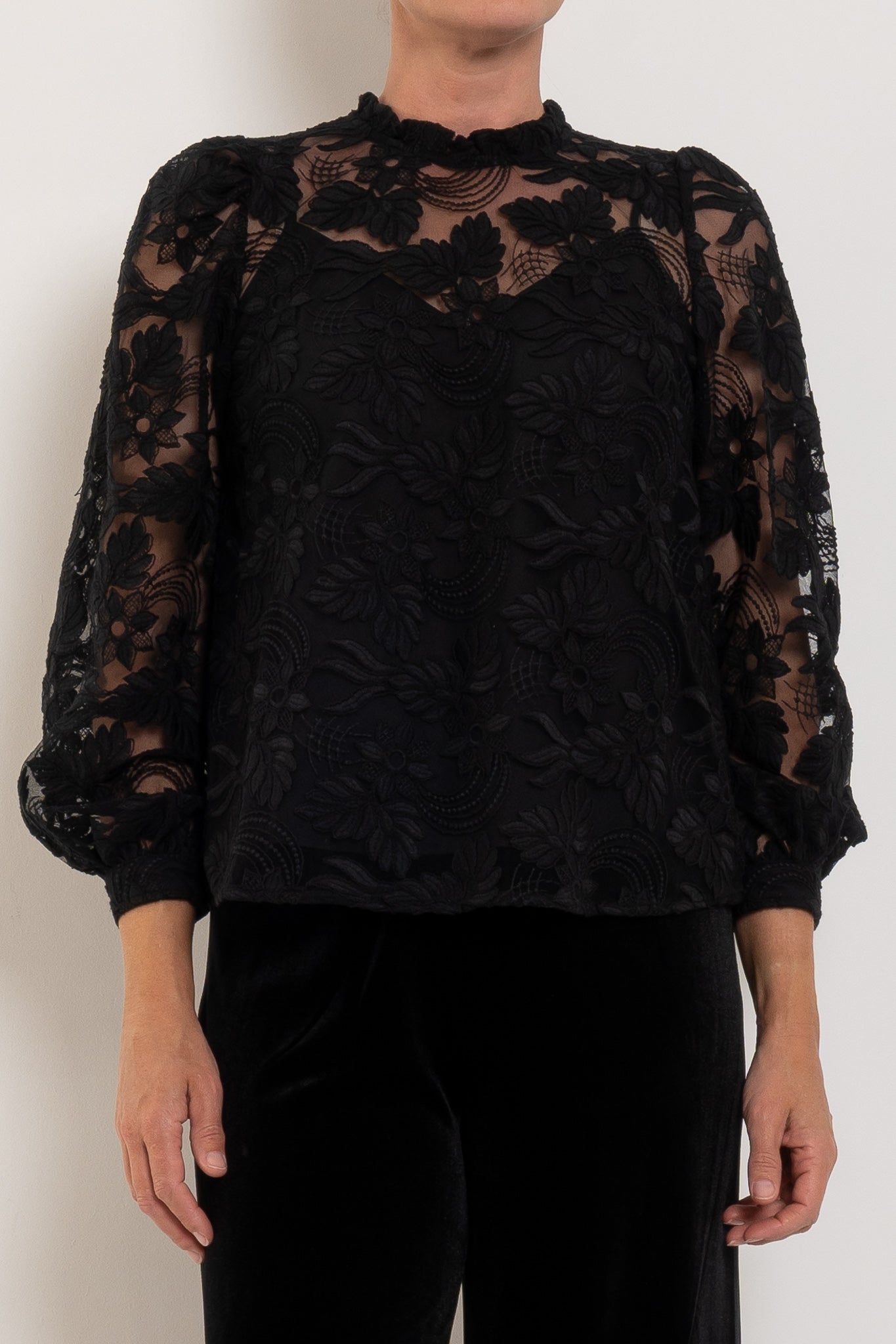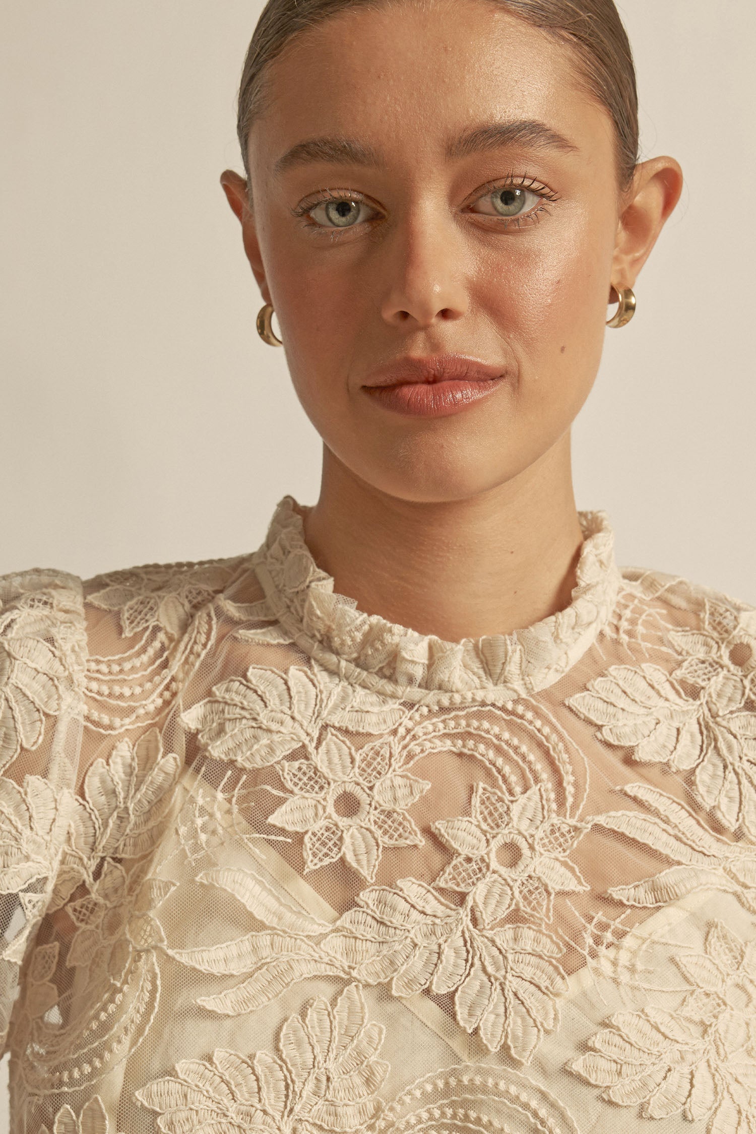 Crafted in an intricate poly-lace fabrication, the Glint Top by Zoe Kratzmann blends femininity with modern polish. The softly gathered shoulders create subtle shape through the sleeve, while full-length sleeves finish in a delicate frill, echoed at the neckline for cohesion. A round neckline balances the texture of the lace, keeping the silhouette refined rather than fussy. Complete with a colour-matched cotton cami for coverage, this is a beautifully elevated piece designed for evening moments, yet versatile enough to pair back with denim or tailored trousers for a confident day-to-night transition.