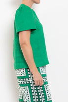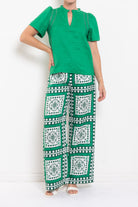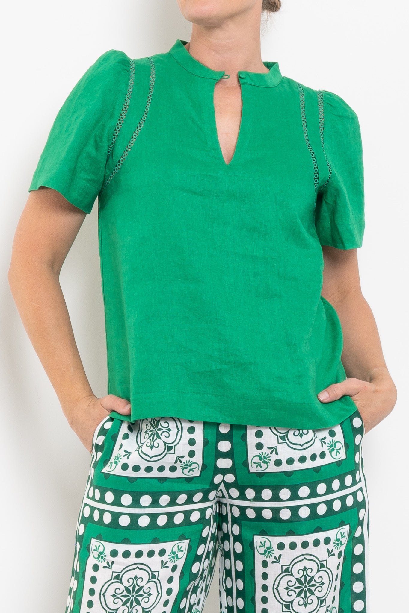 Crafted from 100% linen in a striking parrot green, the Recollect Top is designed to feel both polished and easy to wear. Circular lace details and softly gathered tulip sleeves add just enough romantic detail, while the neat silhouette keeps it modern. Equally at home with denim for a casual outing or styled with tailored pants for an elevated edge, it’s a piece that adapts beautifully to your day.