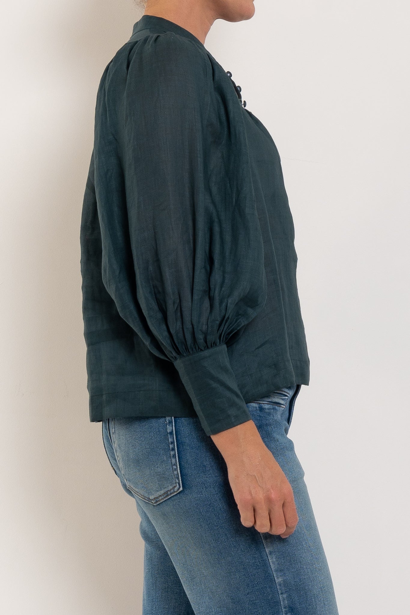 The Vista Top by Zoe Kratzmann is designed for the shift into cooler seasons, balancing fluidity with sculptural detail. Crafted from breathable 100% ramie, it features blouson sleeves that gather into a deep cuff for shape and drama, while a subtle mandarin collar and delicate front detailing offer a refined finish. The front and back yoke with soft gathers creates movement without bulk, making it the perfect partner to tailored trousers, denim or sleek skirts for a confident, polished silhouette.