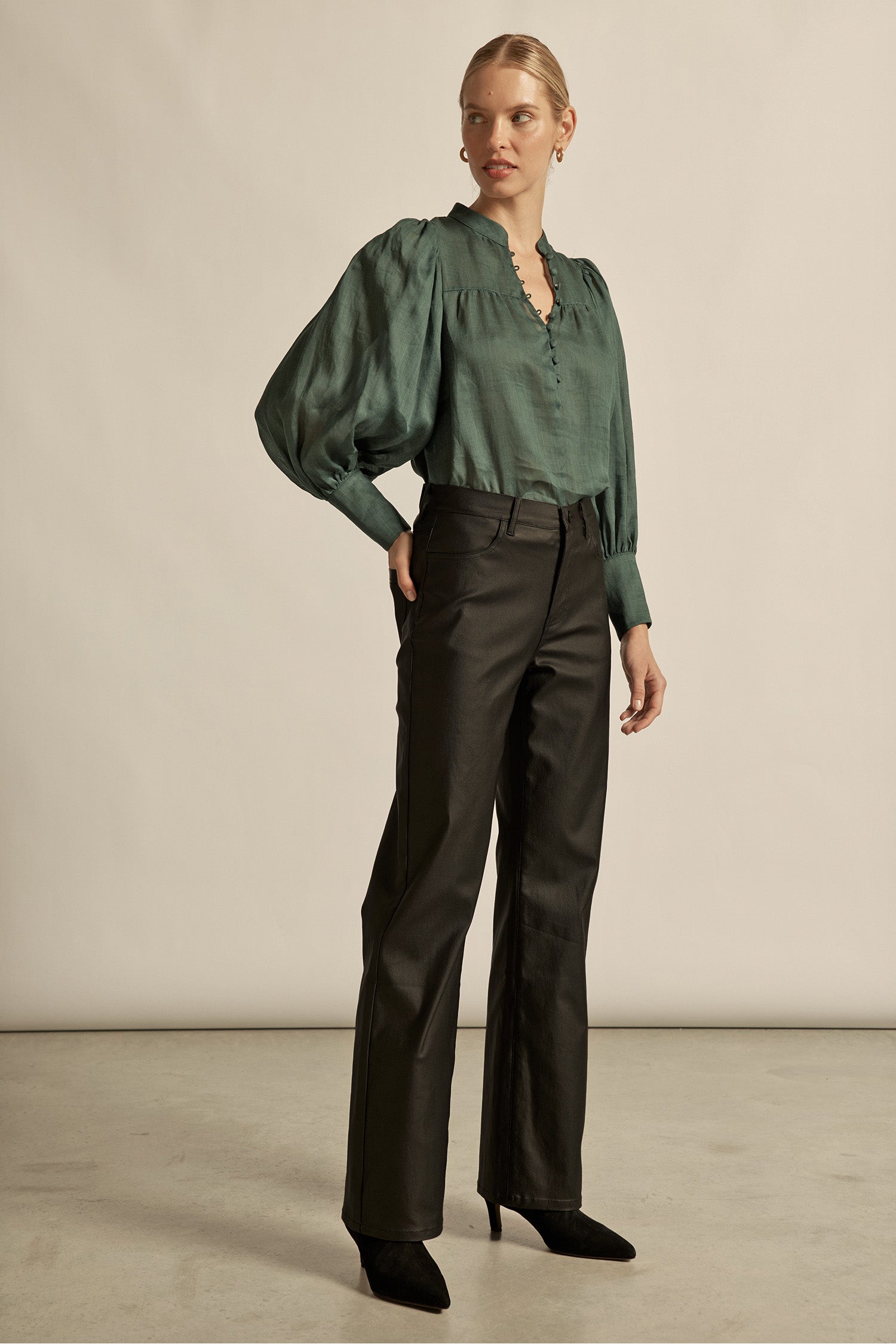 - Blouson sleeves with deep cuffs for sculptural shape