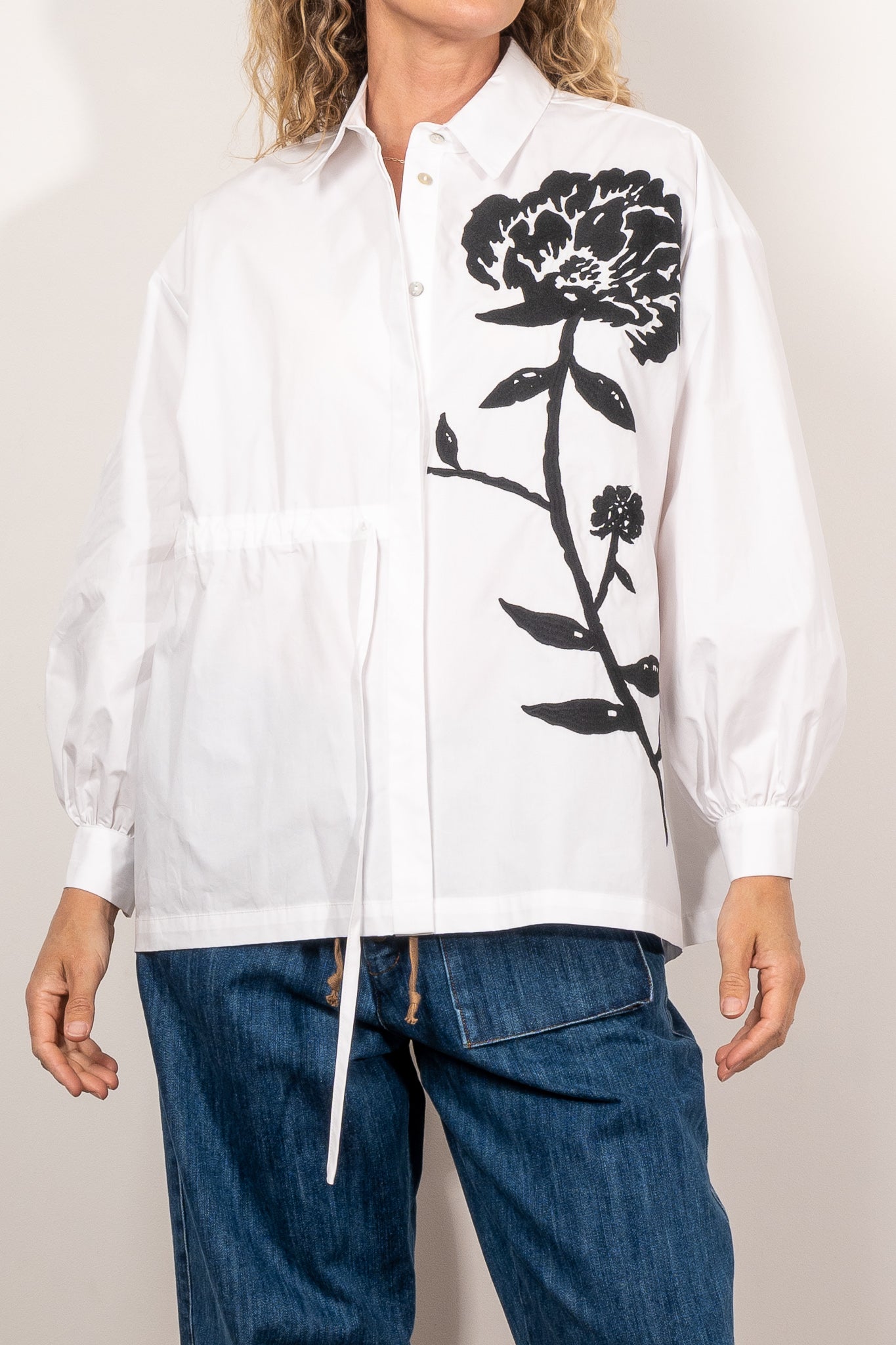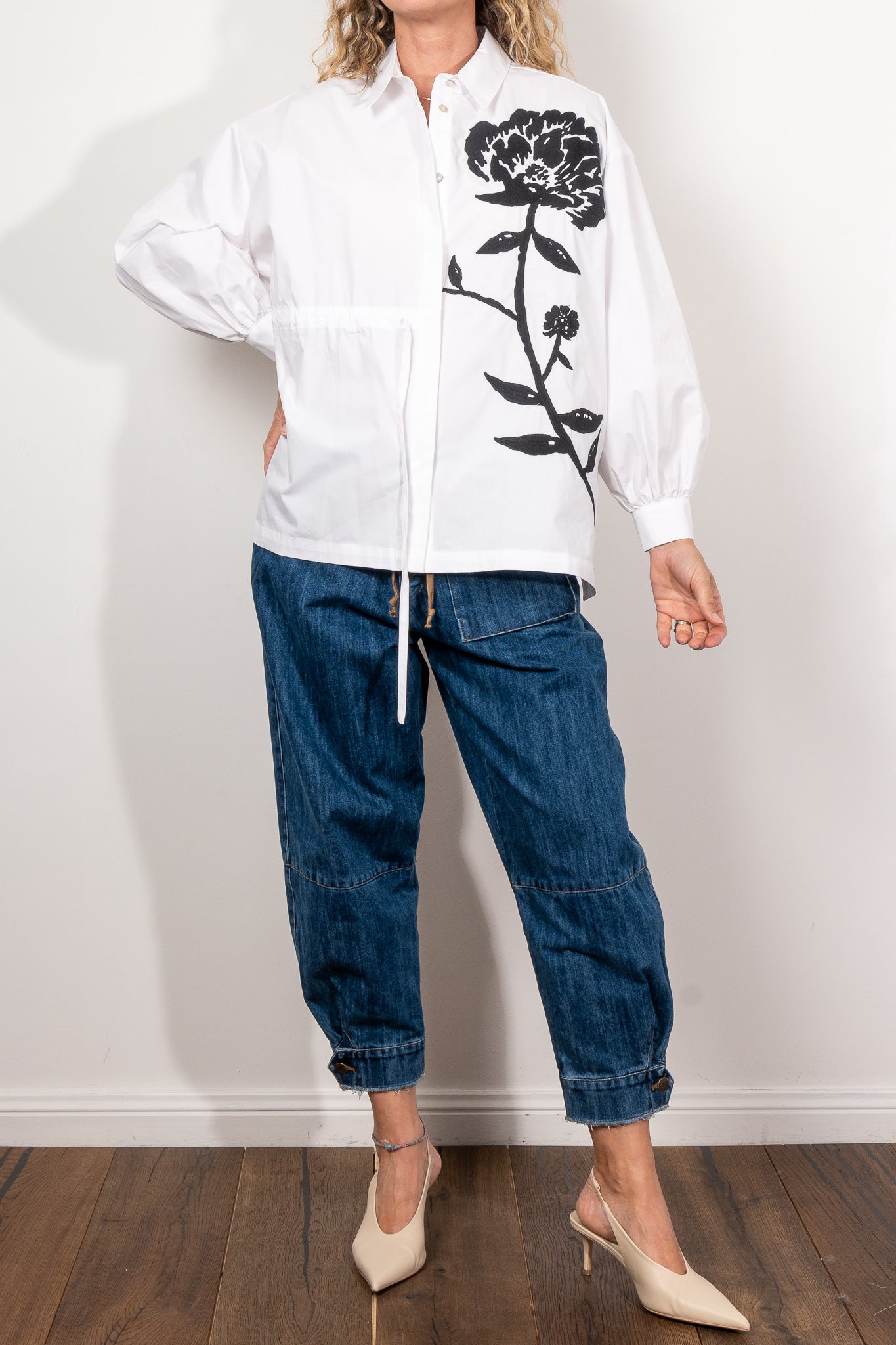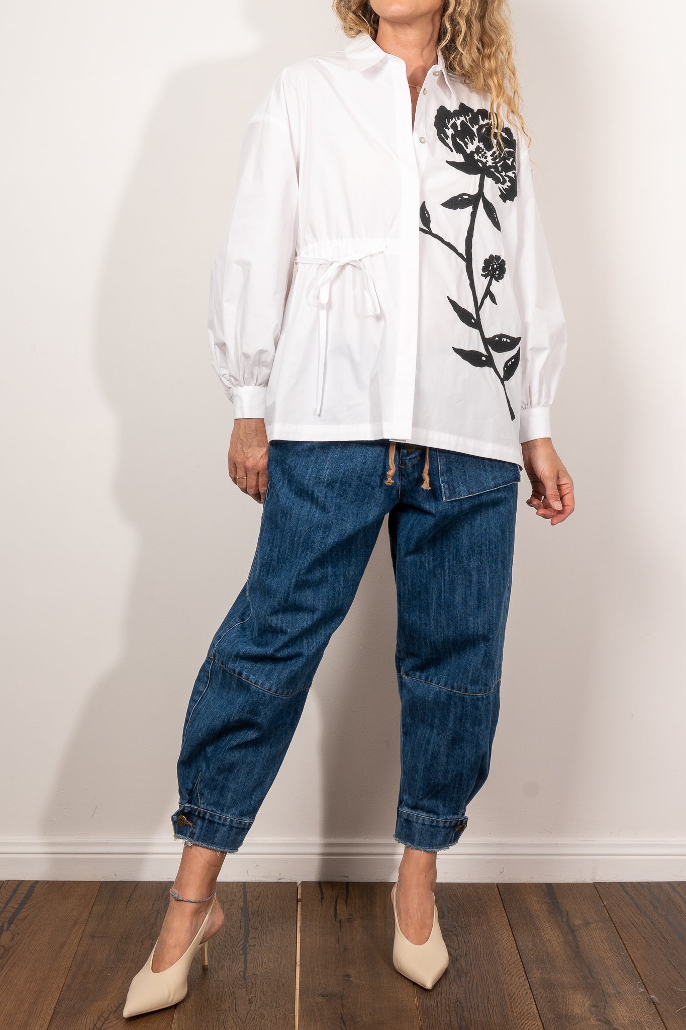 Expertly crafted to blend timeless elements into a modern silhouette, the 'Love in Full Bloom' shirt exudes effortless style and versatility. Made from luxurious 'Button Me Down' cotton poplin, this shirt boasts an eye-catching embroidered floral design and a unique drawstring waist that adds a touch of asymmetry. Whether paired with tailored pieces for the office or Cooper jeans for a casual weekend look, this shirt is a must-have in any wardrobe.