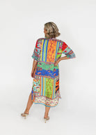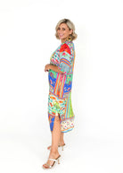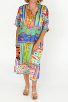 Embrace fearless self-expression in the Ivy Pearl Paradise Dress - a silk masterpiece that transforms any moment into an occasion. Vibrant floral and geometric prints in jewel tones create an art-inspired aesthetic that demands attention, while the lightweight, breathable fabric drapes with effortless elegance. The relaxed fit and 3/4 sleeves offer versatile styling from day to evening, and practical side pockets keep you grounded. Fully lined for comfort and opacity.