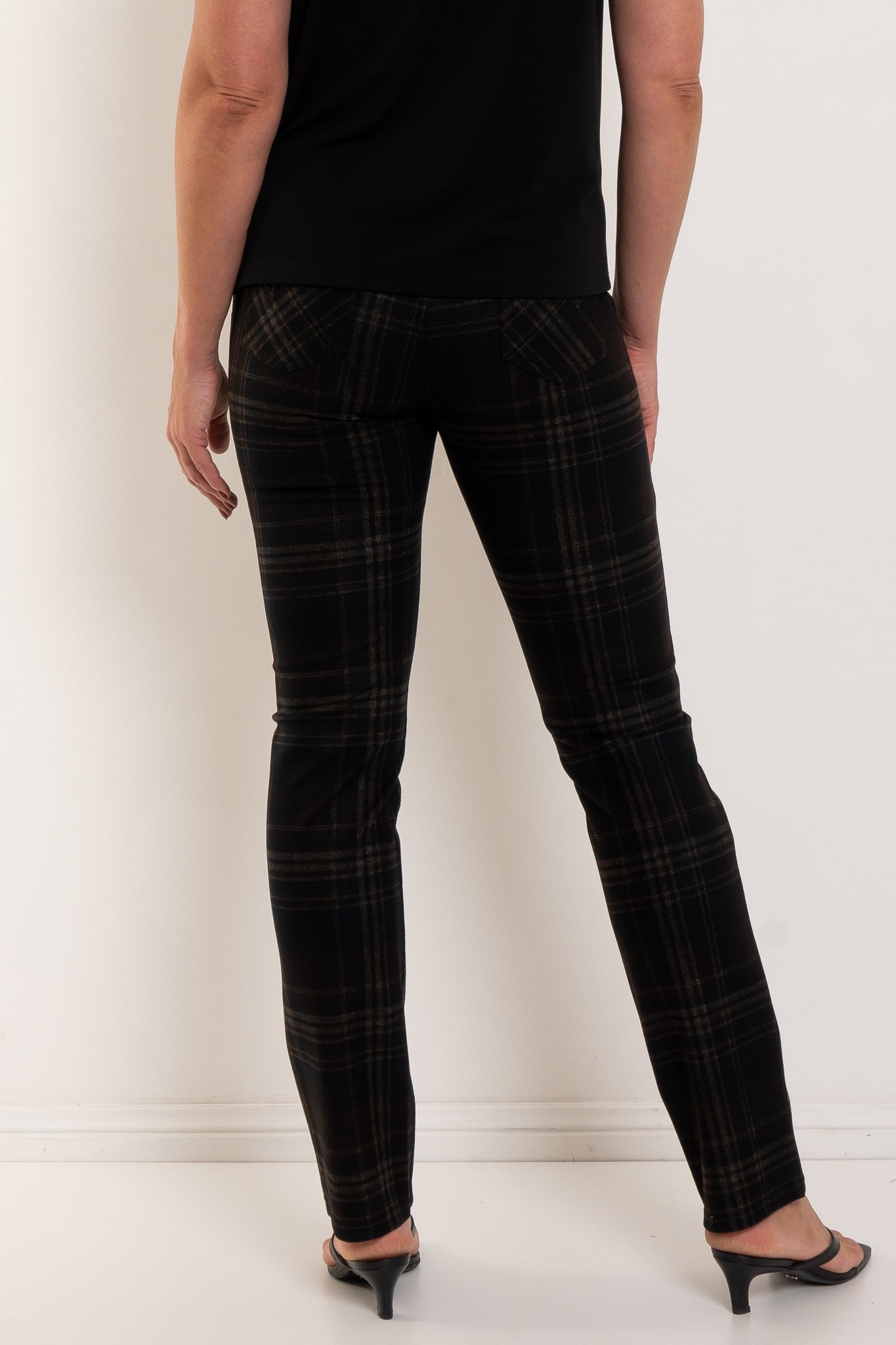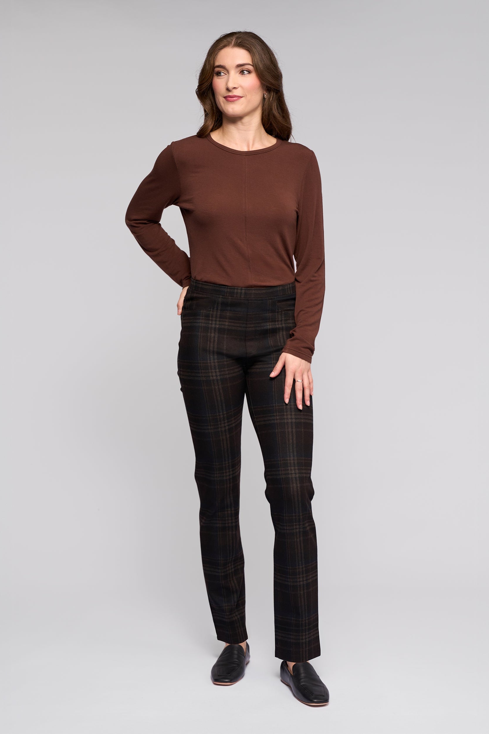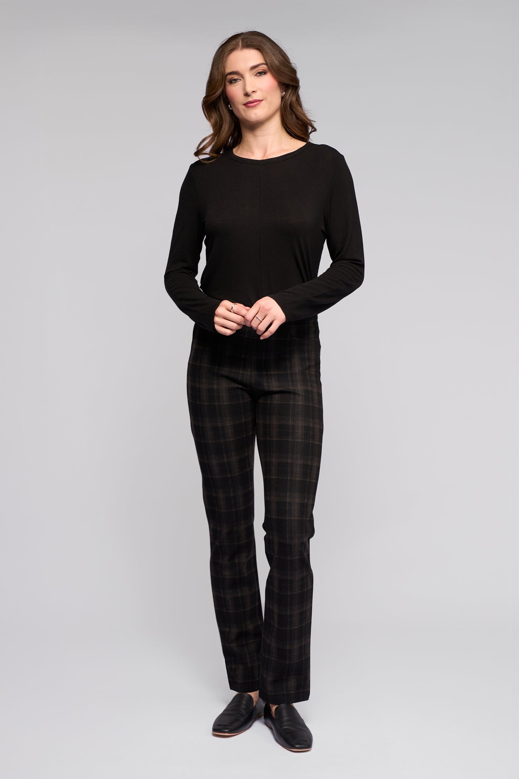 Effortless elegance meets everyday comfort in this slim pull-on pant. Crafted from stretch ponti fabric, it offers a streamlined silhouette with an elasticated waistband for all-day ease. Refined details—including a faux fly, faux front pockets, and functional back patch pockets—deliver a polished finish without compromising on practicality. Perfect for transitioning from office to weekend wear.