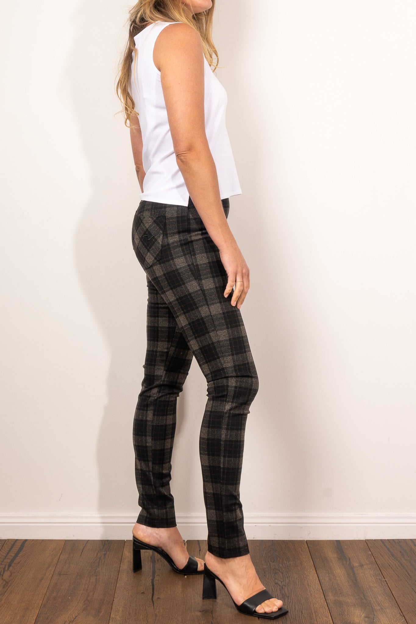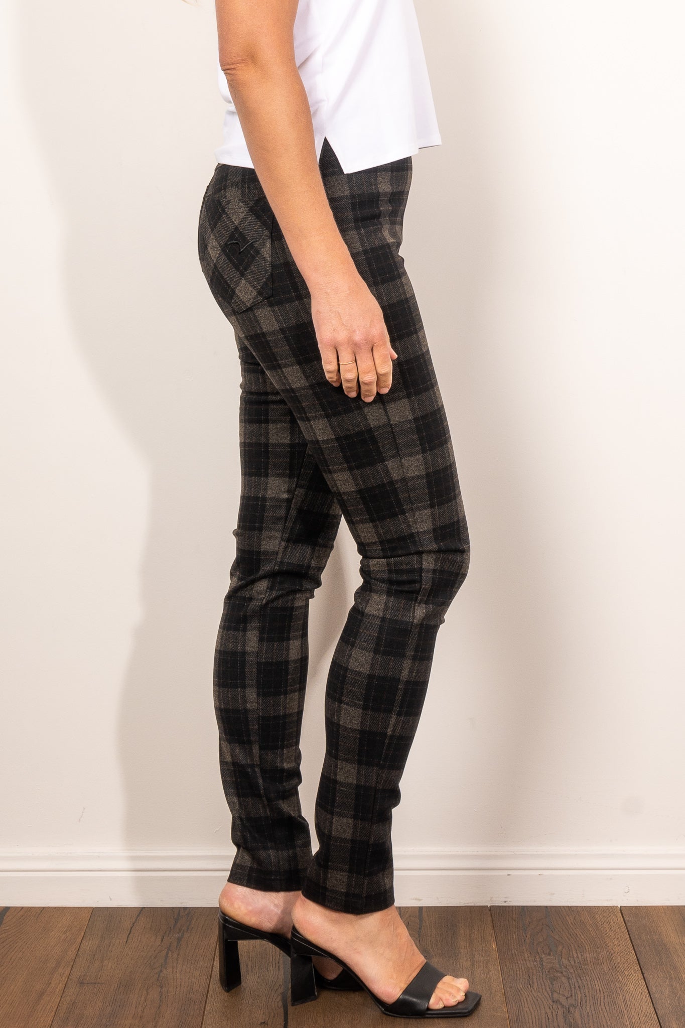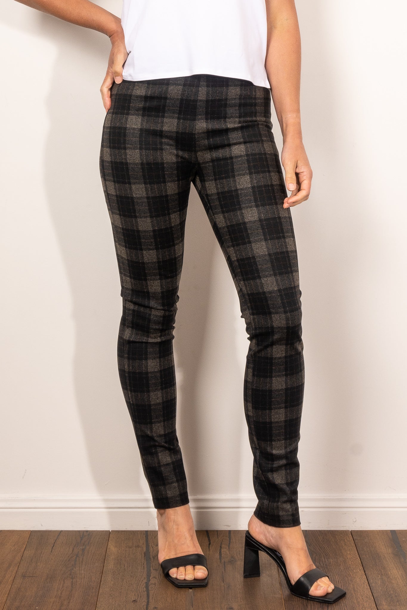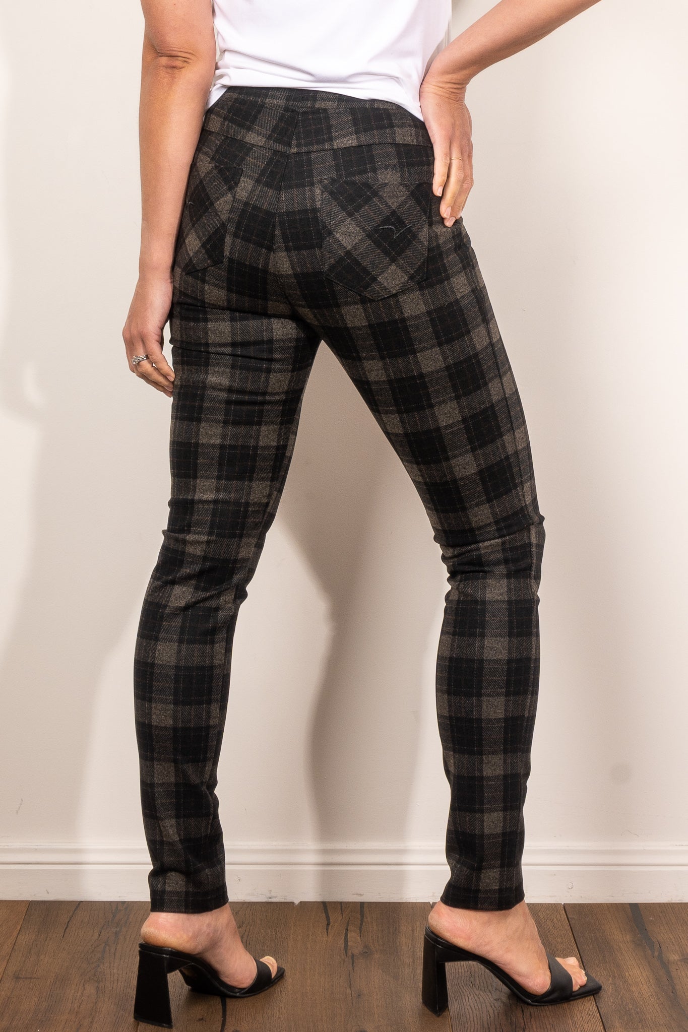 Enhance your winter wardrobe with the Vassalli Oak Skinny Leg Ponti Pant. Crafted from a stretchy and soft winter weight fabric, this pull-on pant features a classic plaid design in dark tones for a sleek and sophisticated look. With a smooth front and functional back pockets, this full-length pant is both comfortable and stylish, making it the perfect addition to your wardrobe.