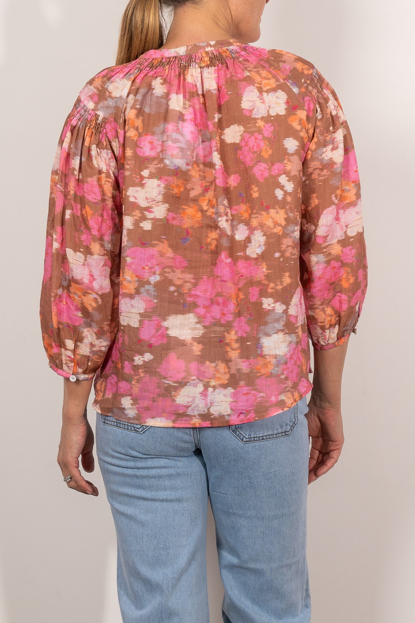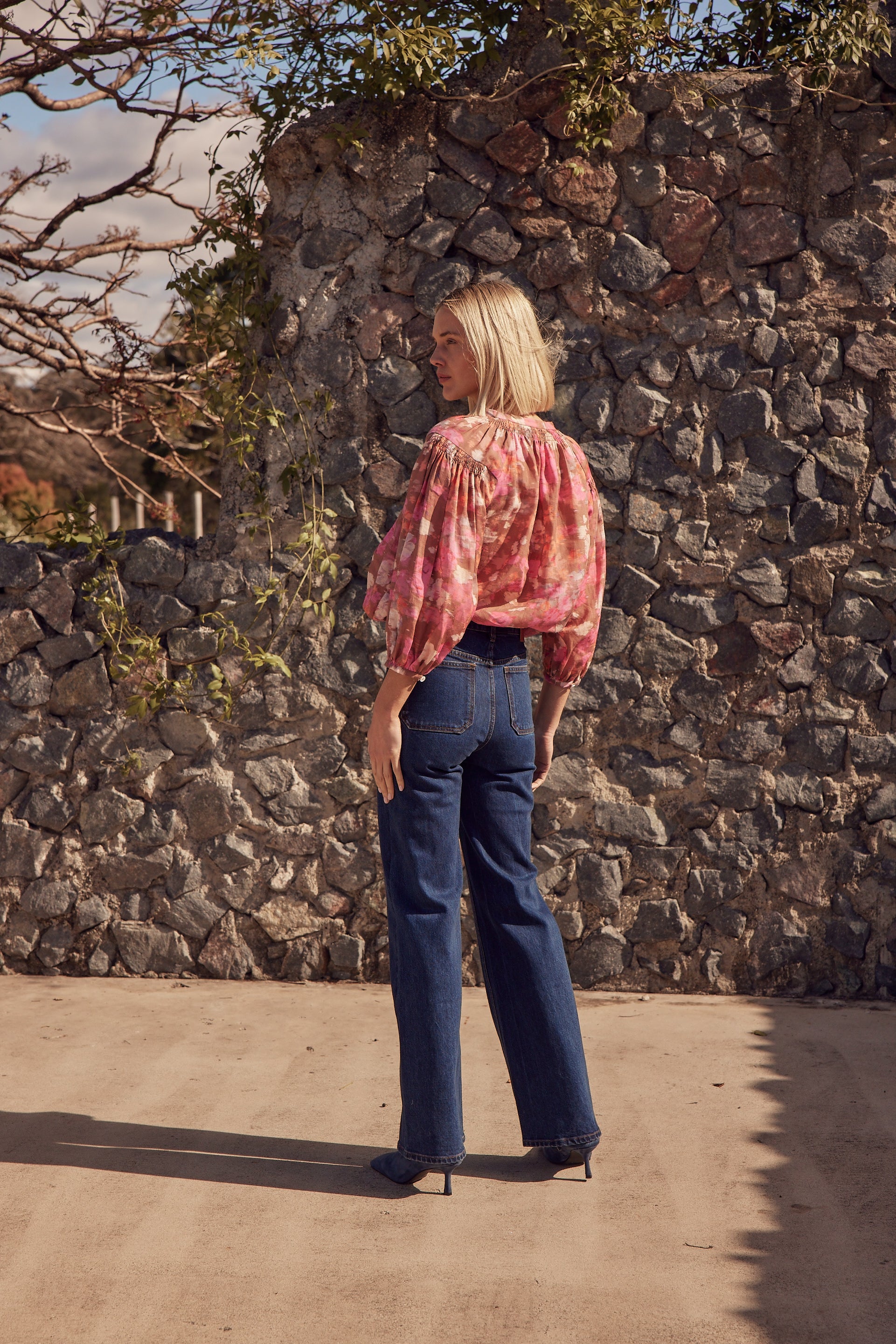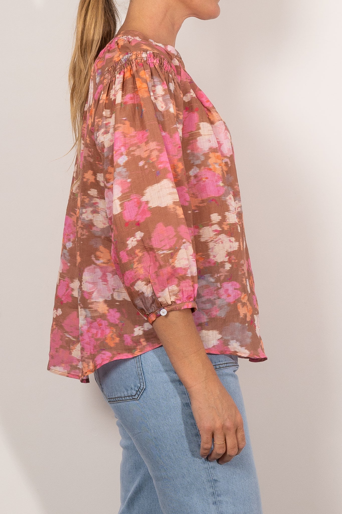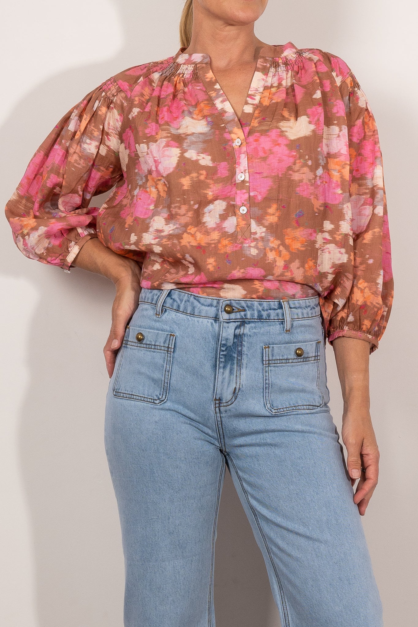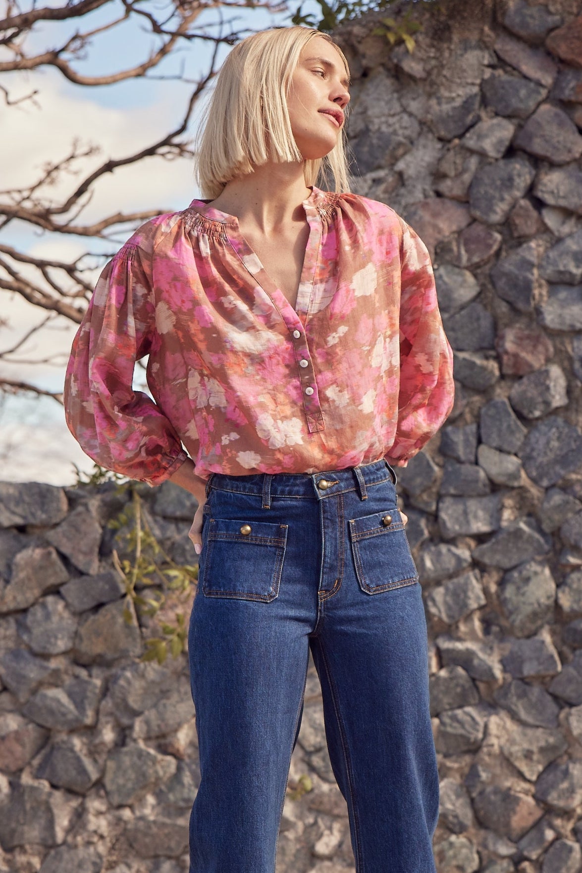 Elevate your everyday wardrobe with the Zoe Kratzmann Stage Top. Made of lightweight ramie, this top offers refined comfort and subtle drama. The V-neckline and soft shirring at the neck and sleeves create a flattering silhouette, while the contrasting shell buttons with gold accents add a touch of elegance.