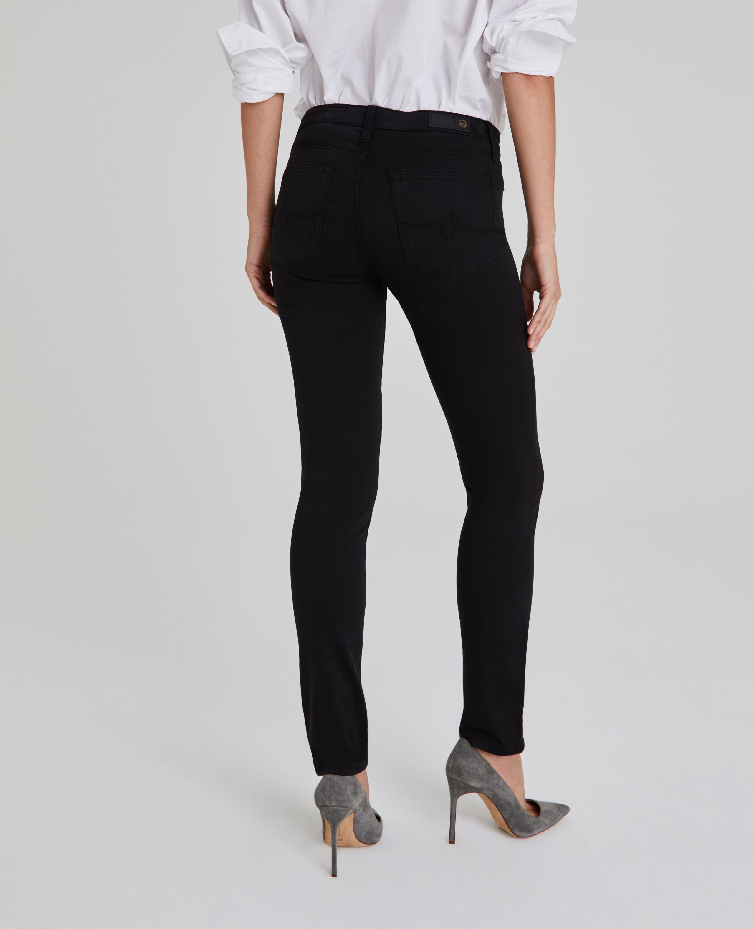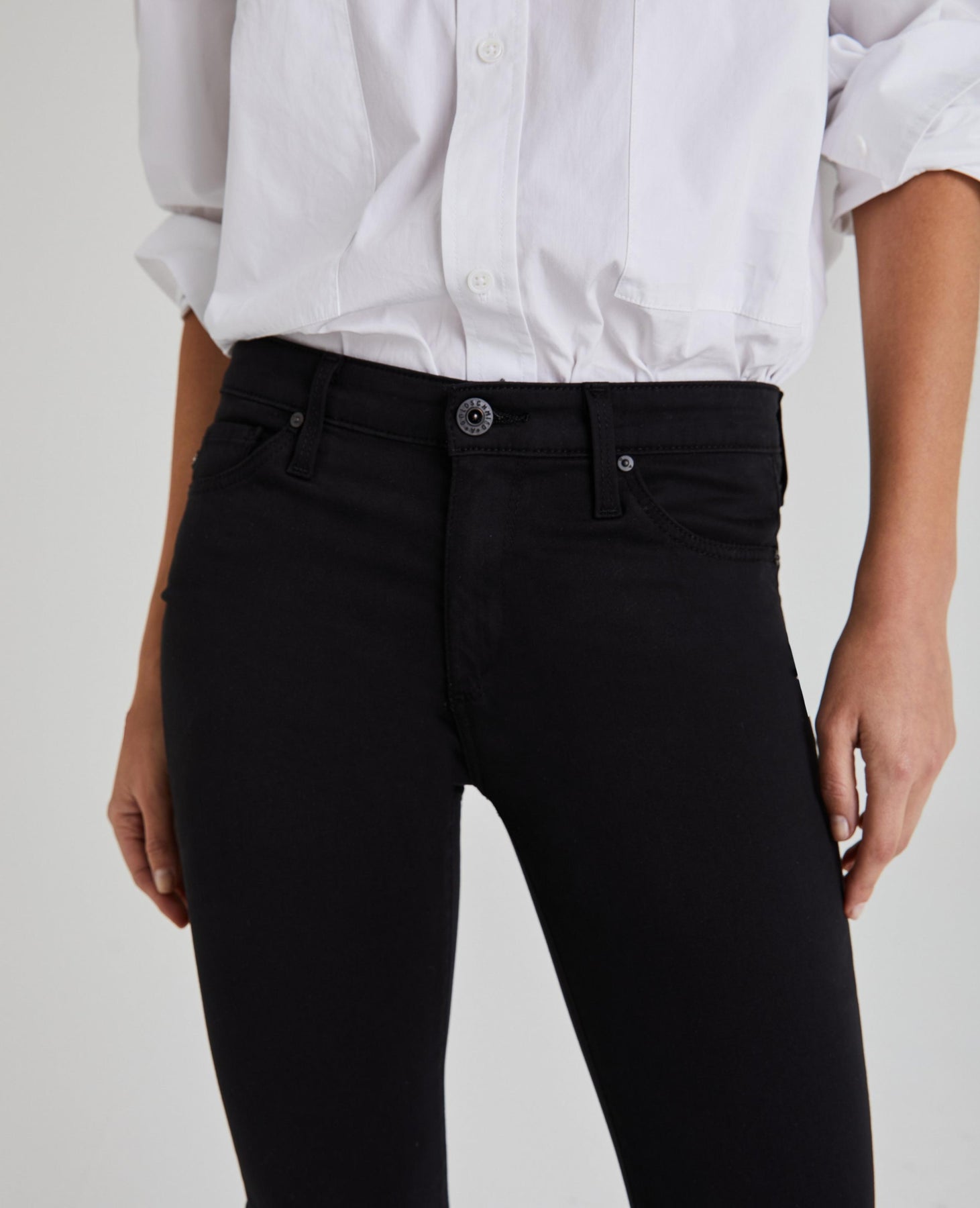 A black mid-rise skinny jean flatters with moderate coverage at the waist, creating a lengthened silhouette. Made with premium stretch for a close yet comfortable fit. Five-pocket design with tonal stitching and matte hardware. Zip fly, button closure.