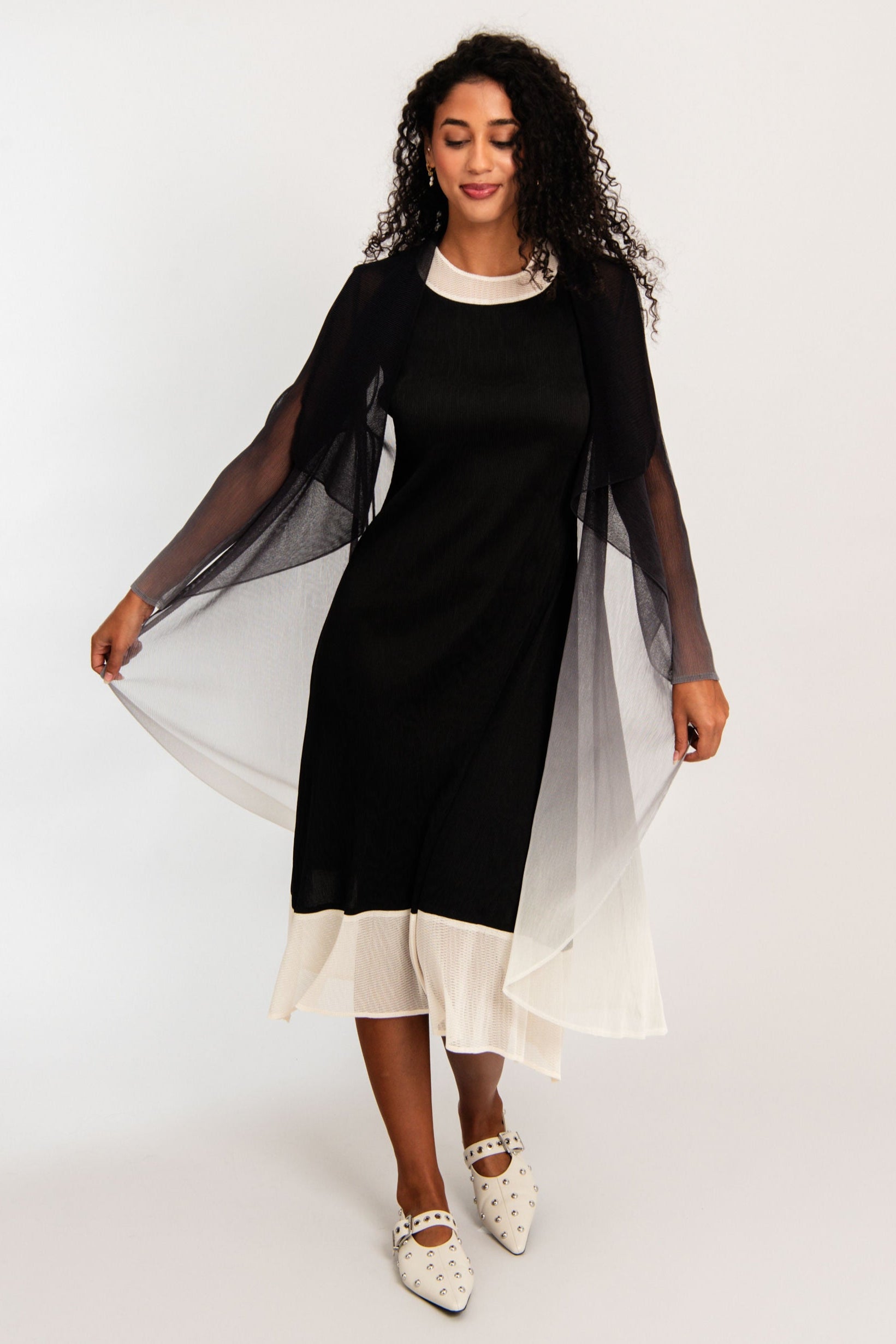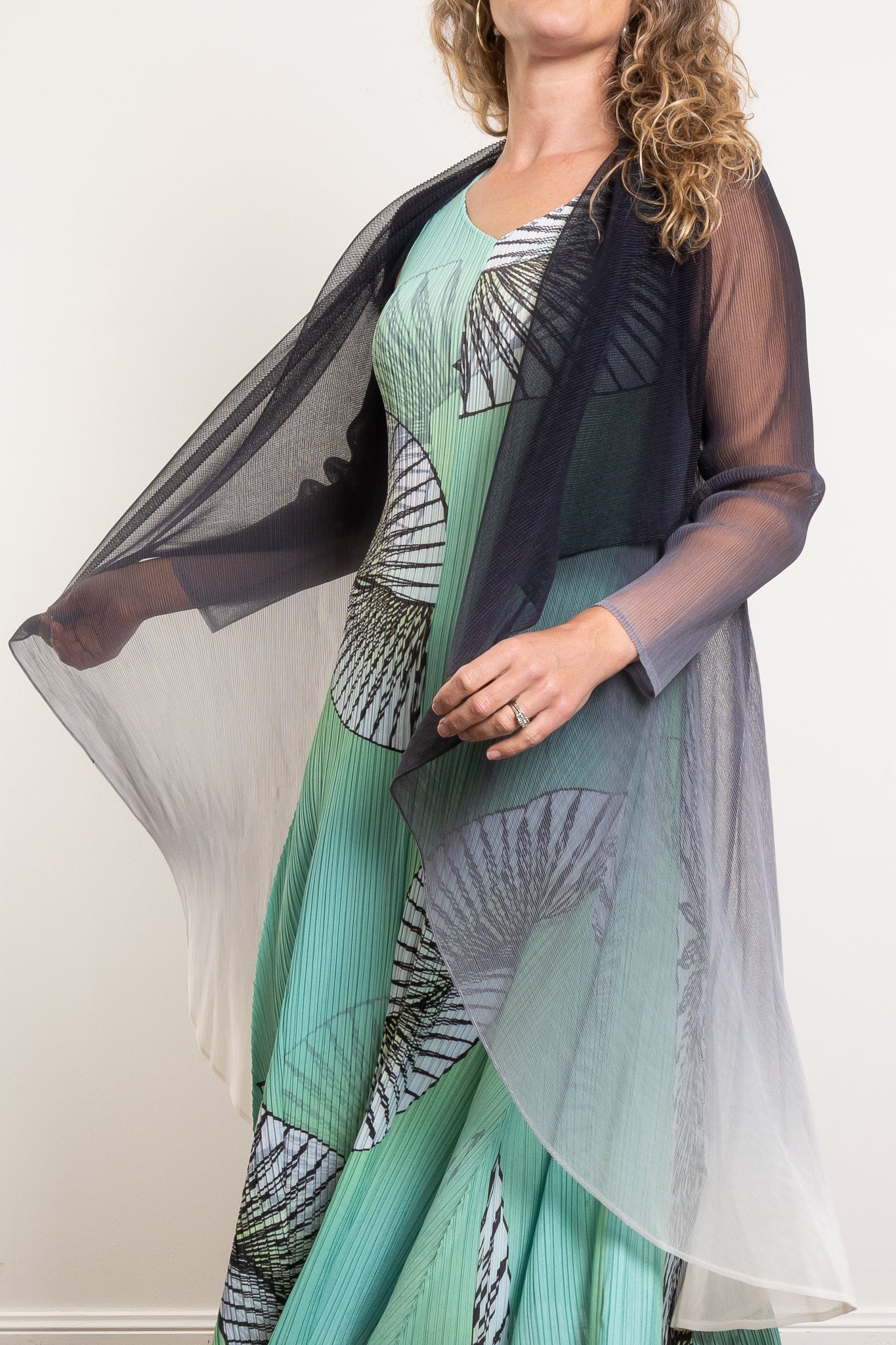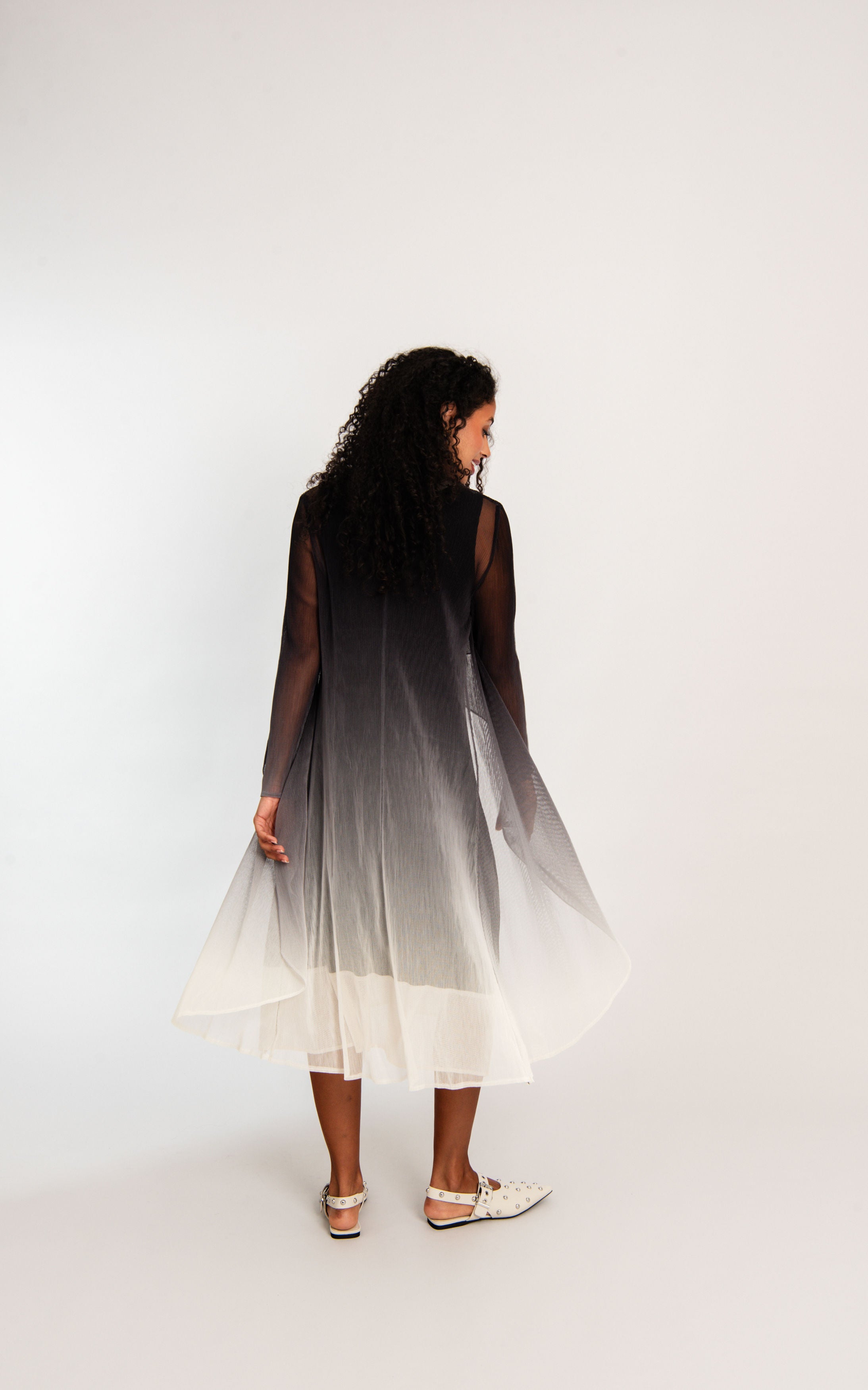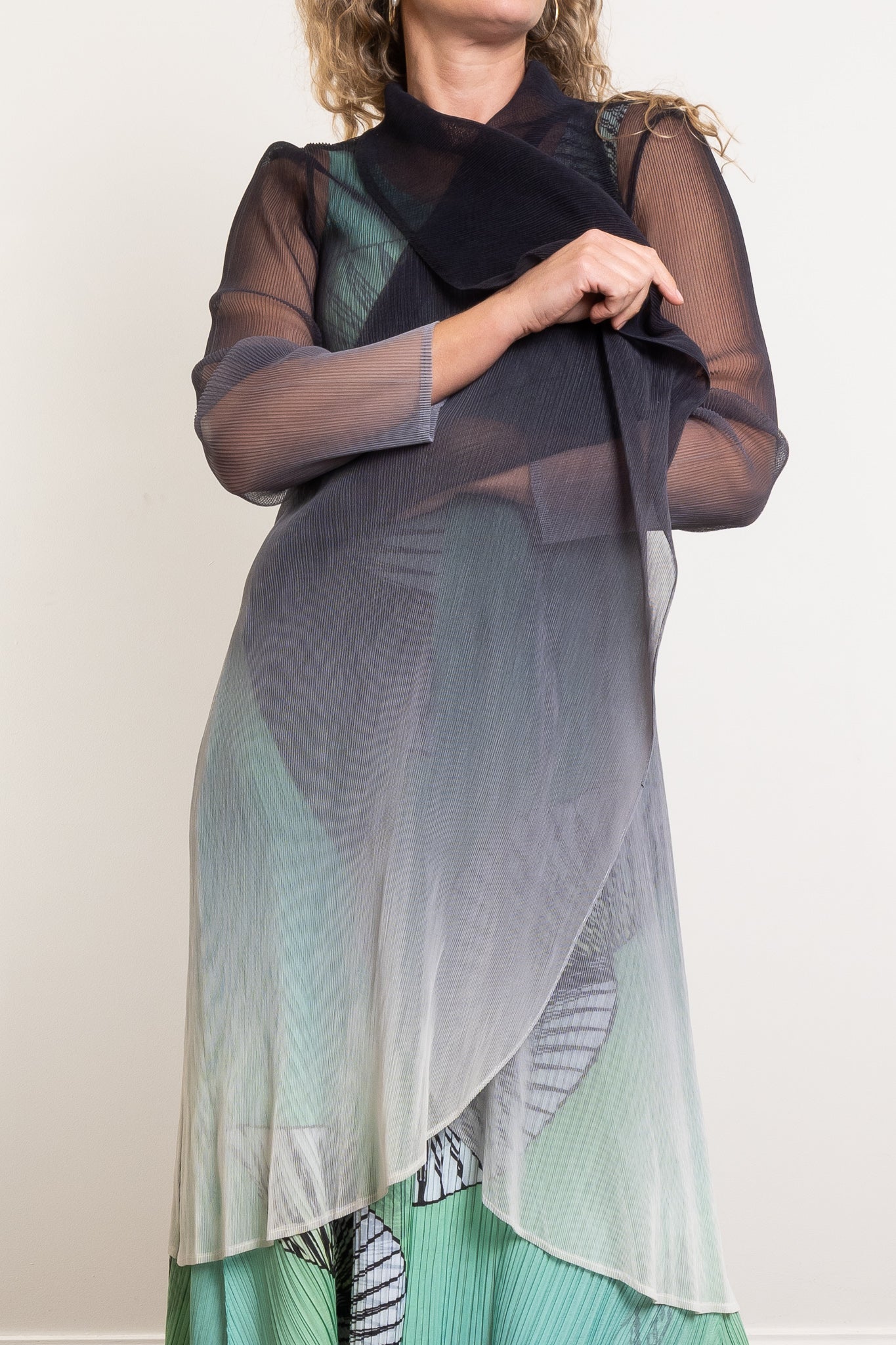 Light as air and endlessly fluid, the Cosa Coat is a sheer statement in movement and form. Crafted from 100% Fine Mesh and dyed in a soft ombré gradient, this longline layer features a delicate waterfall collar and slim sleeves. The lightweight coat drapes and flows with ease, designed to accentuate motion and bring a sense of quiet drama to any ensemble.