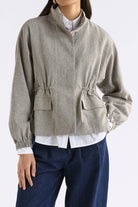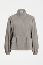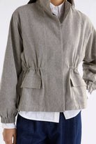 Featuring a stand collar, concealed zip and snap front, and subtle gathered detailing at the waist for gentle shaping, this jacket adds polish without feeling too formal. Thoughtful details like flap pockets and elasticated cuffs give it a refined utility feel.