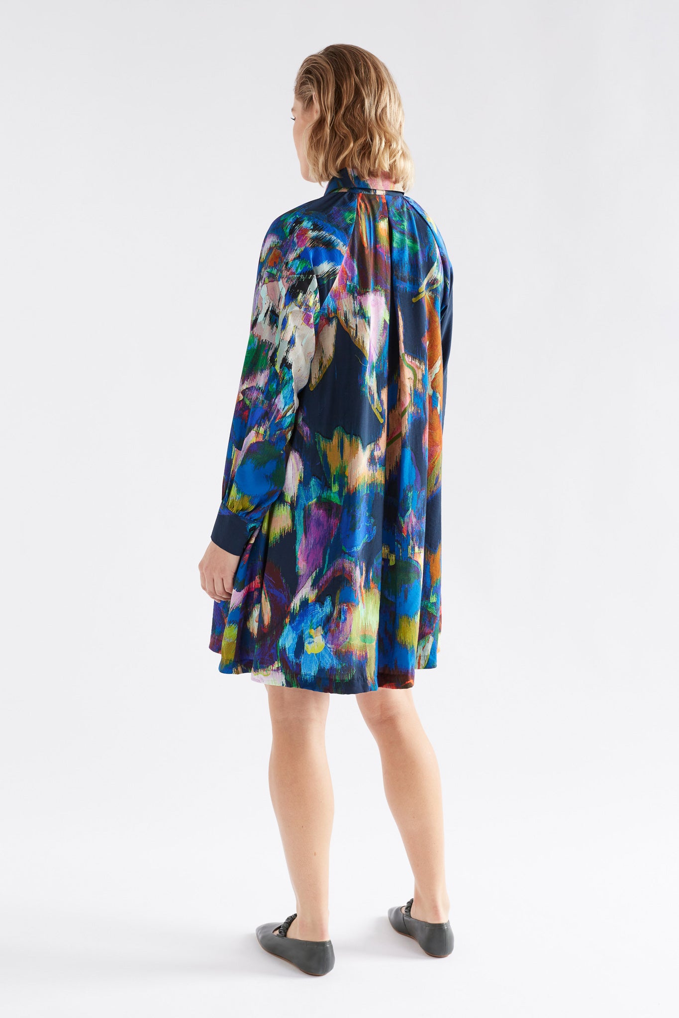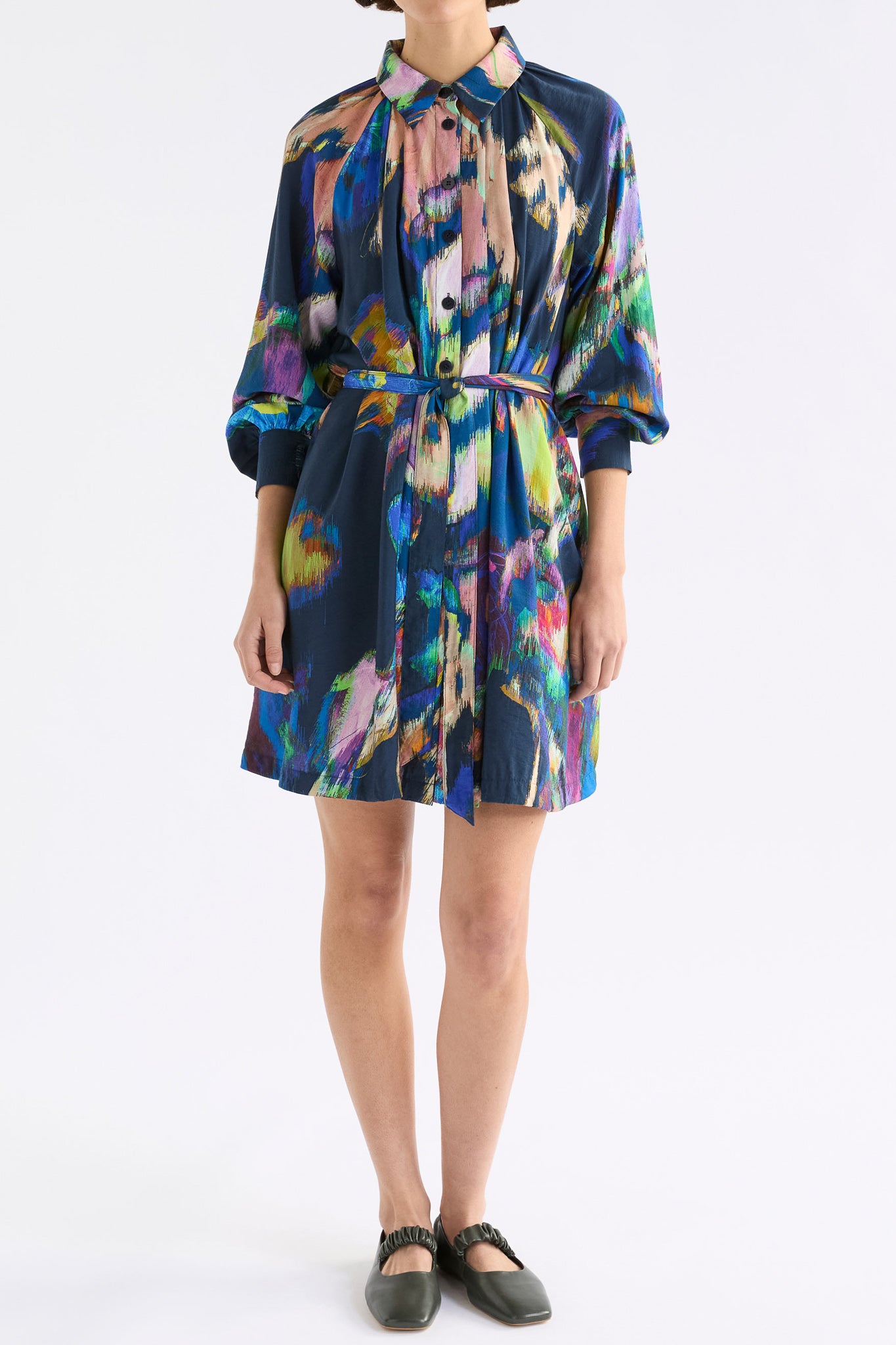 Crafted from a lightweight, silky-feel fabric, the Vaara print splashes vibrant painterly strokes across a deep navy base—making it a bold yet wearable option for both day and evening. Whether worn as a mini dress, longline shirt, or layered over trousers, the Moda Dress offers endless ways to style.