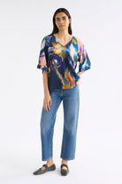 A bold brushstroke of colour for your everyday wardrobe, the Moda V Neck Top in Elk’s exclusive Vaara Print is a wearable work of art. Cut from a silky-feel fabric with a beautiful drape, this relaxed-fit style features a flattering V neckline, soft raglan sleeves, and a curved hemline that falls with ease.