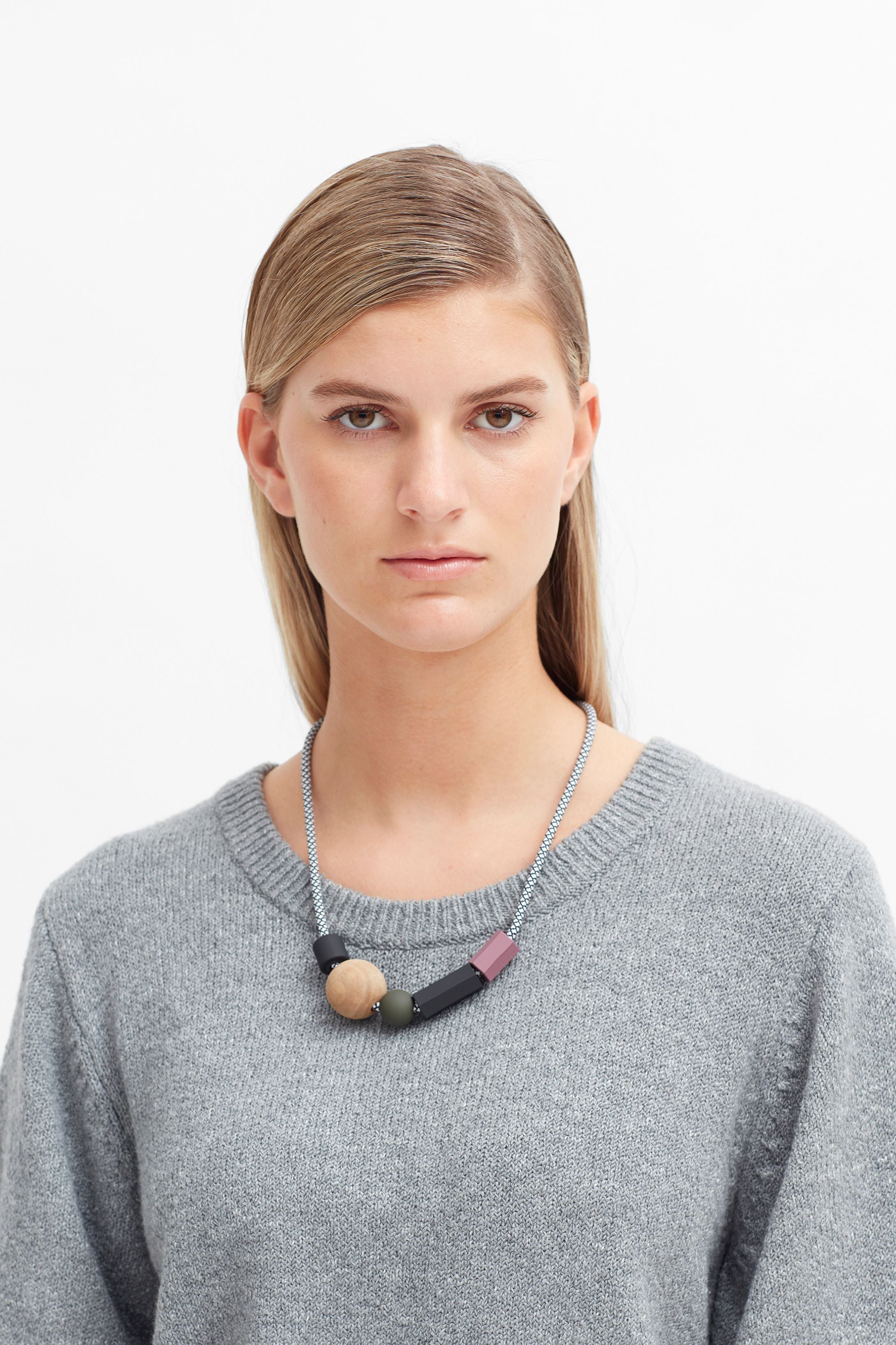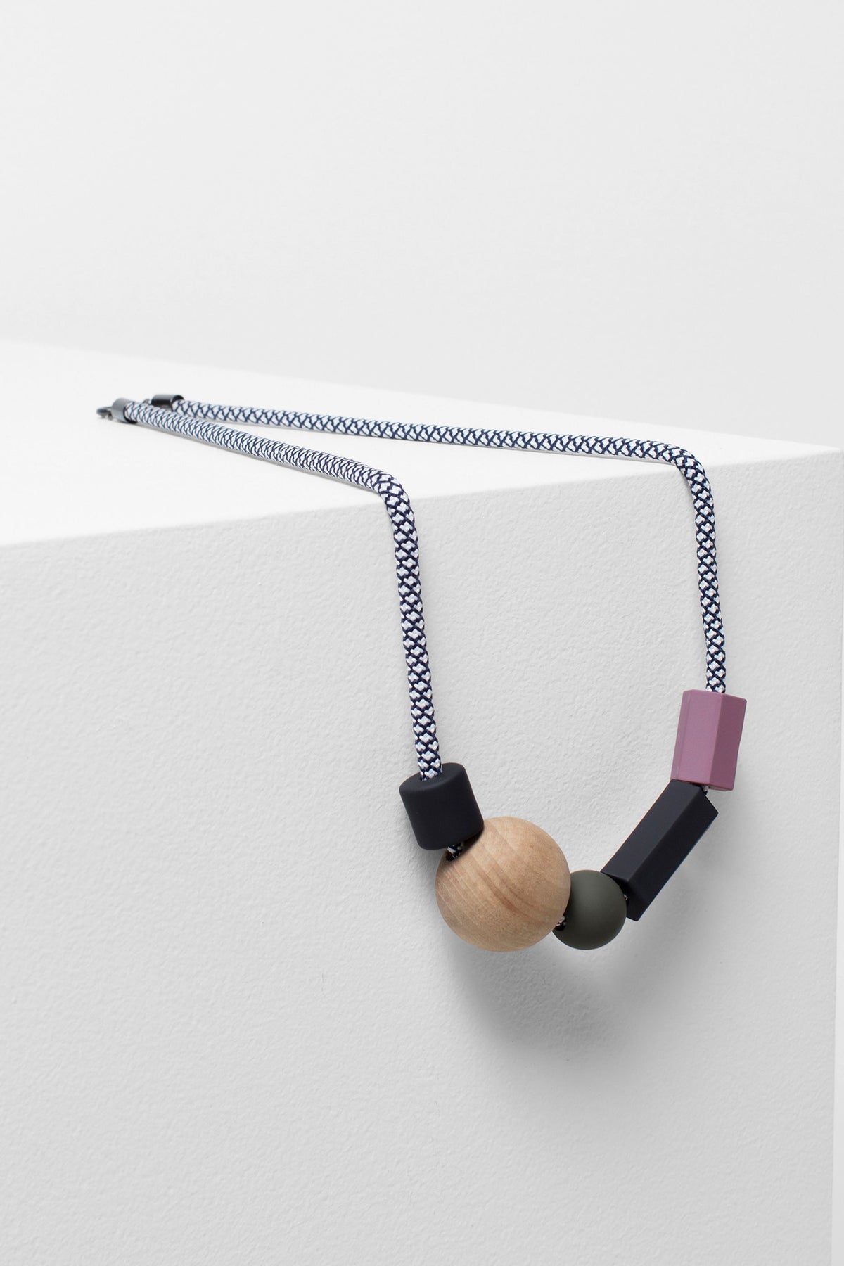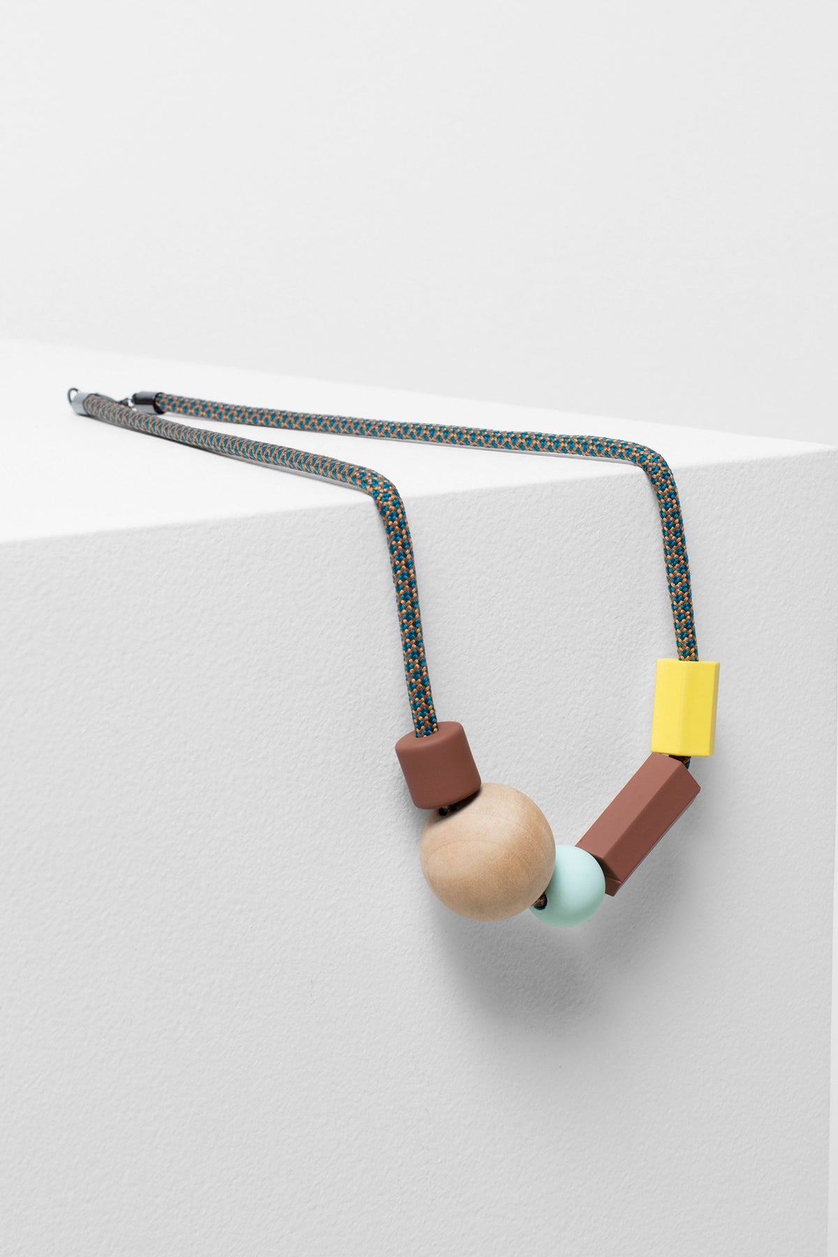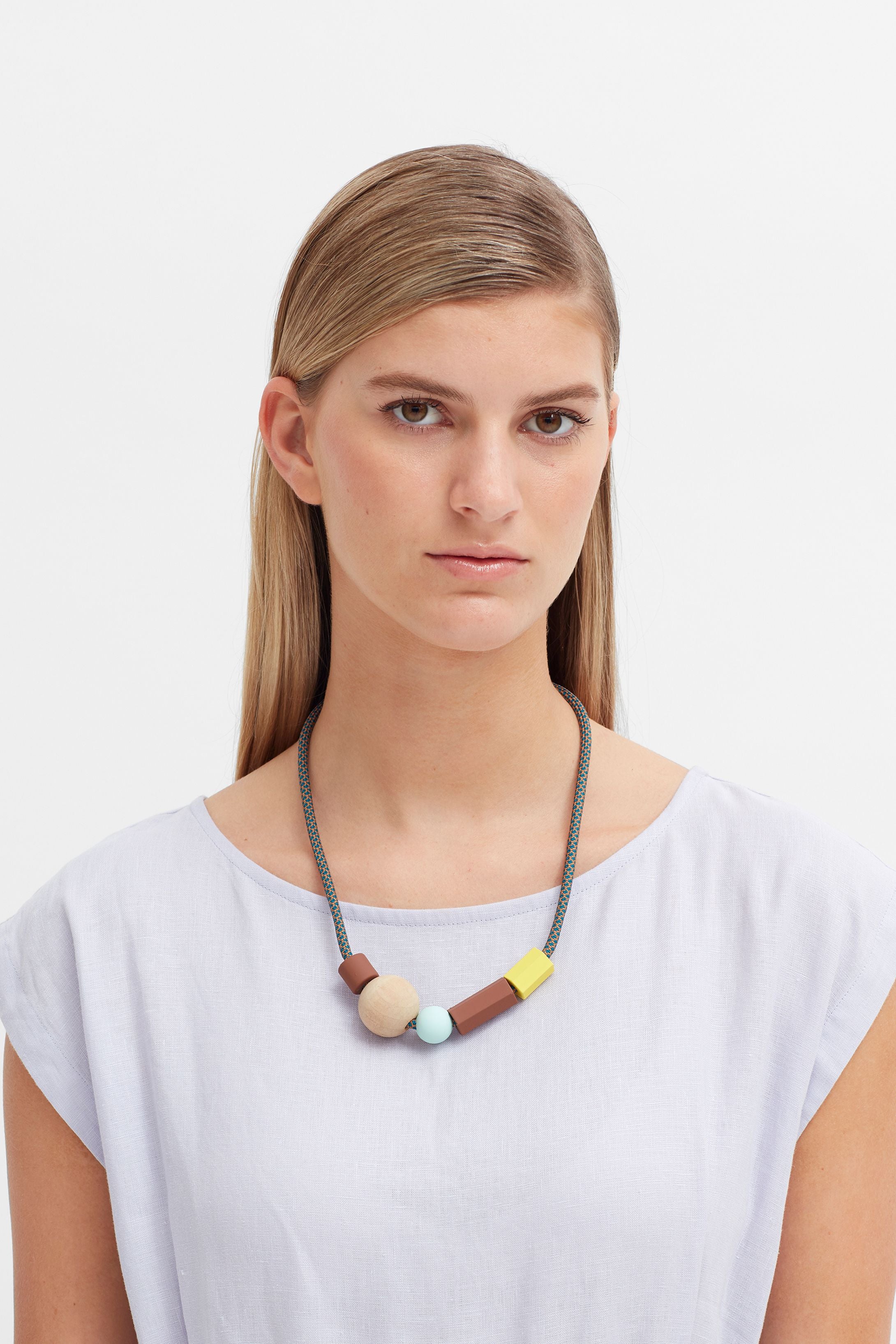 The Ropi Necklace combines a number of geometric shapes for an altogether unique statement piece. This mixed bead necklace combines cylindrical, hexagonal and spherical shapes onto a patterned cord for a fun addition to an outfit.