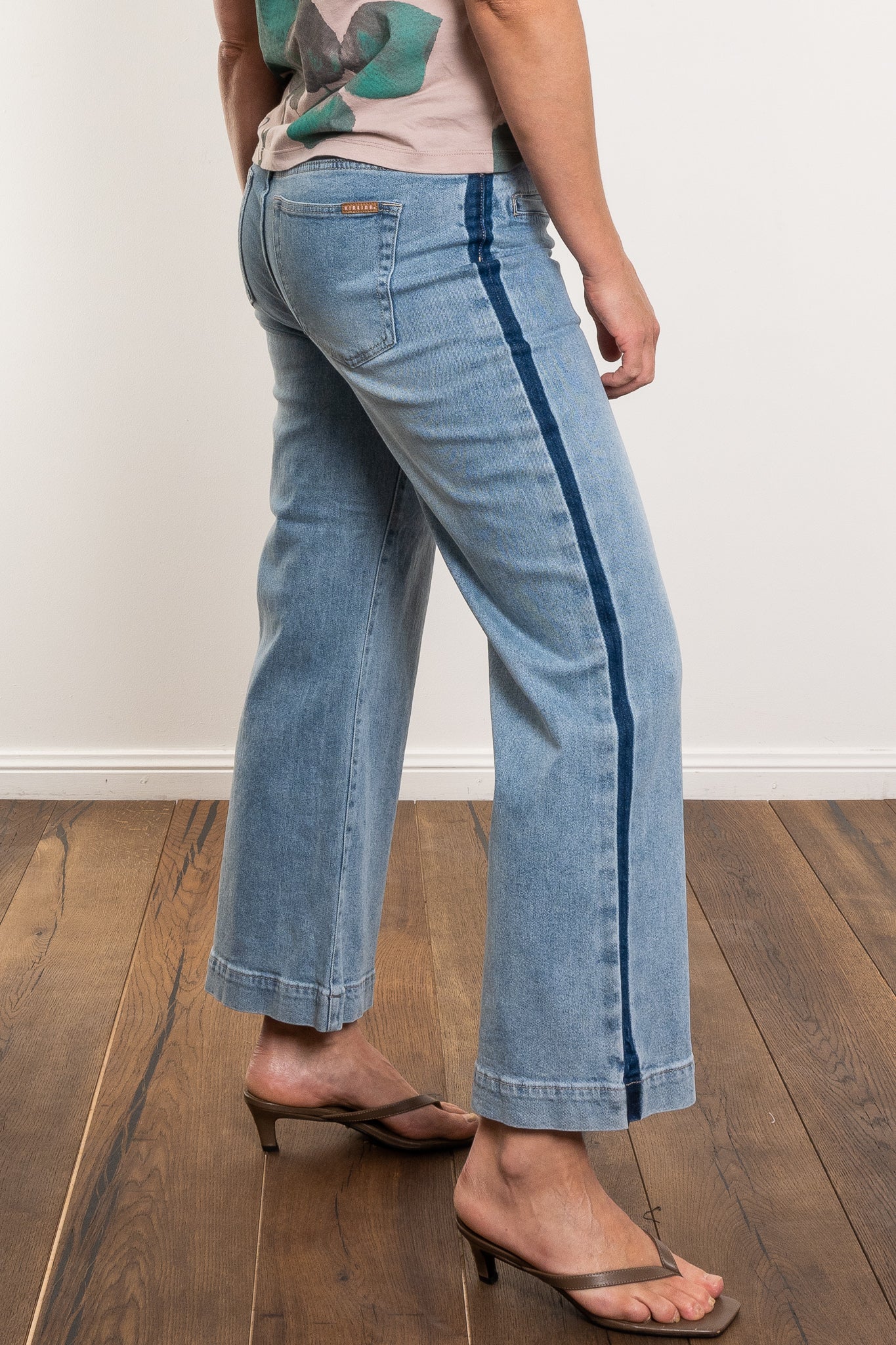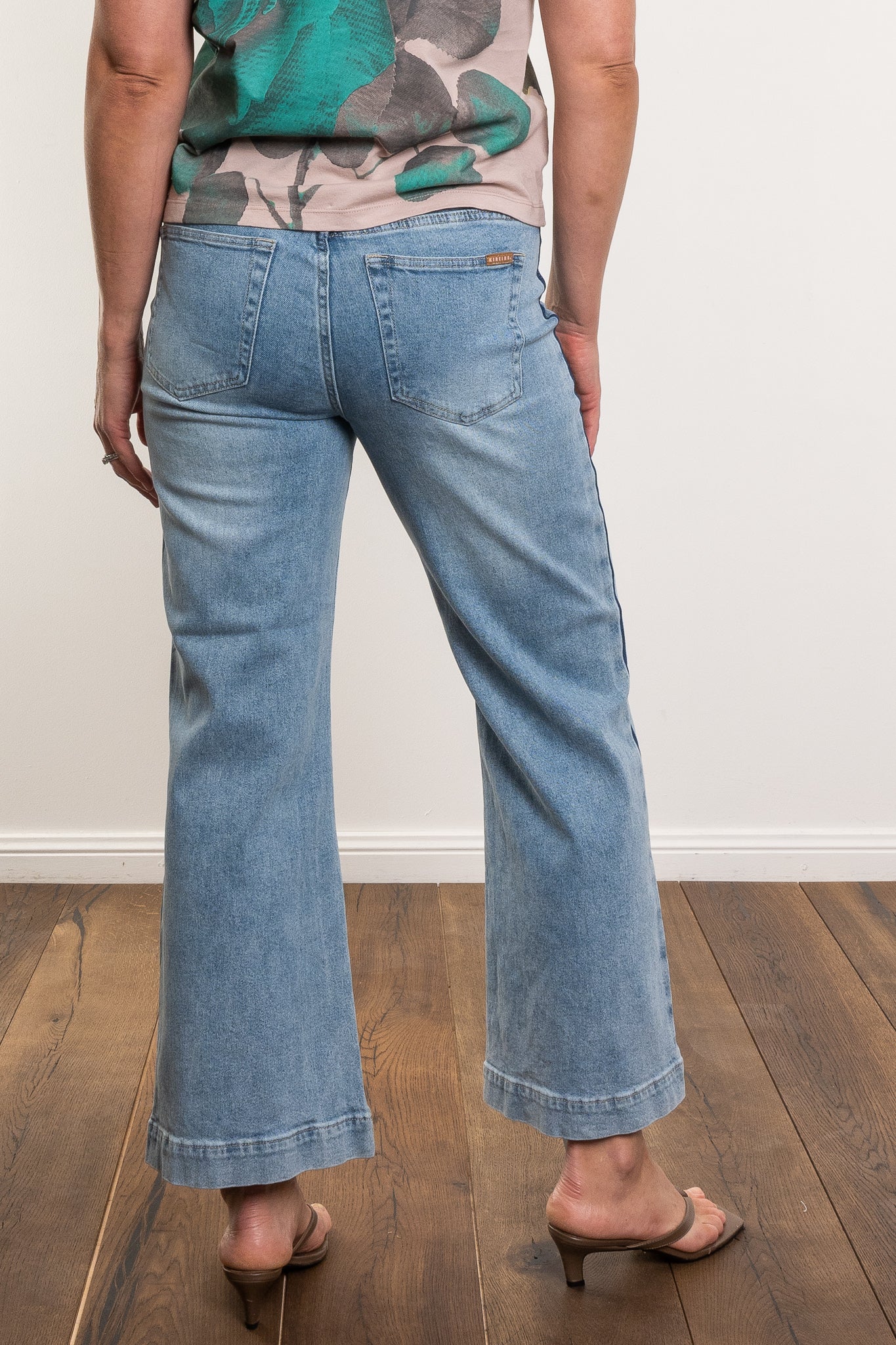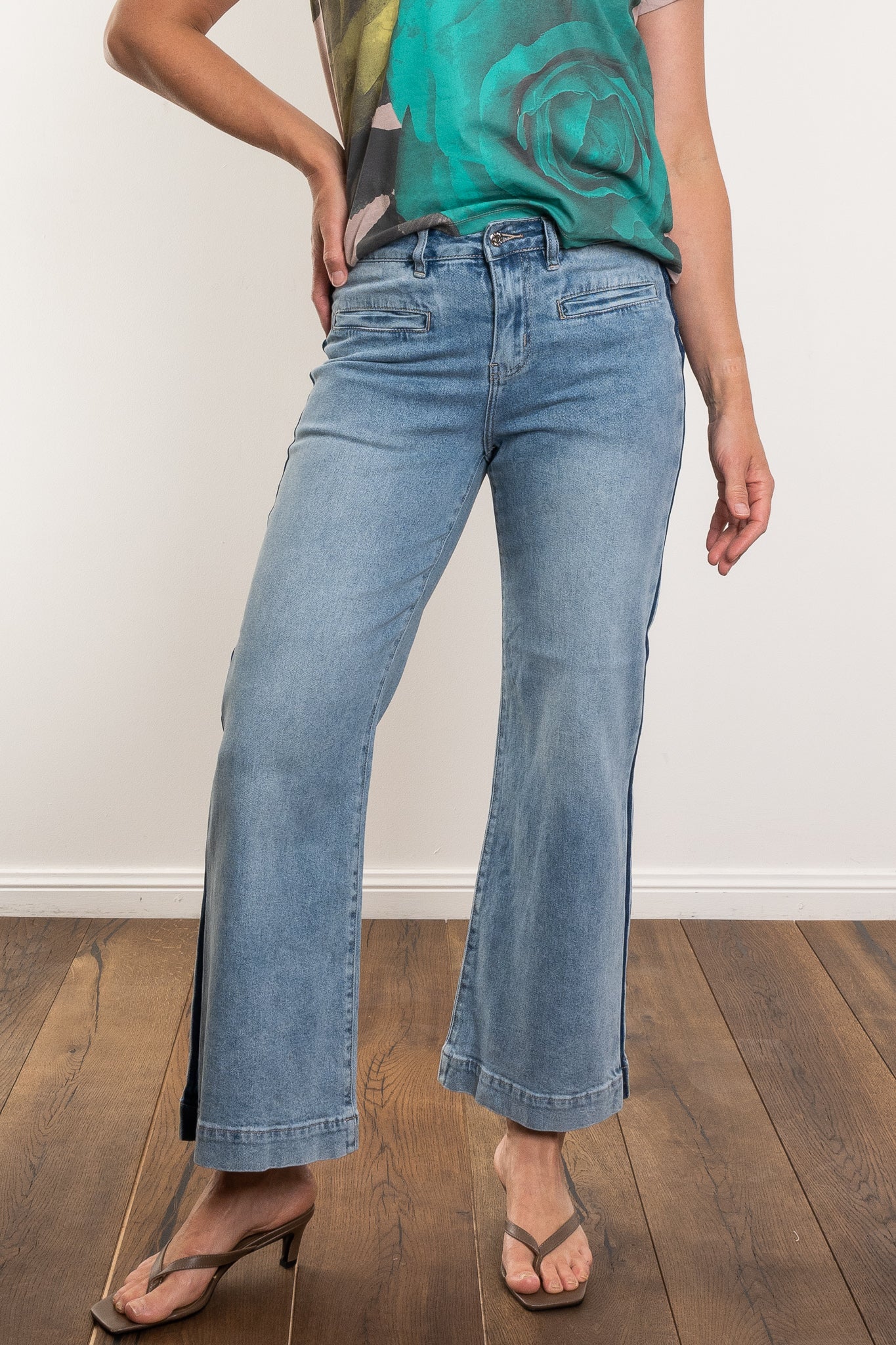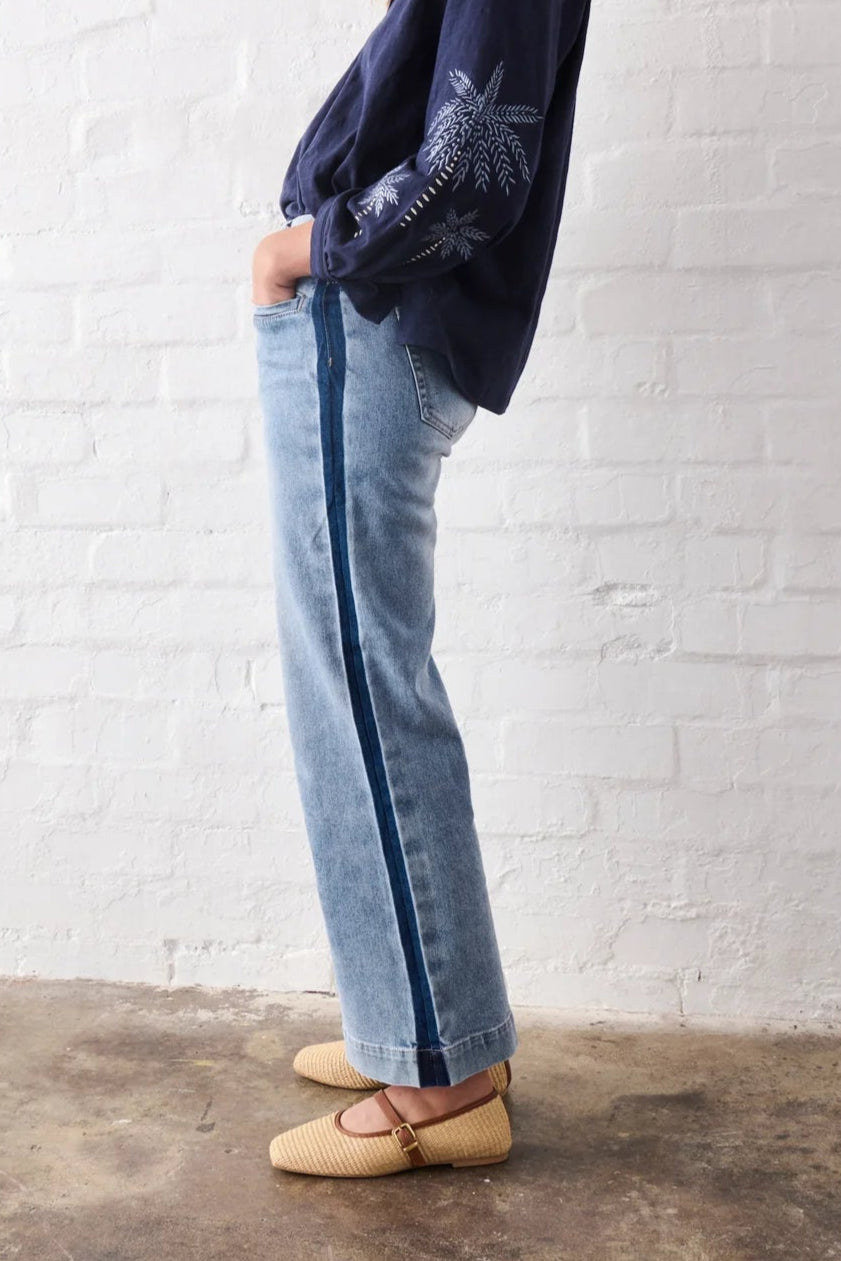 For women who love the drama of a wide leg but still want a flattering fit, the Freya Jean delivers. Designed with a mid/high rise to sit comfortably at the waist, it skims the hips before falling into a relaxed wide leg that kicks out from the knee. The contrast side panel not only adds a touch of 70’s-inspired attitude but also creates a lengthening effect — perfect with sneakers, sandals, or heeled boots. Finished in the new Waterfall Deconstructed wash, this pair is your go-to for effortless everyday style with a retro edge.
