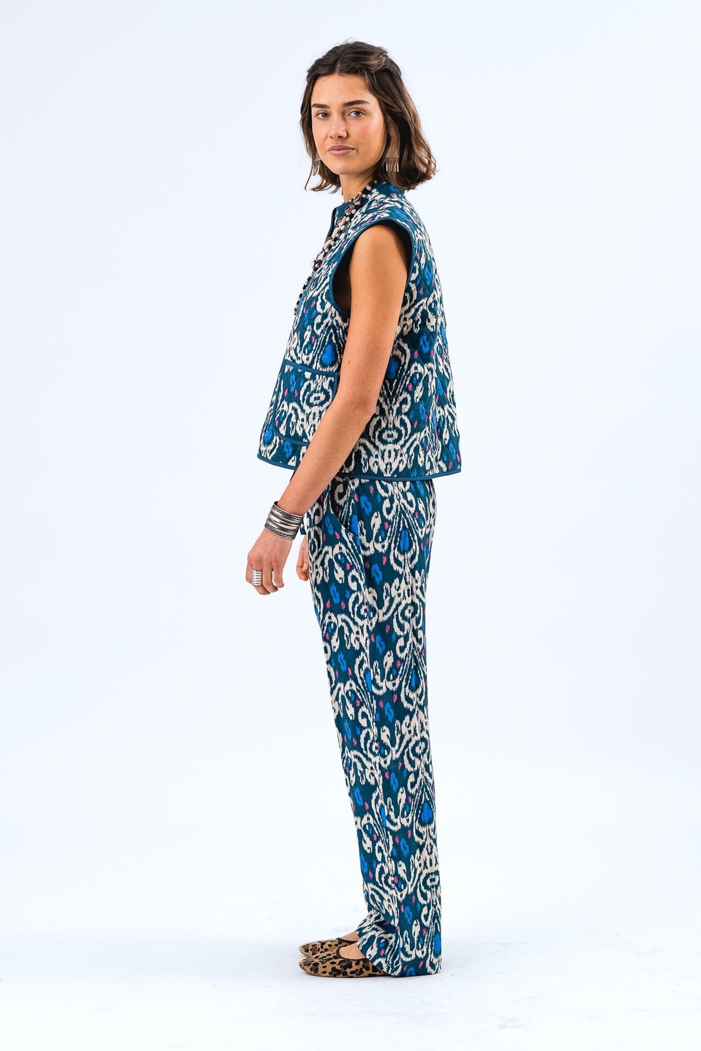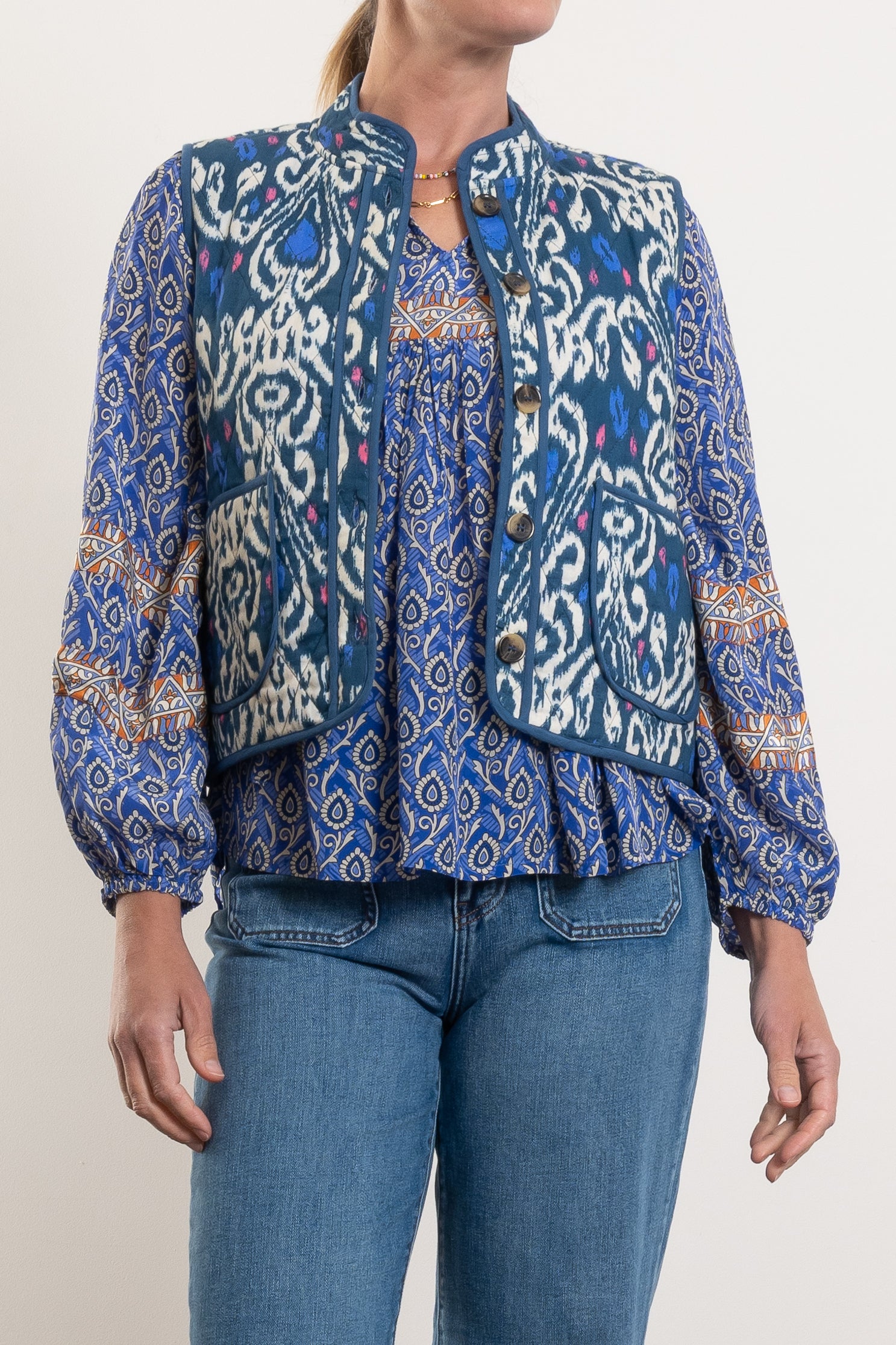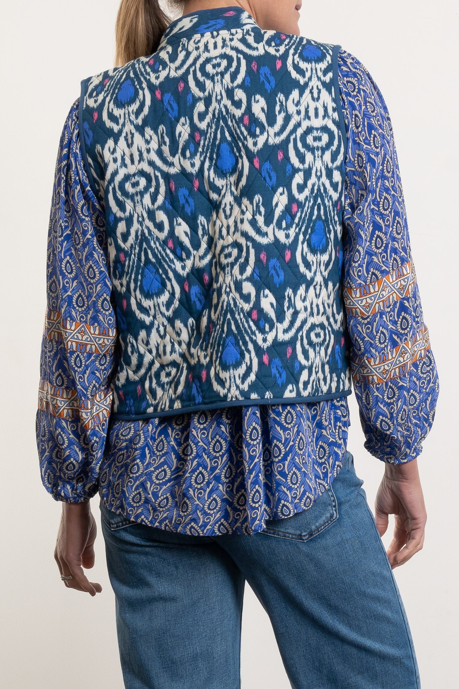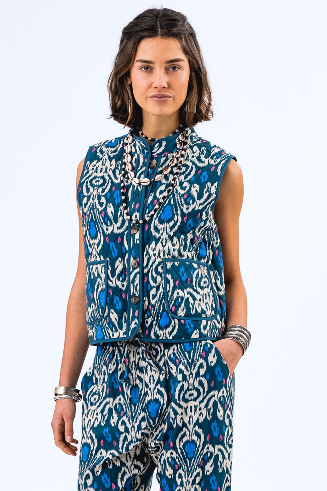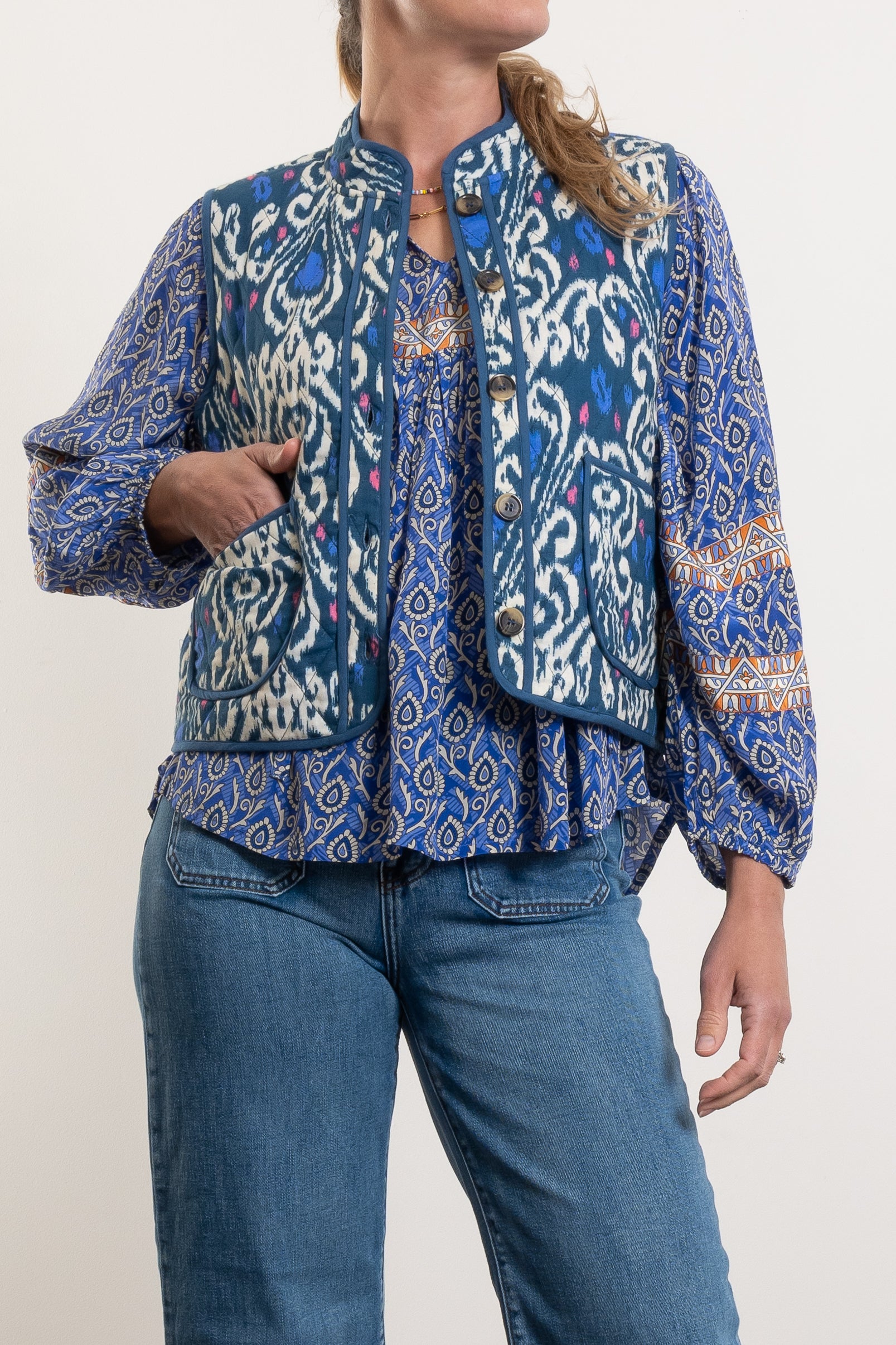 Vibrant and textural, the Cario Quilted Vest is an easy statement piece for transeasonal layering. Made from 100% cotton and lightly quilted for structure and warmth, it features a bold ikat-inspired print in striking shades of blue, cream, and fuchsia. Whether worn buttoned-up or open over a simple base, it brings instant personality to everyday styling.