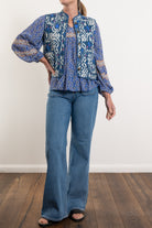 Eye-catching graphic print in deep teal, blue, and ivory tones