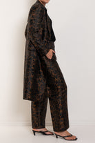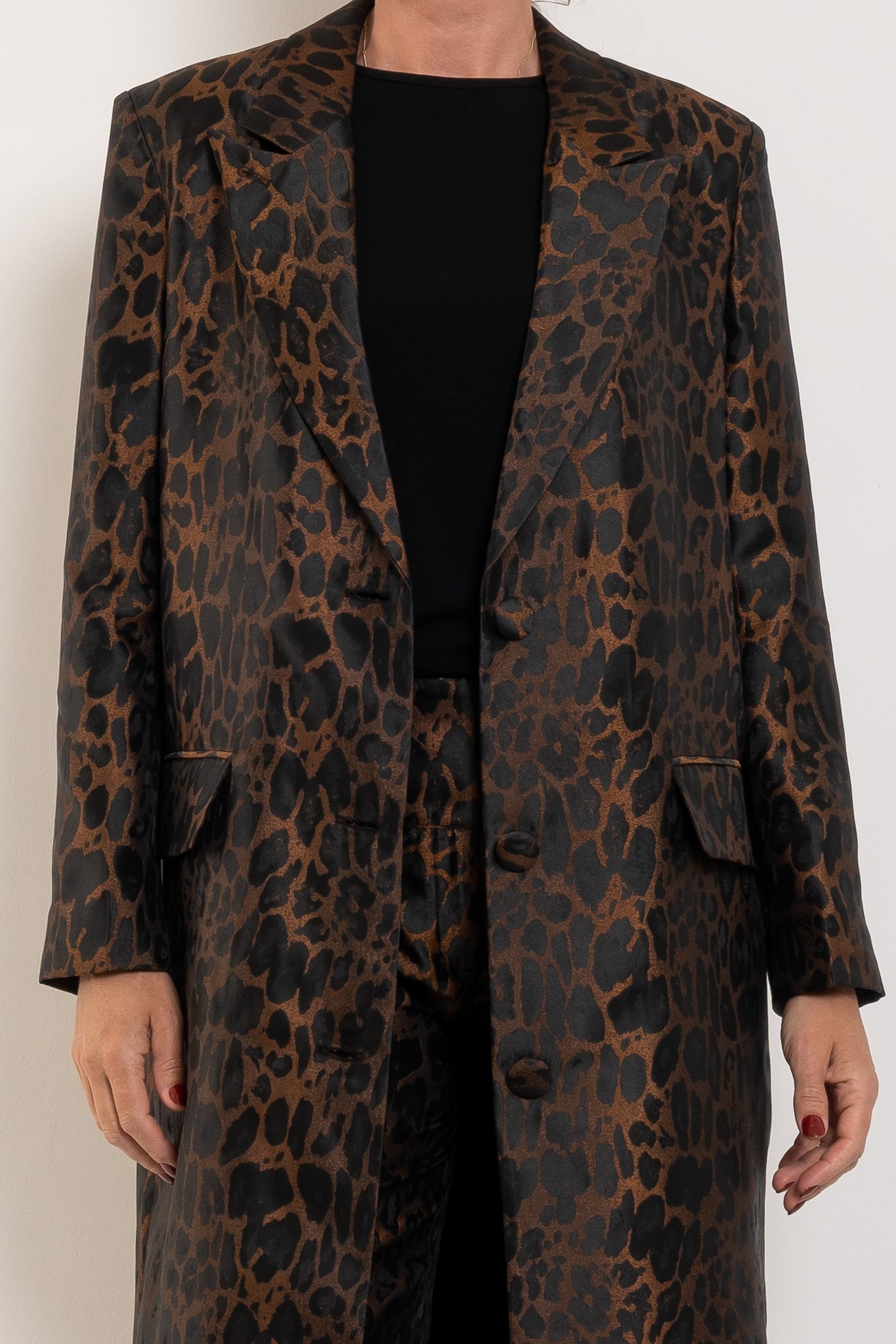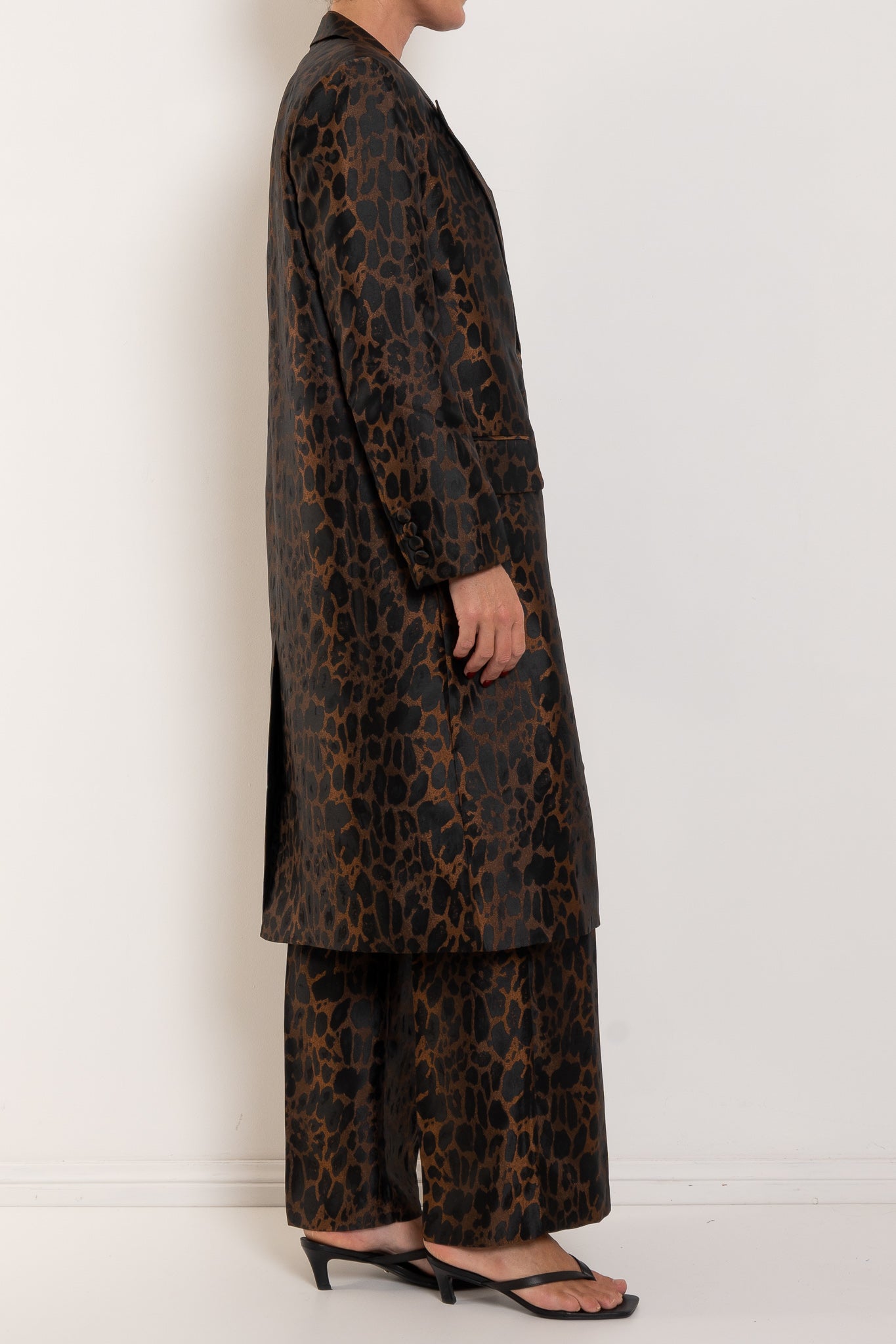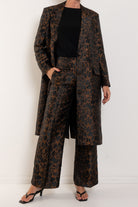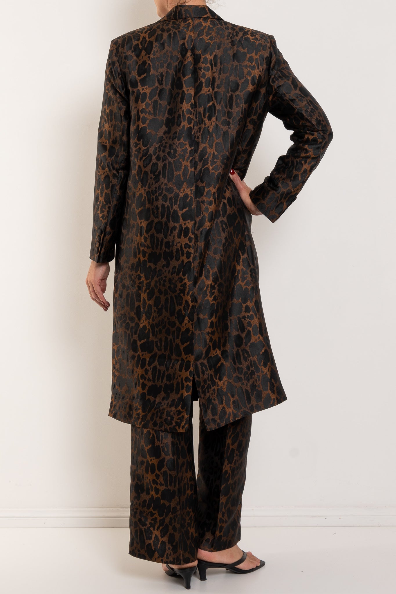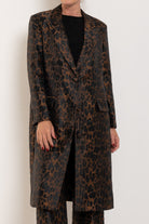 Crafted in a rich leopard-inspired jacquard, the Bellhop Coat makes a confident statement while maintaining an elegant, timeless silhouette. The structured tailoring, sharp lapels and clean button front create a refined foundation, while the bold pattern brings depth, texture and personality. Falling to a flattering mid-length, this coat layers beautifully over everything from sleek dresses to relaxed denim. Worn open for effortless drama or cinched with a belt for a more defined silhouette, the Bellhop Coat captures the expressive spirit that makes M.A. Dainty so distinctive.