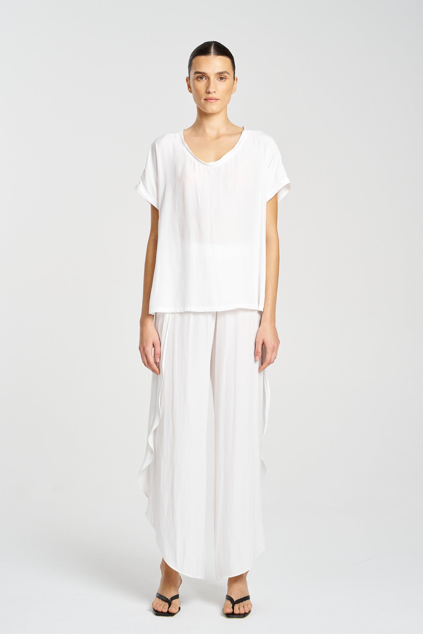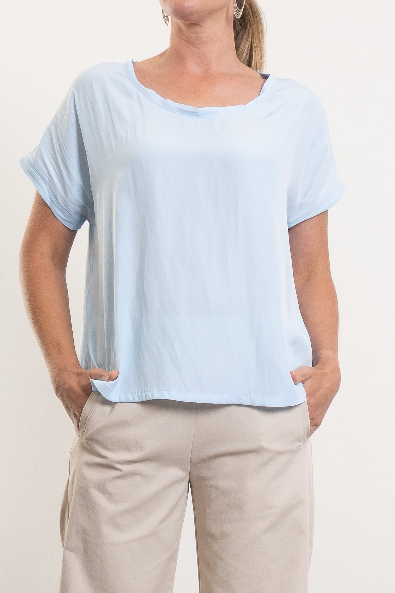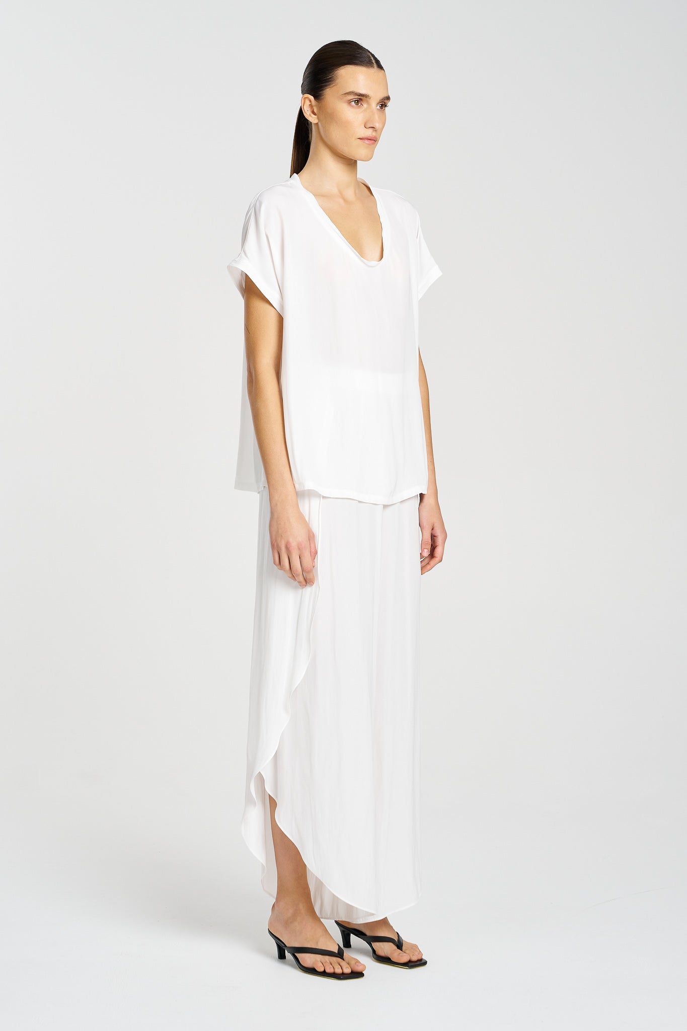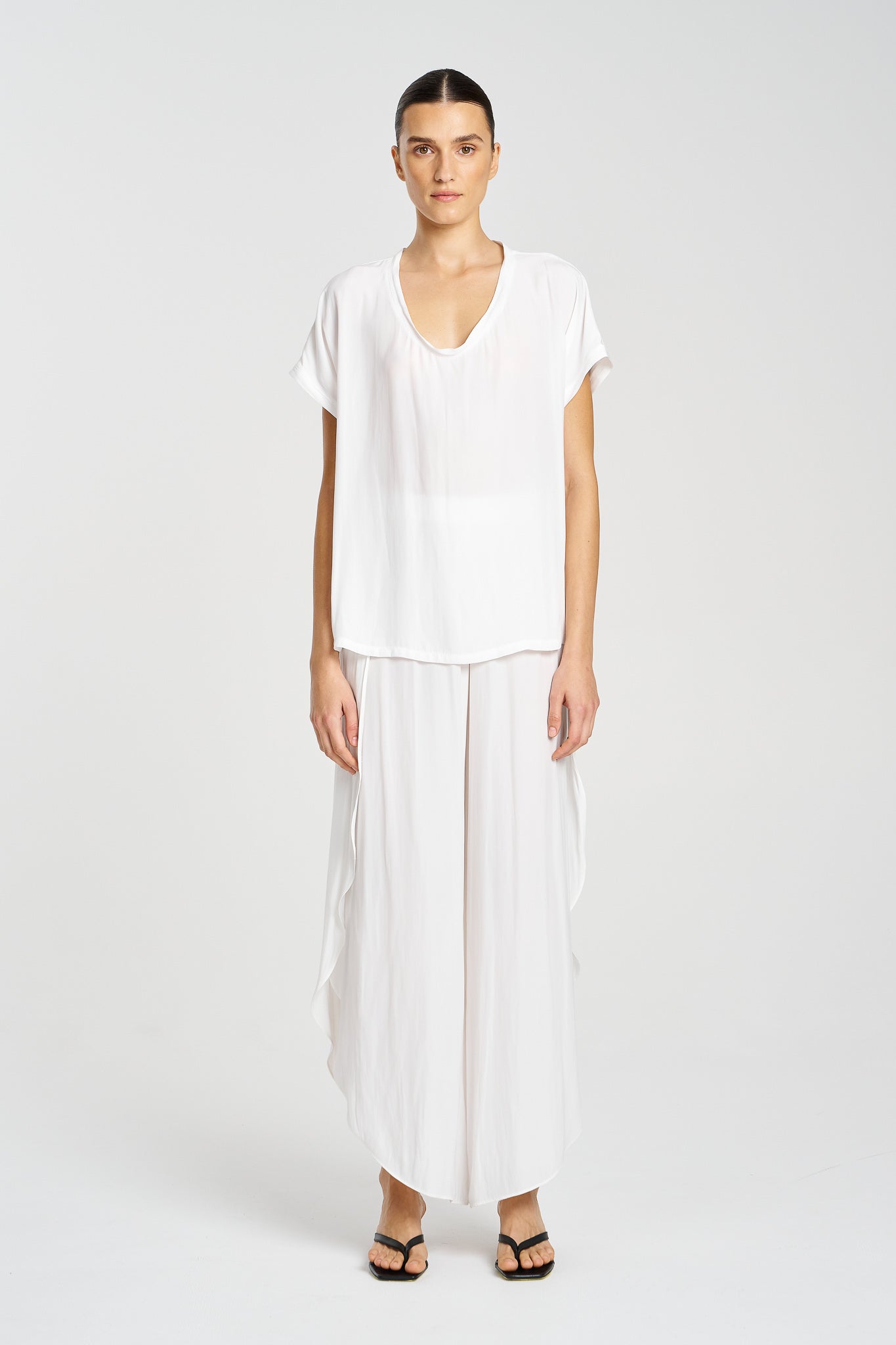 Made in Australia from Mela Purdie’s signature Mache—known for its soft drape and subtle sheen—the Cruise Shell is the kind of piece you’ll reach for again and again. The relaxed fit, cap sleeves and gently curved hem make it beautifully easy to wear, whether you’re styling it loose over pants or layering it under a jacket. Available in crisp White, classic Black, and Vista—a soft, pale blue that flatters all skin tones.