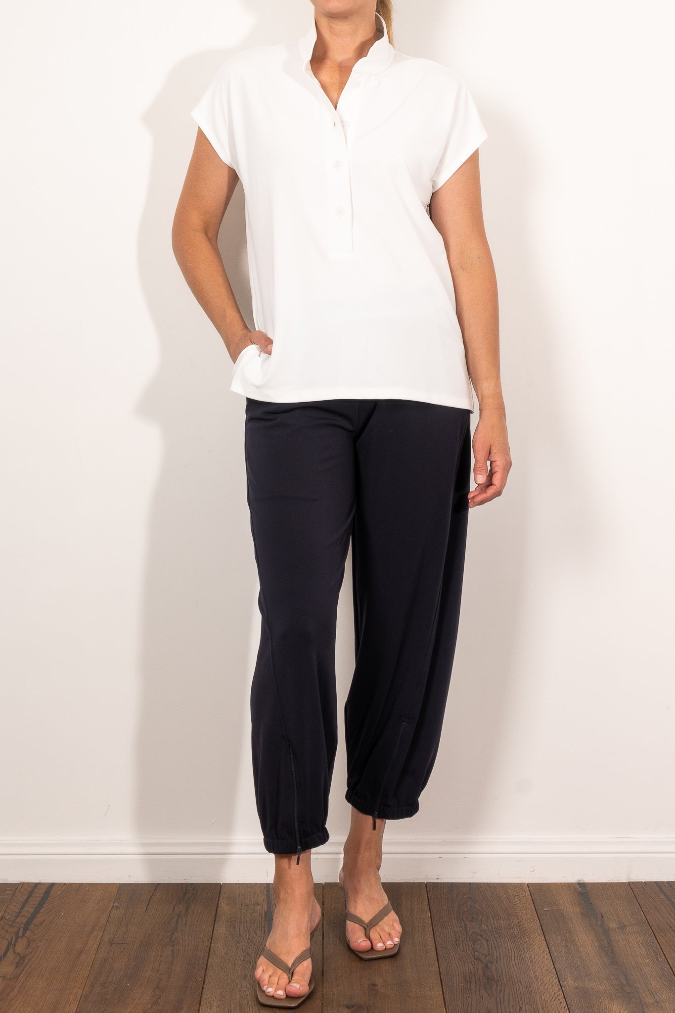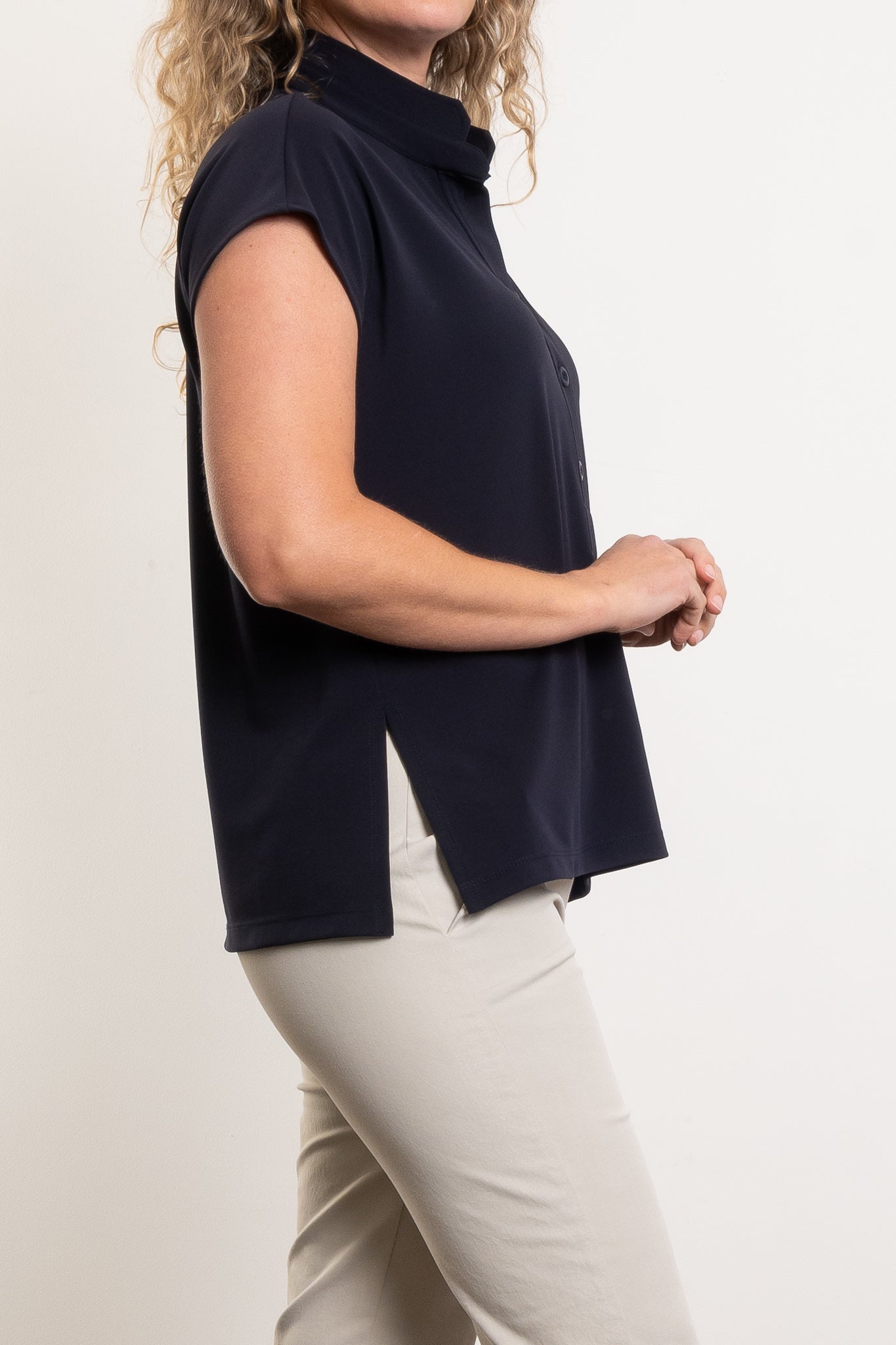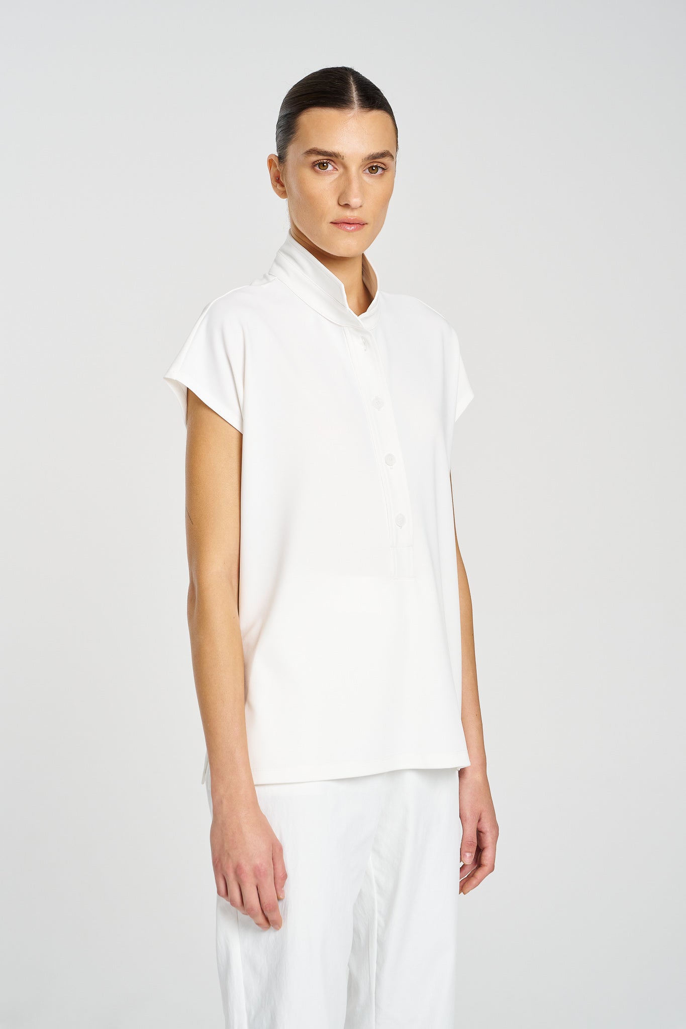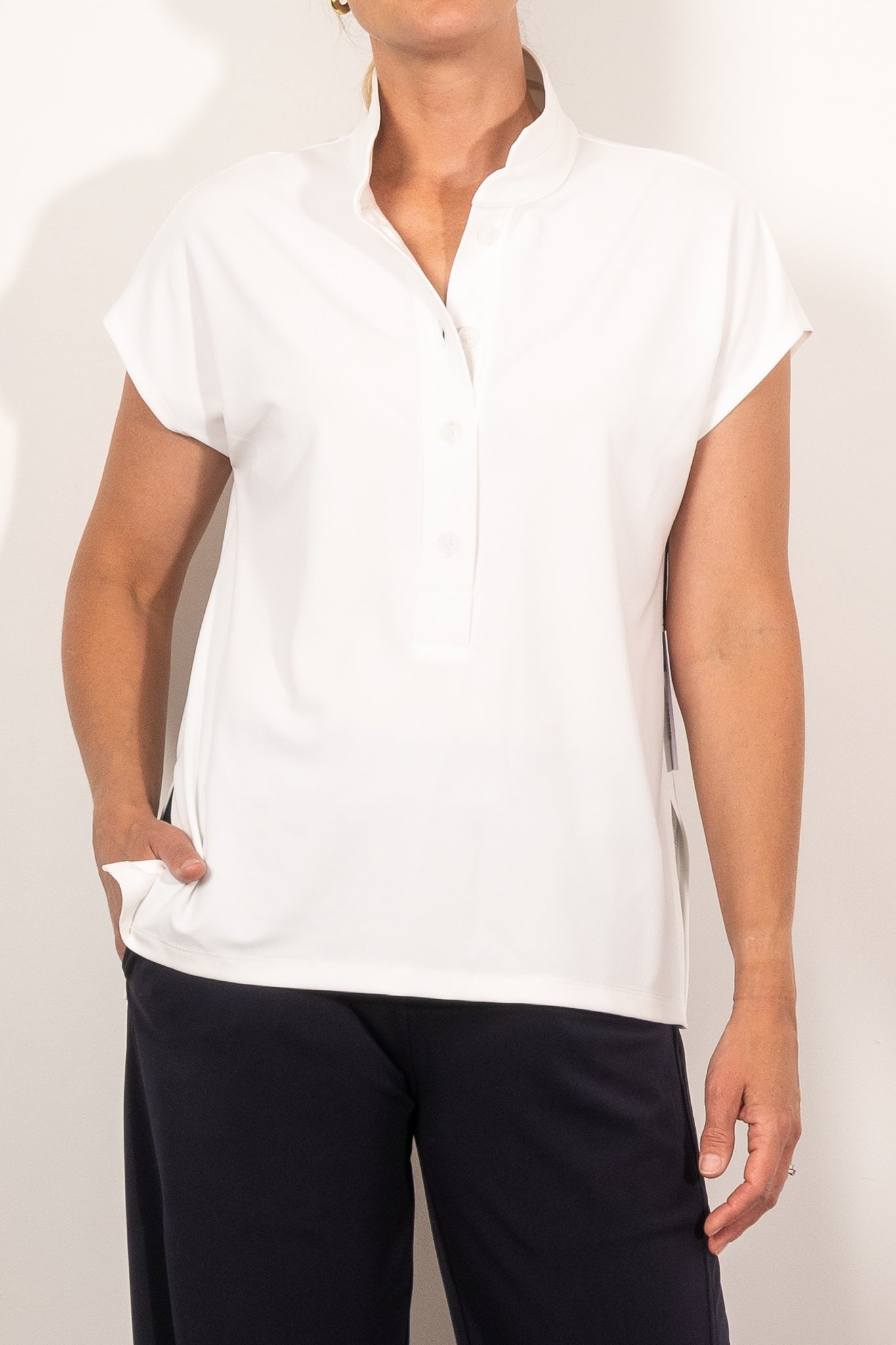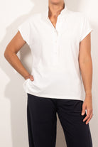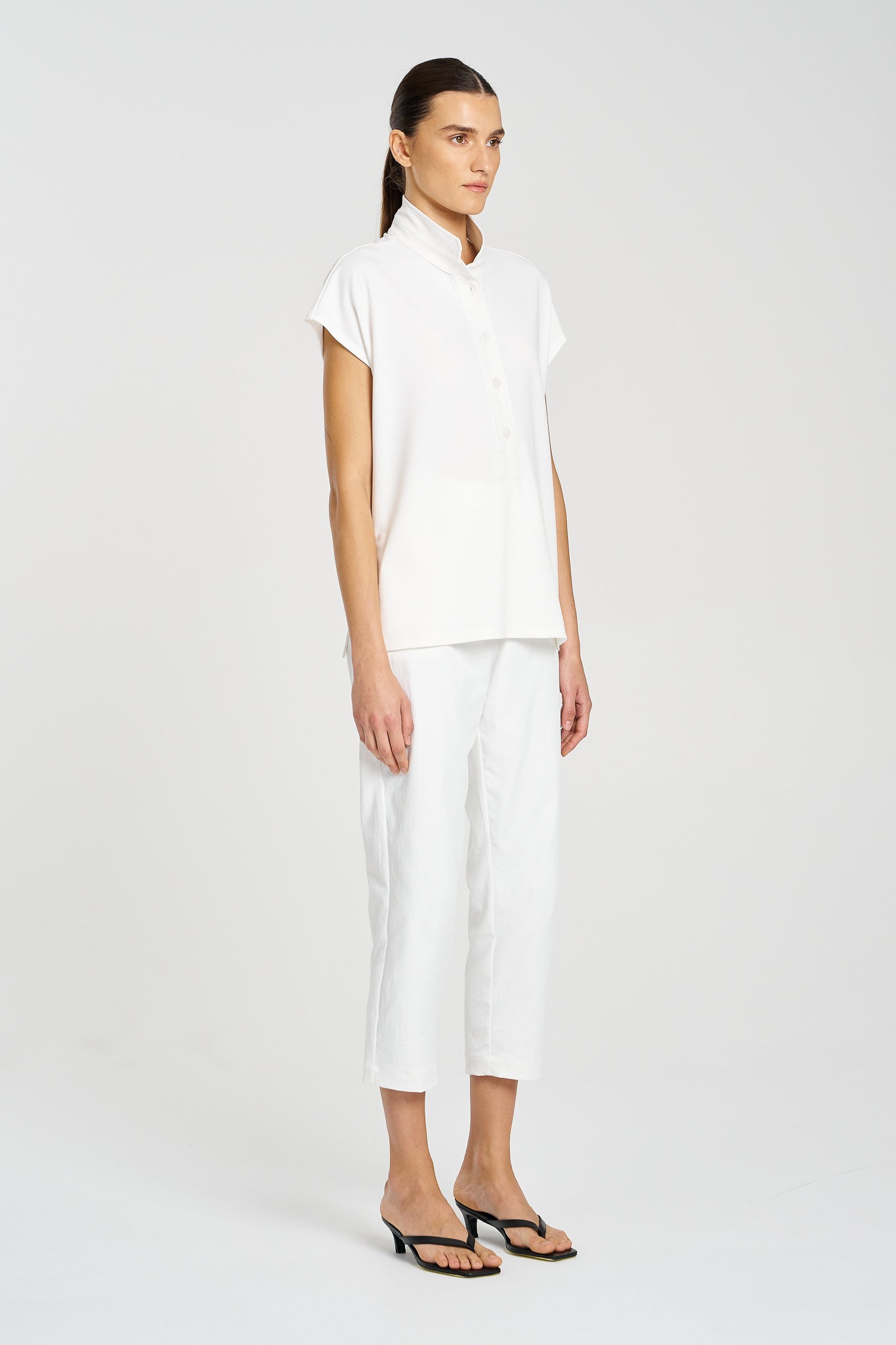 The Henly Tank is crafted from Mela Purdie’s Powder Knit—lightweight, crease-resistant and softly structured with a matte finish. The stand collar and tab button detailing add a tailored touch, while the relaxed silhouette and cap sleeves keep it easy and wearable. Designed to skim the body with gentle drape, this is the kind of top that works across seasons and settings—layered under jackets, worn loose over pants, or tucked in for a more polished look. Available in Cream, Navy, and Black.