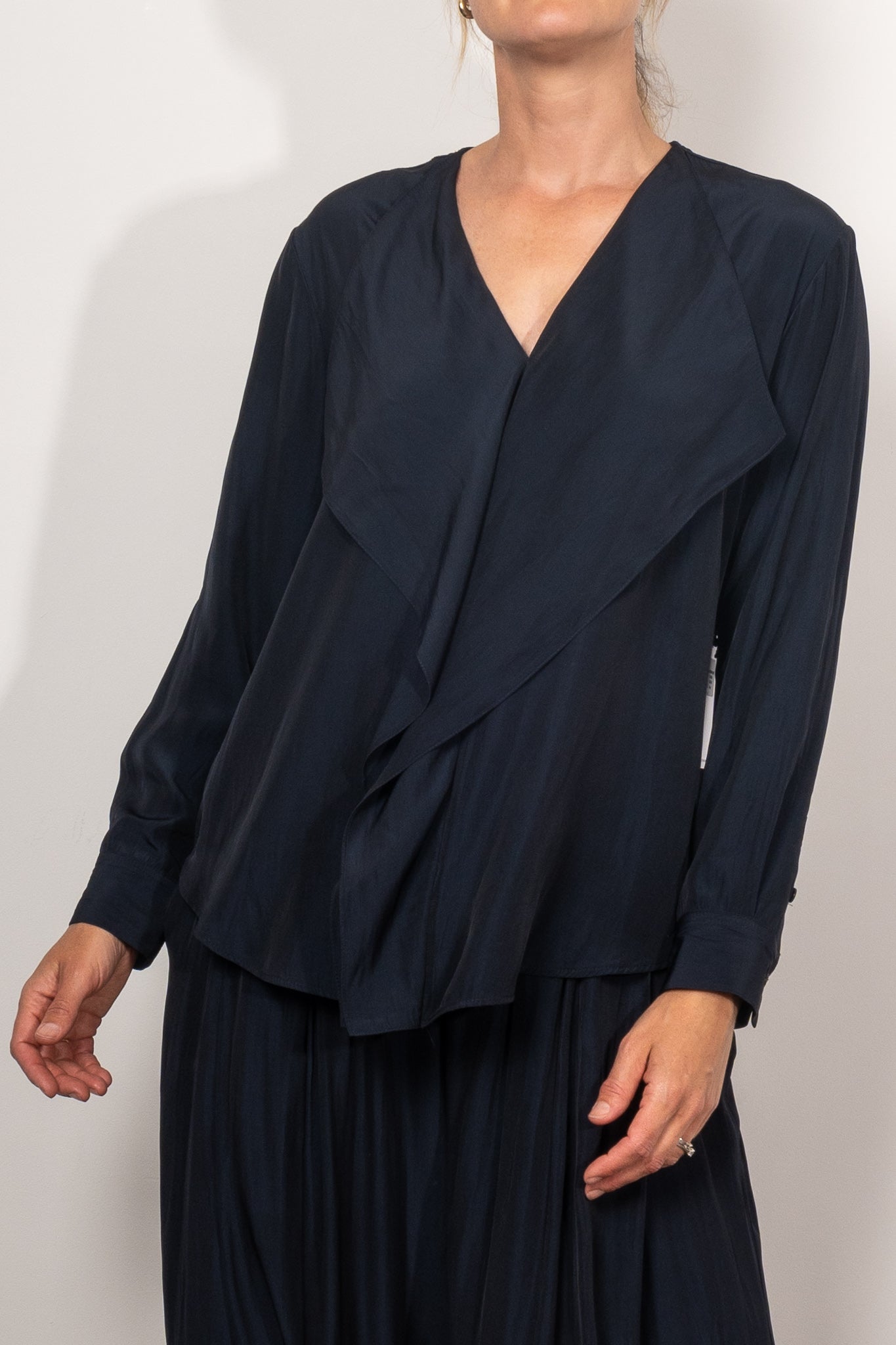 Elevate your style with the Mela Purdie Maxi Ribbon Shirt Mache. Crafted from luxurious Mela Purdie Mache fabric, this shirt exudes relaxed fluidity and a smooth lustre surface. Featuring a wide soft front frill detail and full length sleeves with buttoned cuffs, this shirt is designed and made in Australia for the ultimate blend of comfort and style.