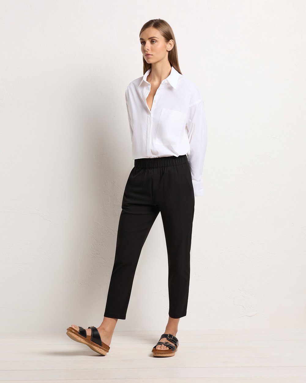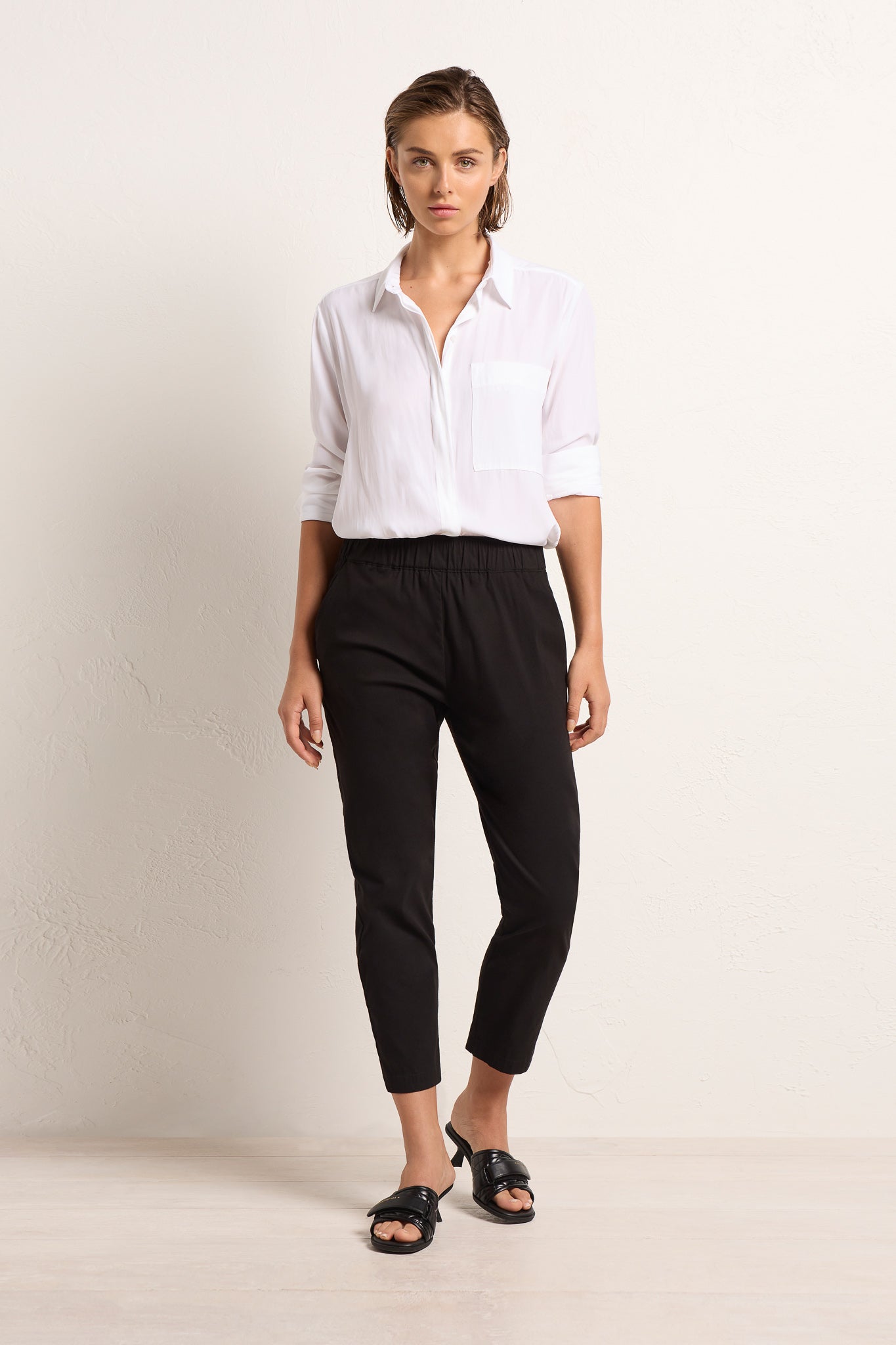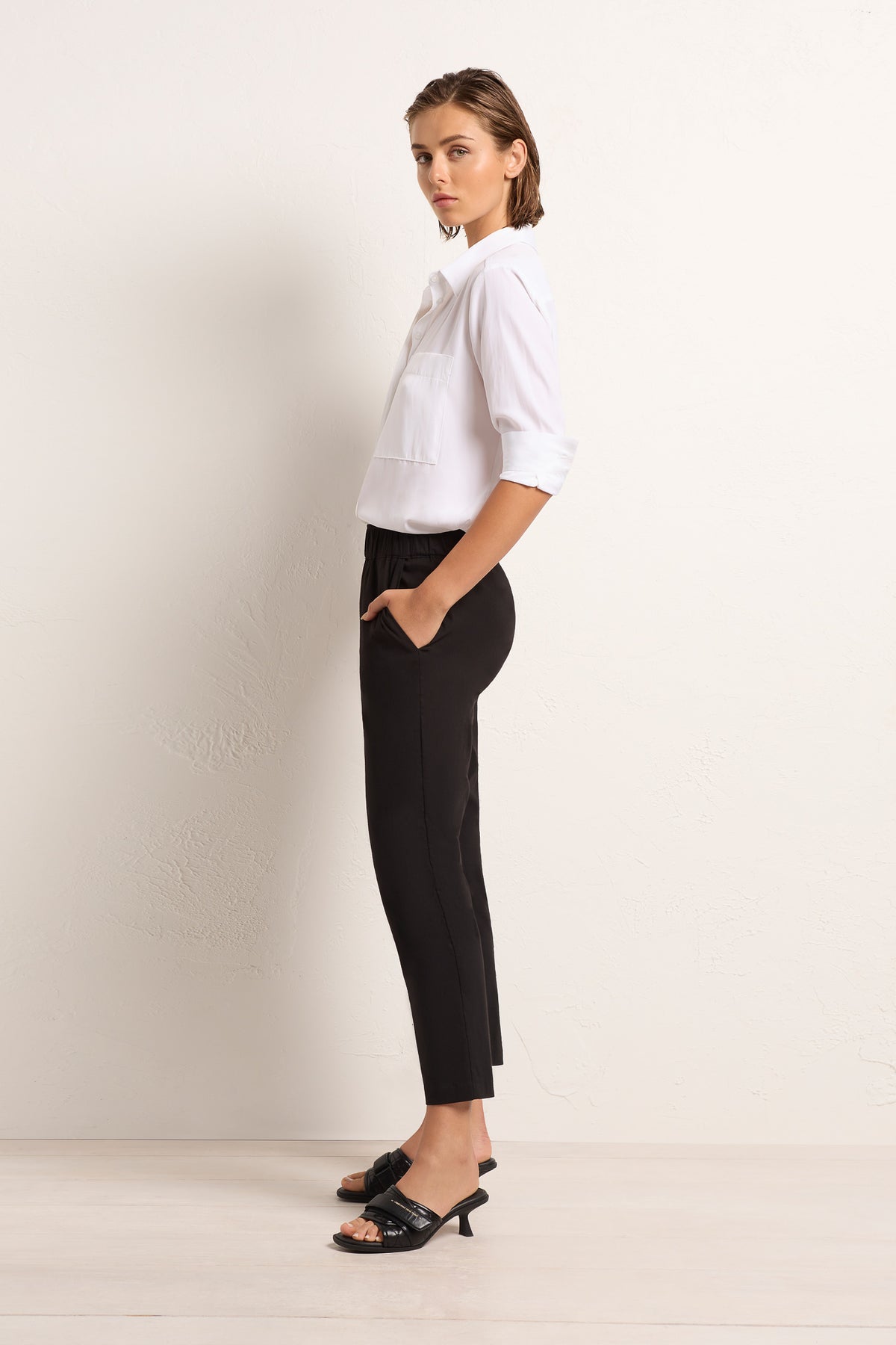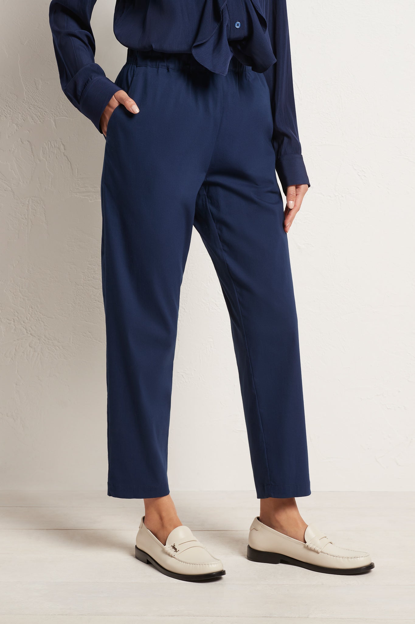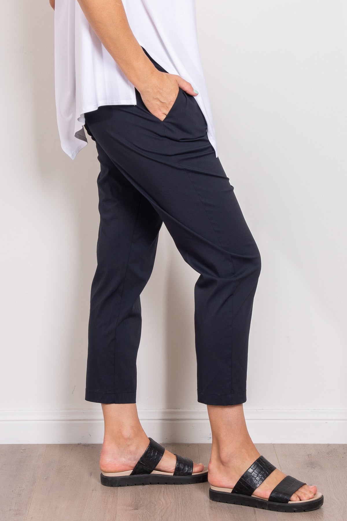 The Nomad Pant is made from Mela’s Microprene fabric. The Nomad pant comes in a 7/8 length and features an elasticated waistband and two slit pockets in a slim fit. This fabric has a smooth finish and a tapered cut making it super flattering on any figure. The Nomad is an incredibly versatile and comfortable pant for all seasons but is particularly suited to spring /summer thanks to its incredible light, breathable stretch cotton fabrication.