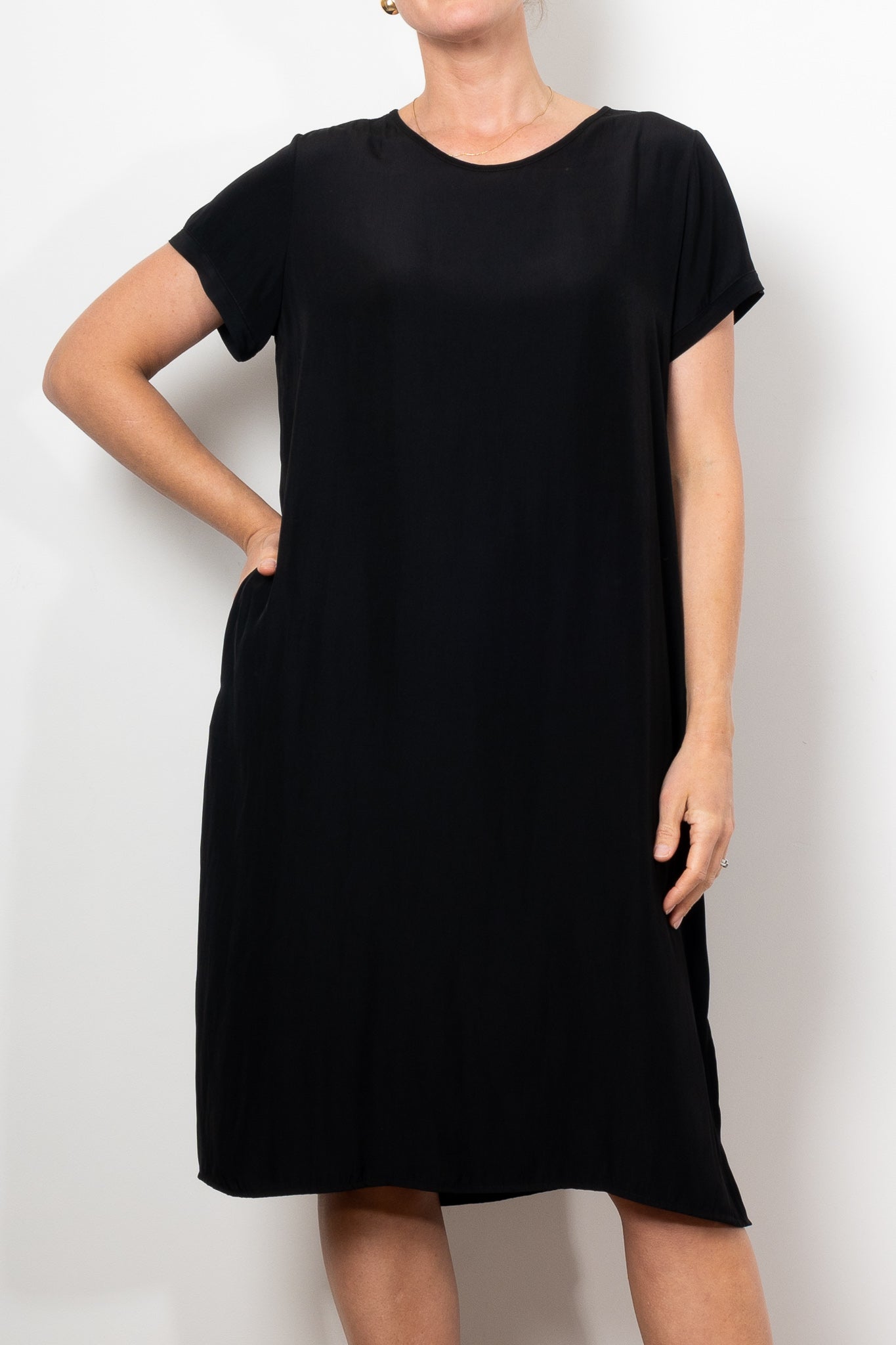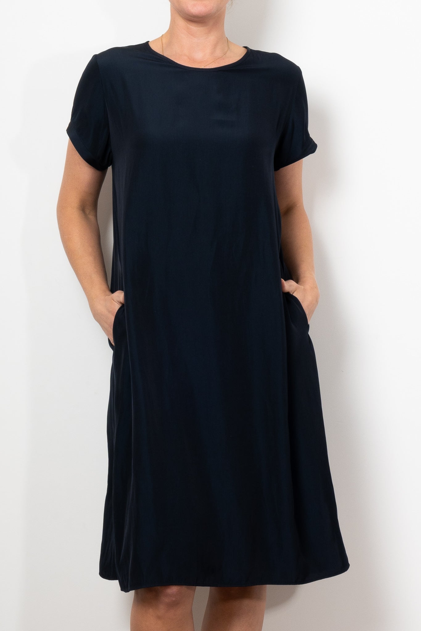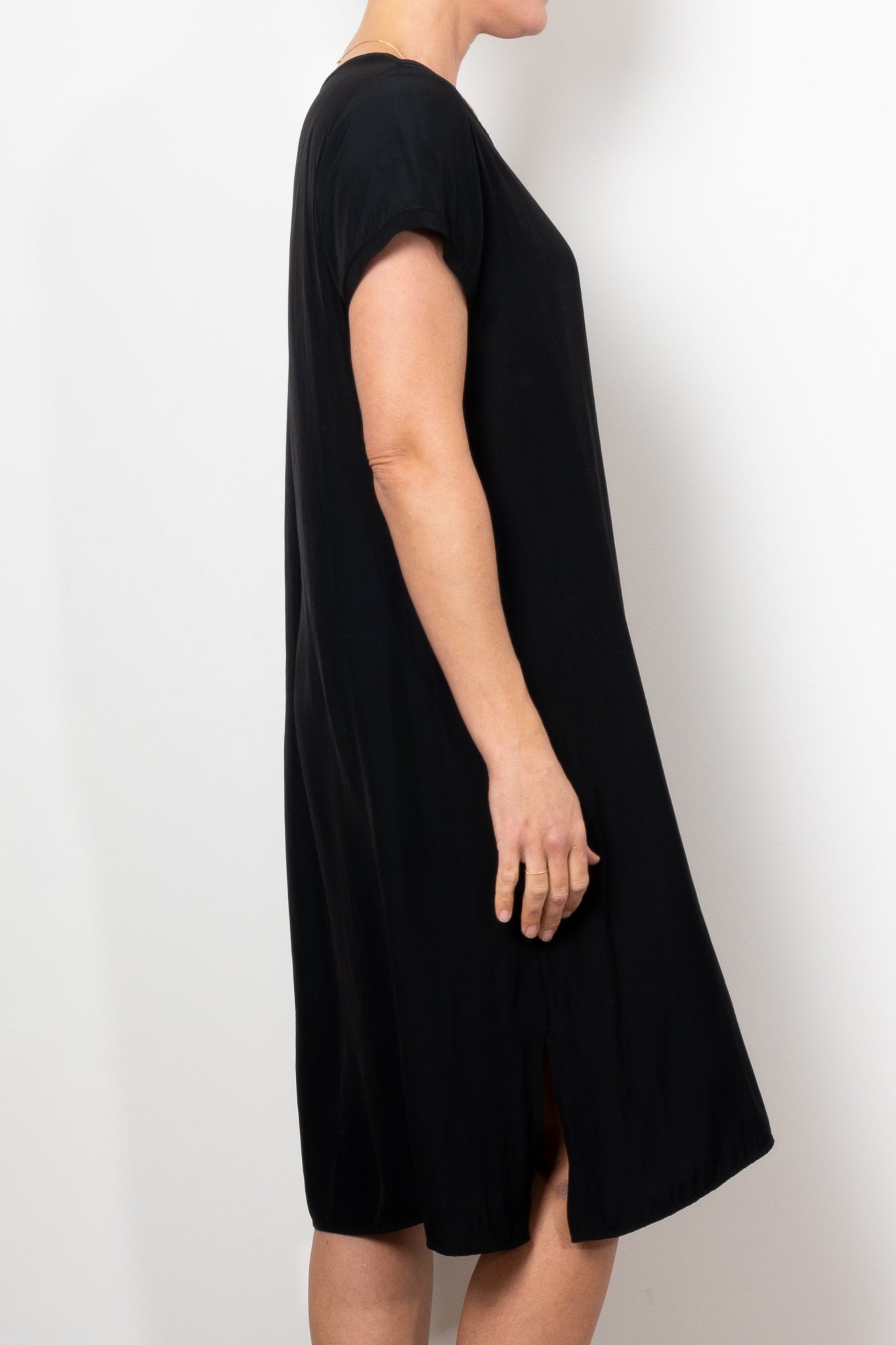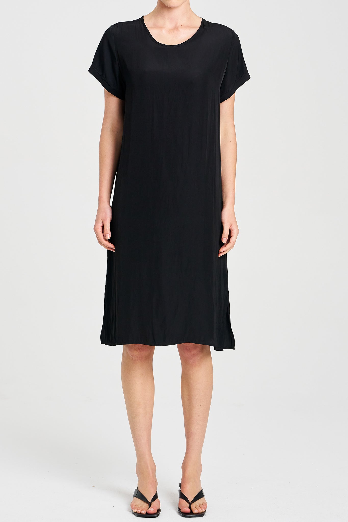 Crafted in Mela Purdie’s signature Mache fabric, this luxury travel essential solves the eternal “what to wear” dilemma. The silky-yet-practical finish flatters every shape, while the scoop neckline and short sleeves add just the right amount of femininity. Side seam pockets bring ease and functionality, making it a dress that works as hard as you do — from weekday errands to weekend escapes.