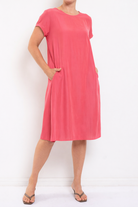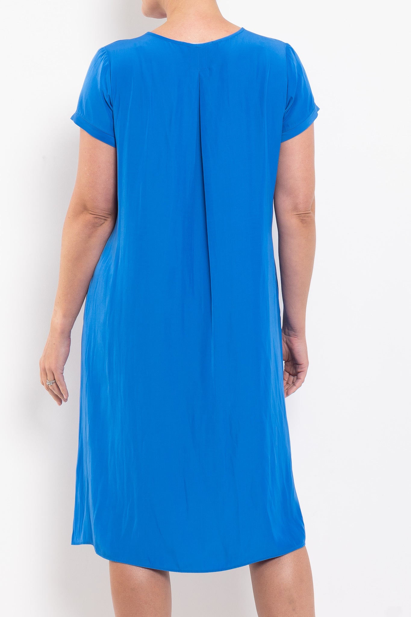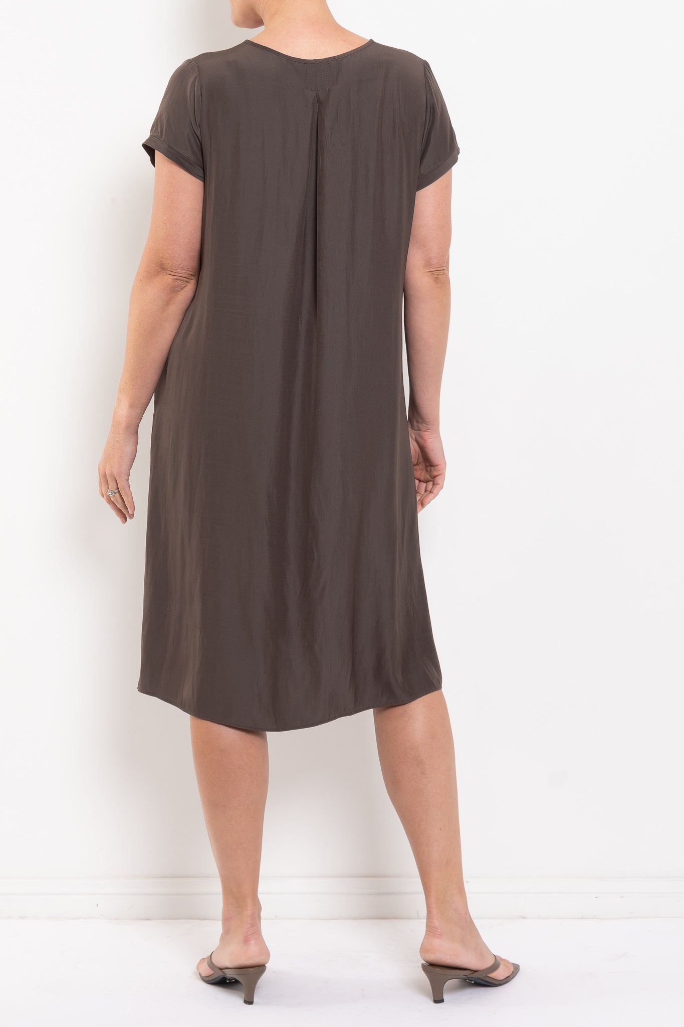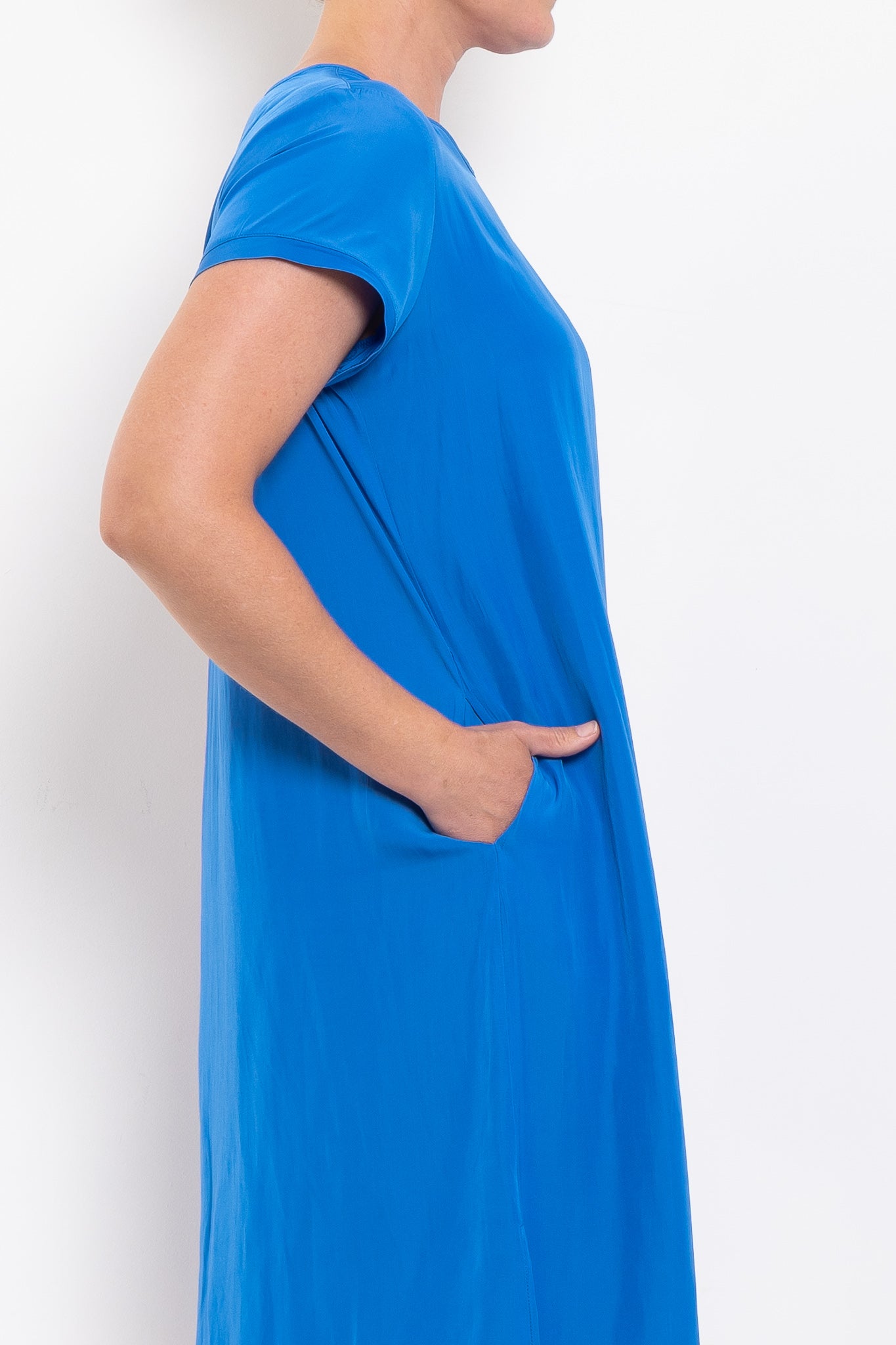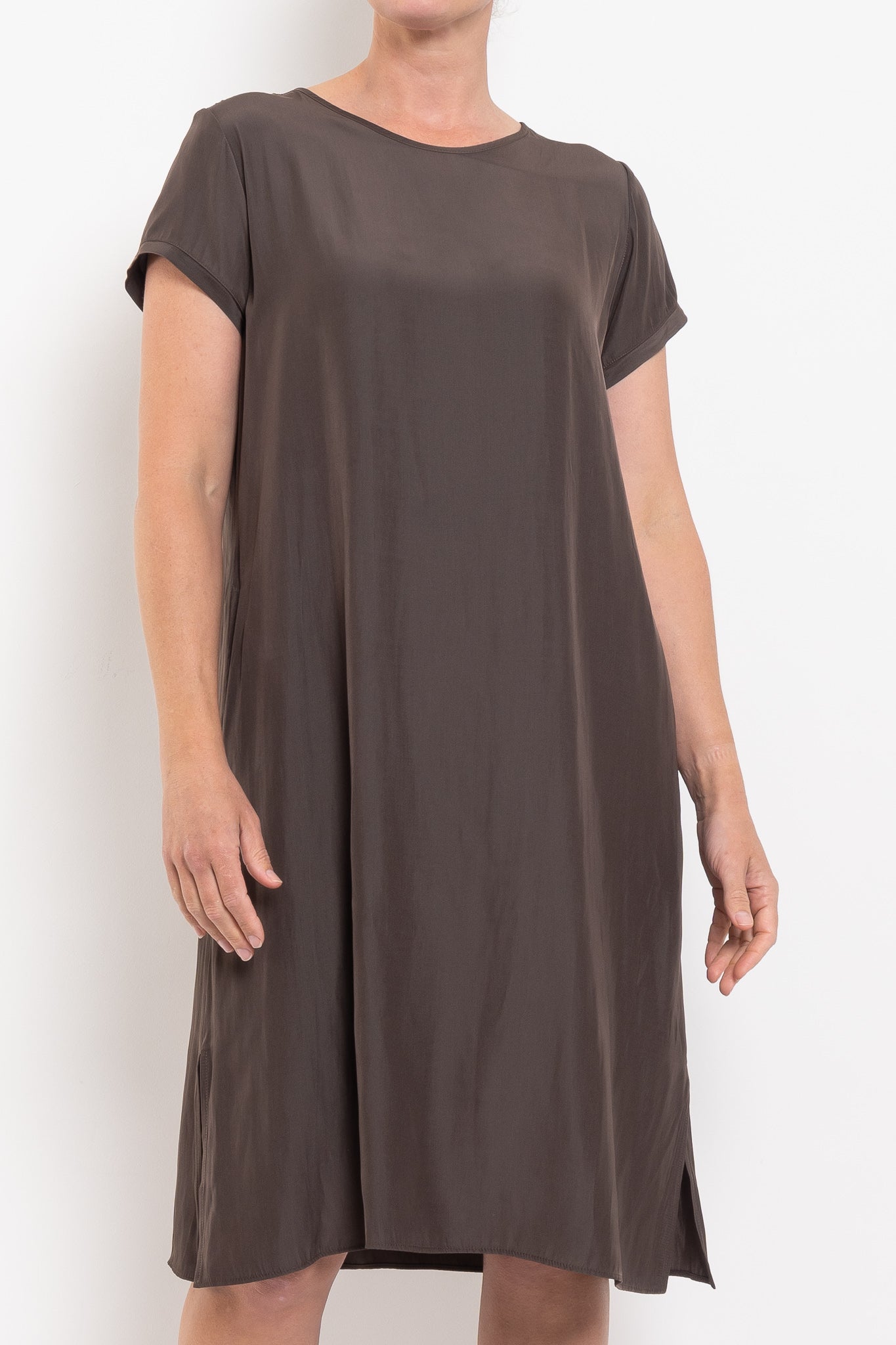 Crafted in Mela Purdie’s signature Mache fabric, this luxury travel essential solves the eternal “what to wear” dilemma. The silky-yet-practical finish flatters every shape, while the scoop neckline and short sleeves add just the right amount of femininity. Side seam pockets bring ease and functionality, making it a dress that works as hard as you do — from weekday errands to weekend escapes.