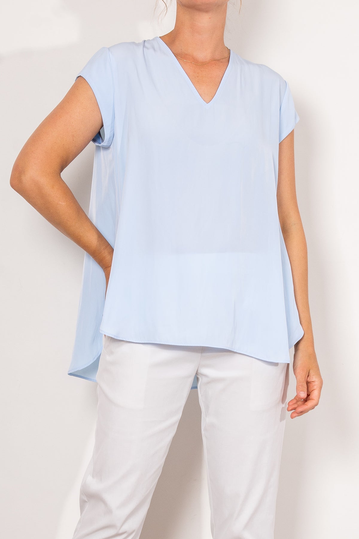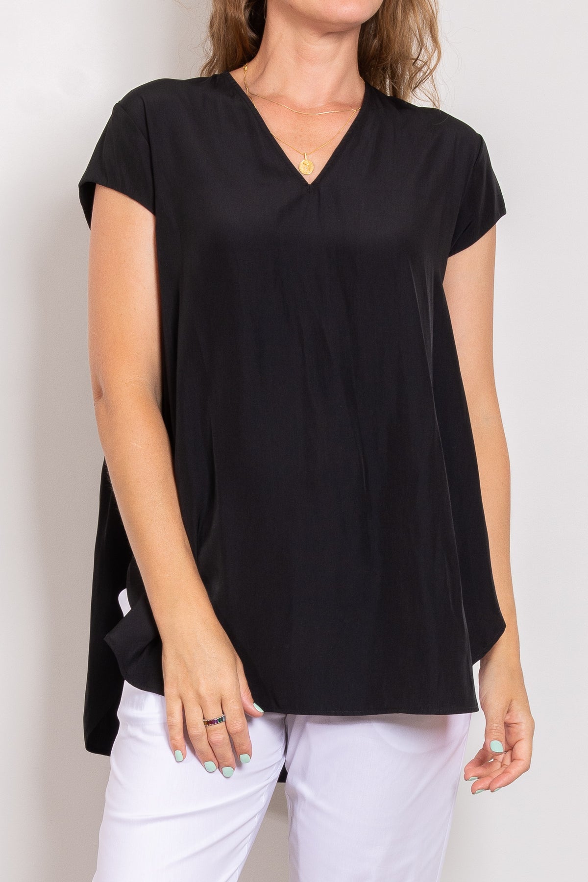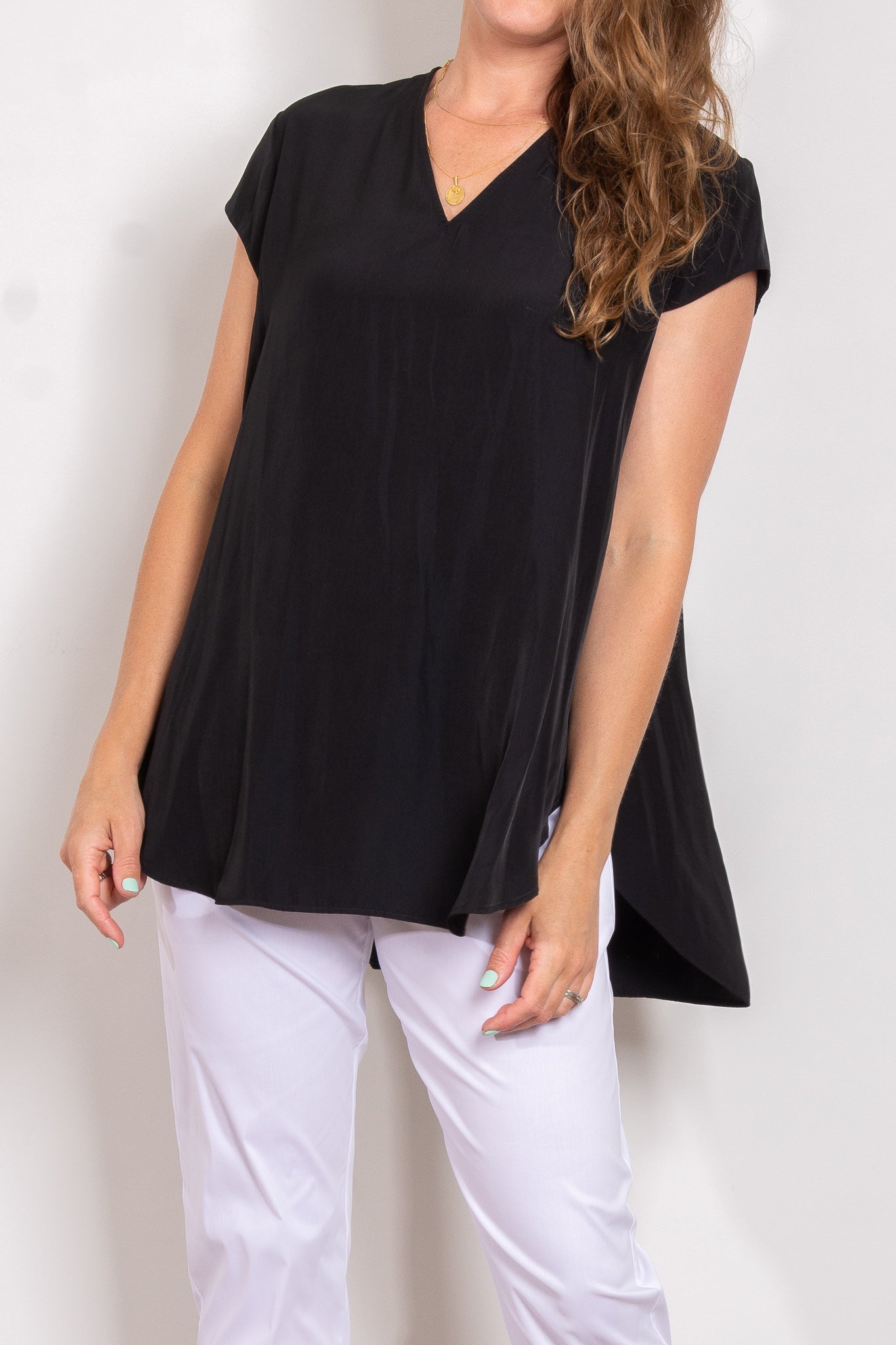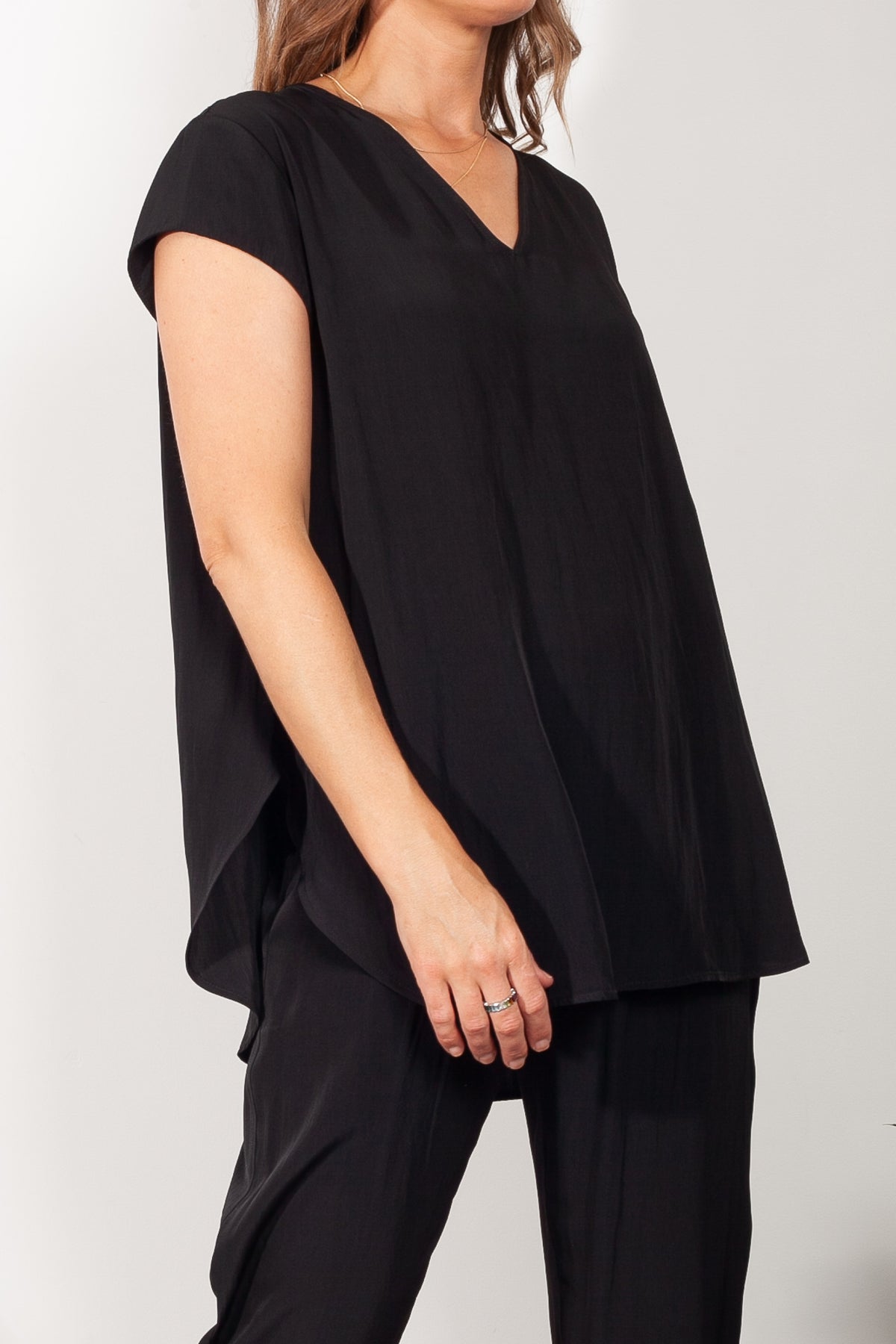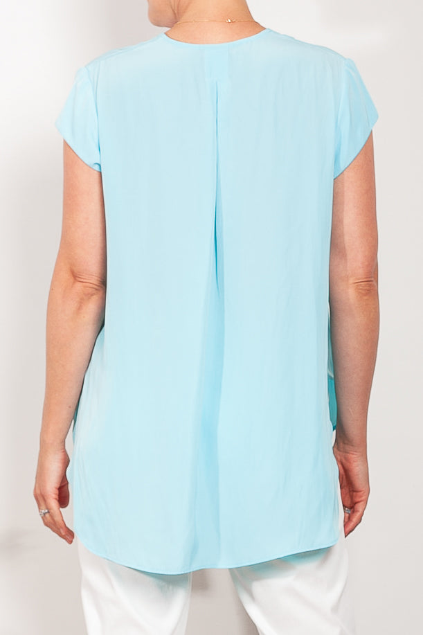 Crafted from Mela Purdie's fluid Mache, the Glide Top is cut for a slightly loose, A-line fit that is comfortable and figure flattering. With a longer length and curved hemline, this style features capped sleeves and a V Neckline.