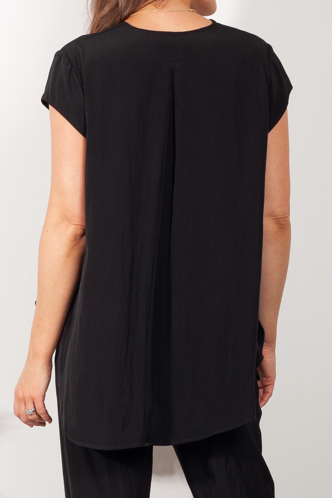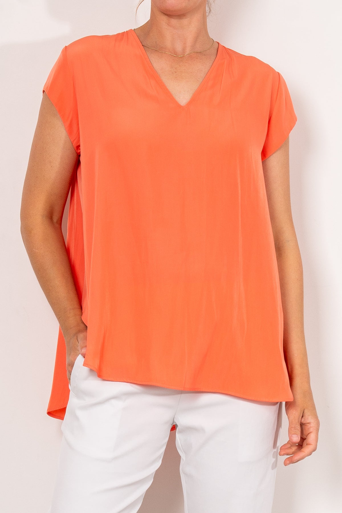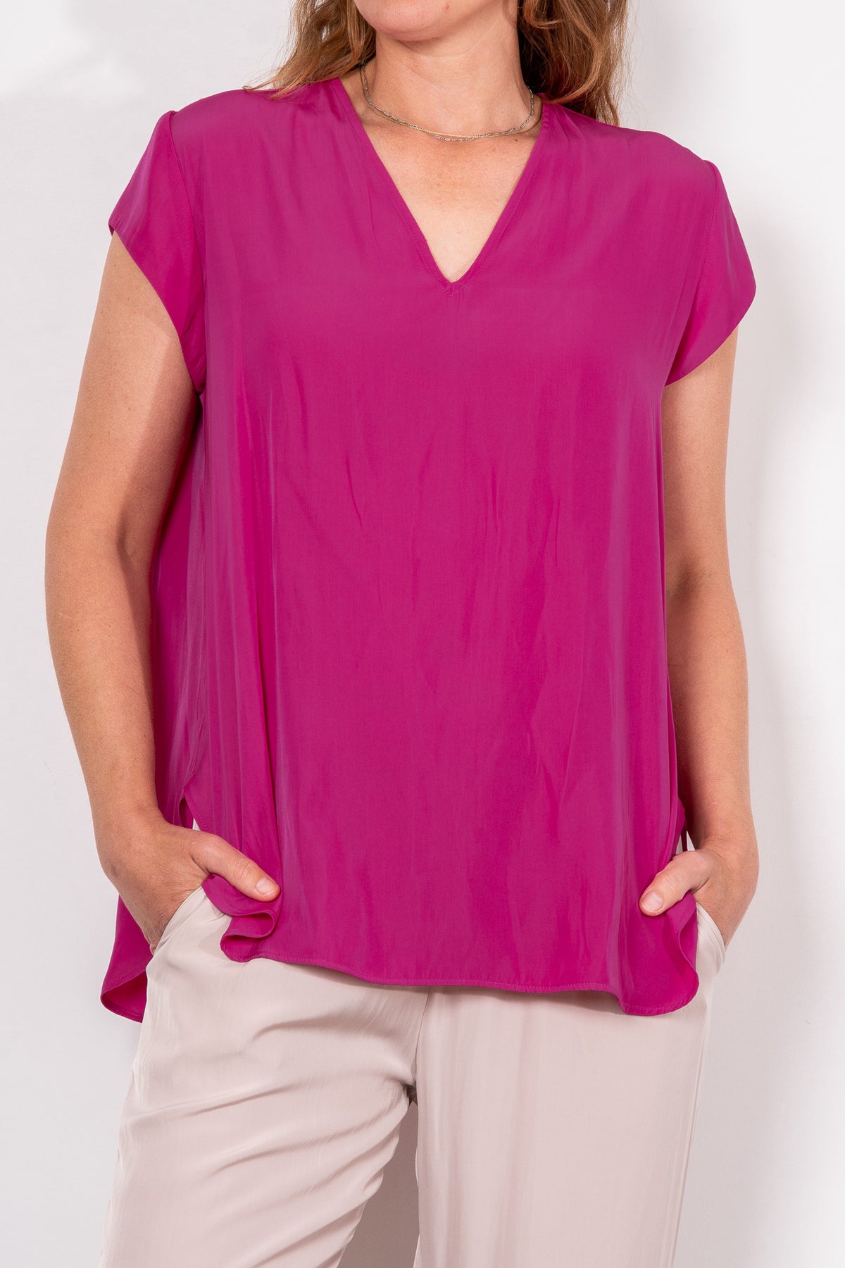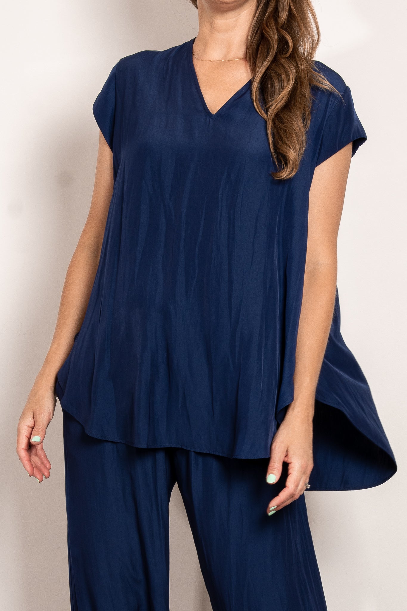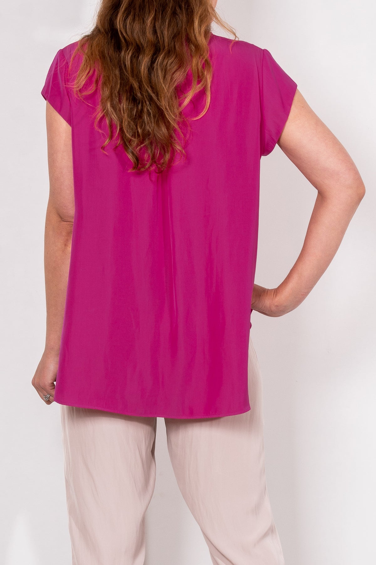Crafted from Mela Purdie's fluid Mache, the Glide Top is cut for a slightly loose, A-line fit that is comfortable and figure flattering. With a longer length and curved hemline, this style features capped sleeves and a V Neckline.
