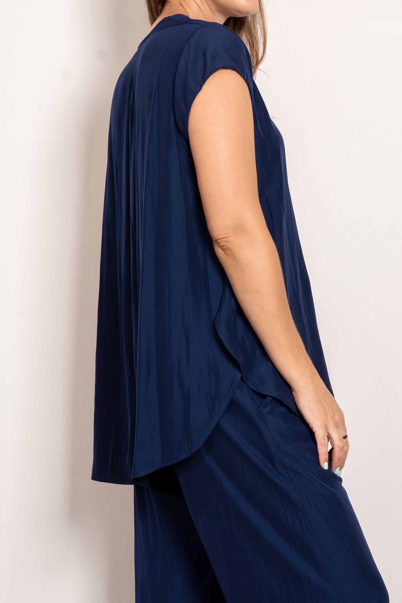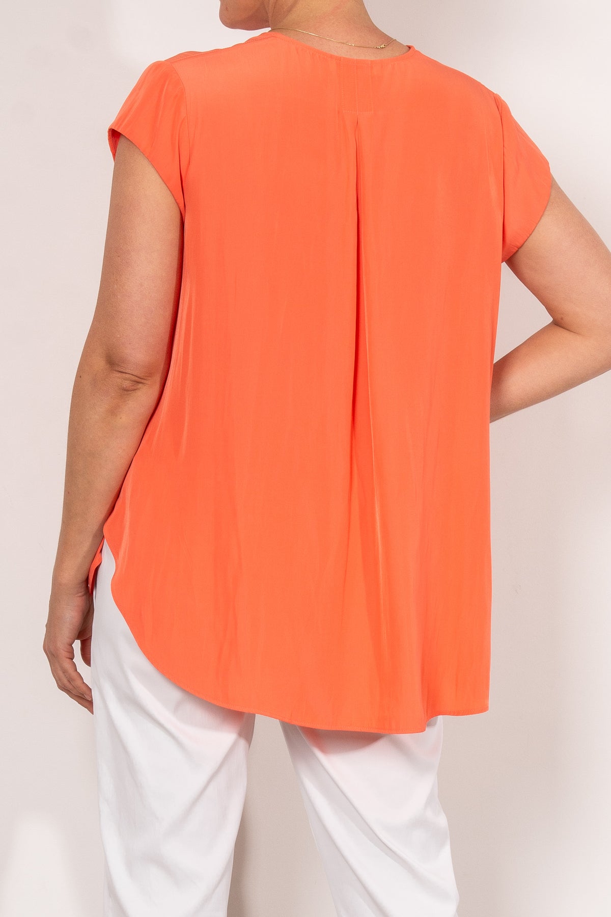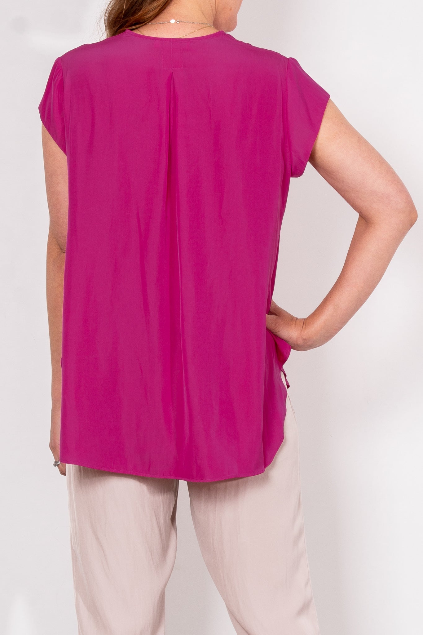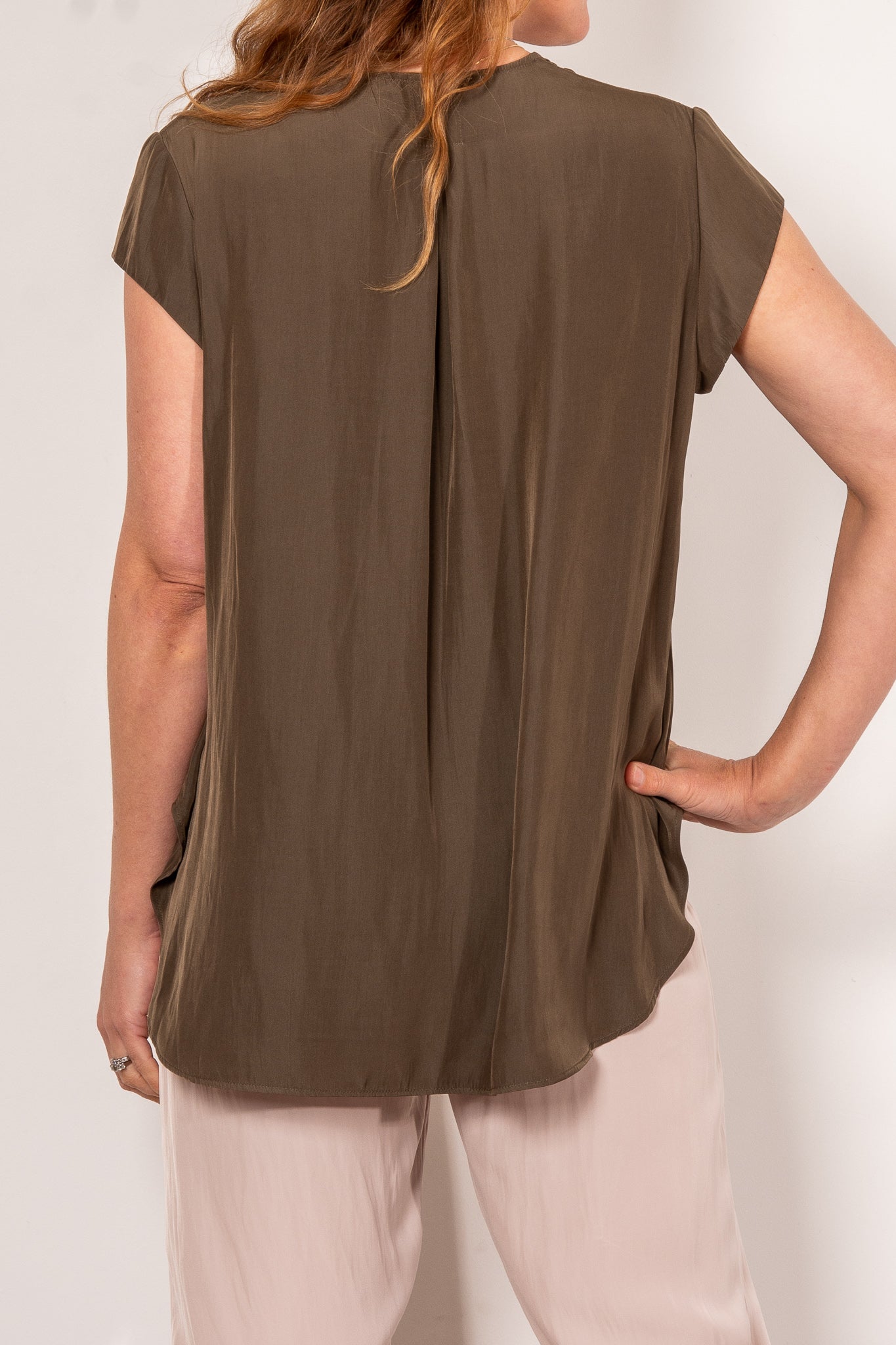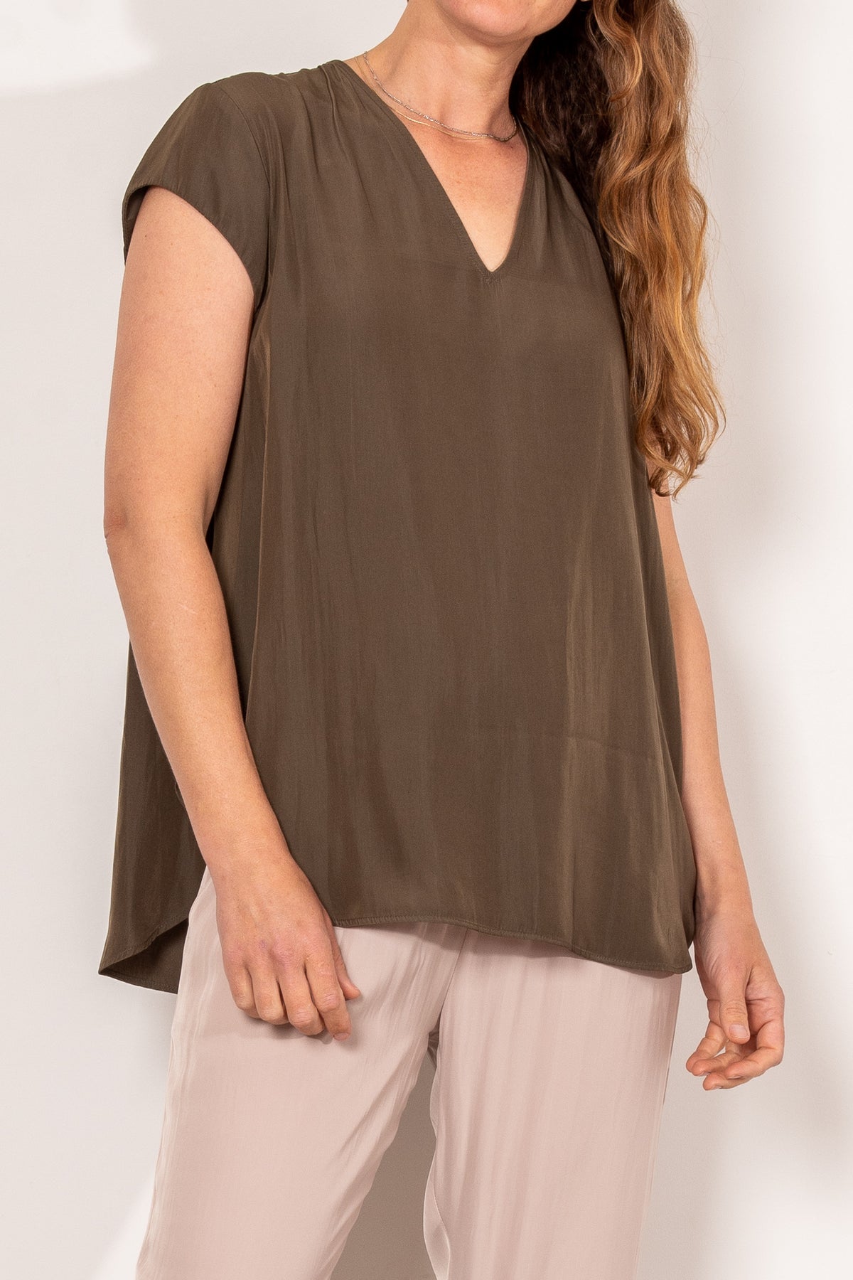 Crafted from Mela Purdie's fluid Mache, the Glide Top is cut for a slightly loose, A-line fit that is comfortable and figure flattering. With a longer length and curved hemline, this style features capped sleeves and a V Neckline.