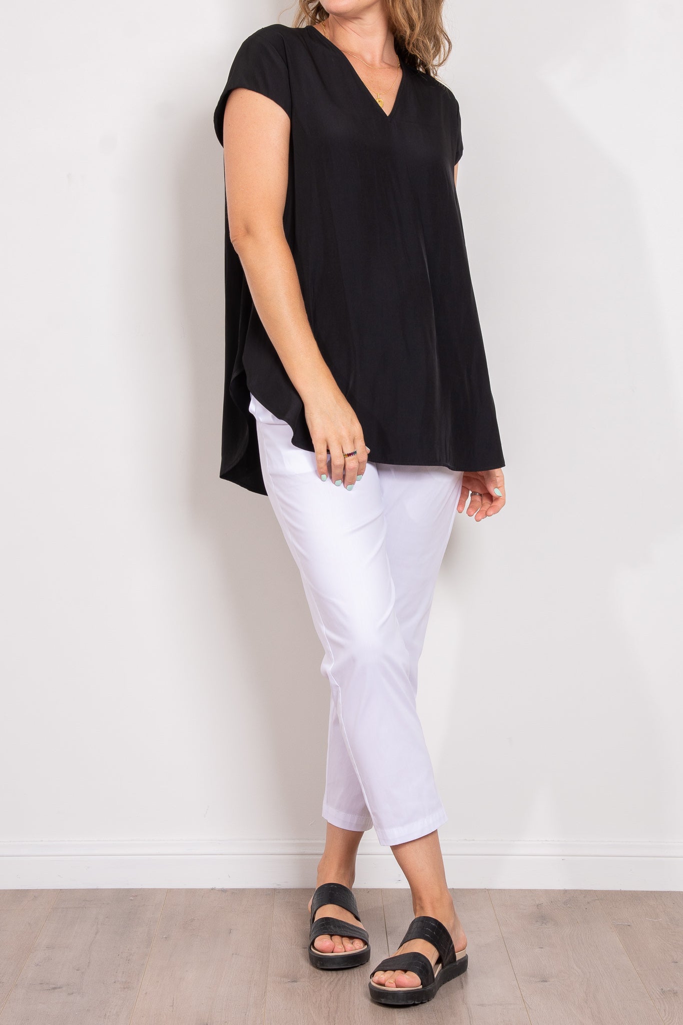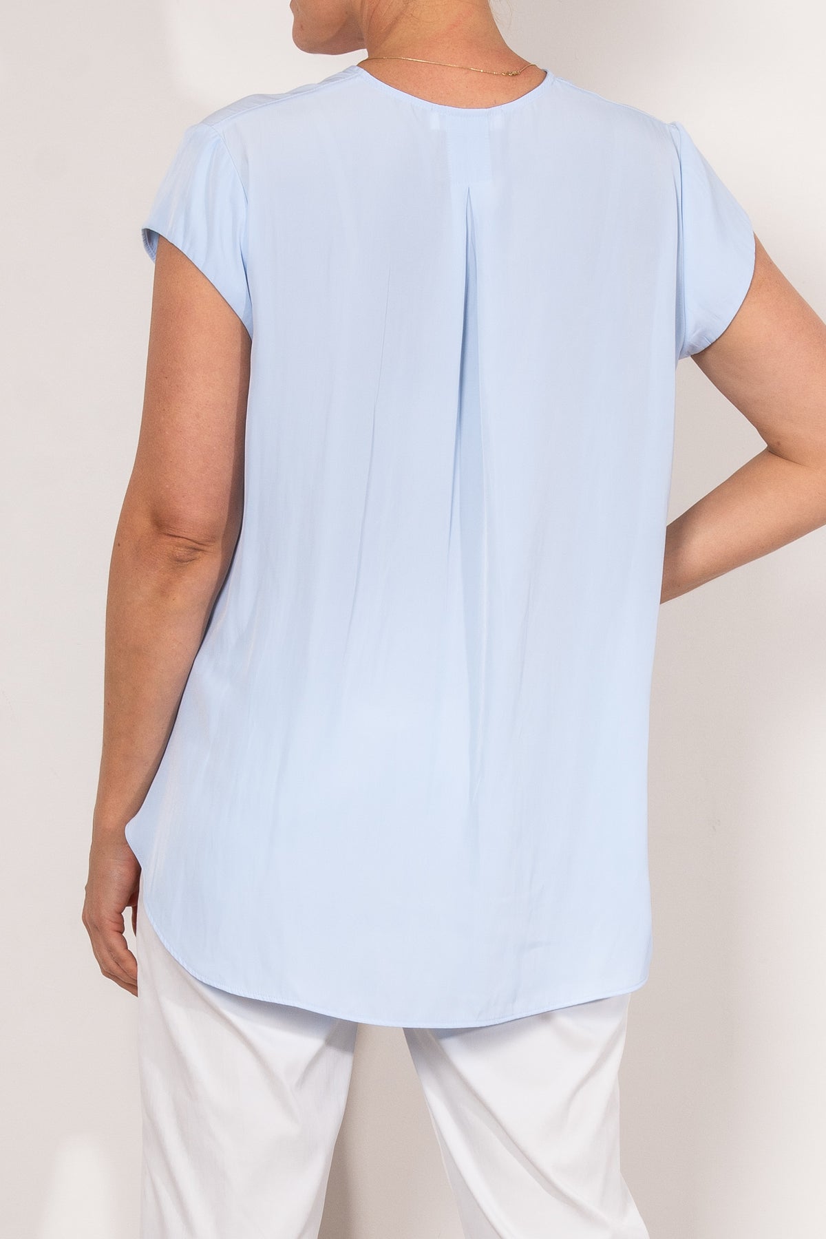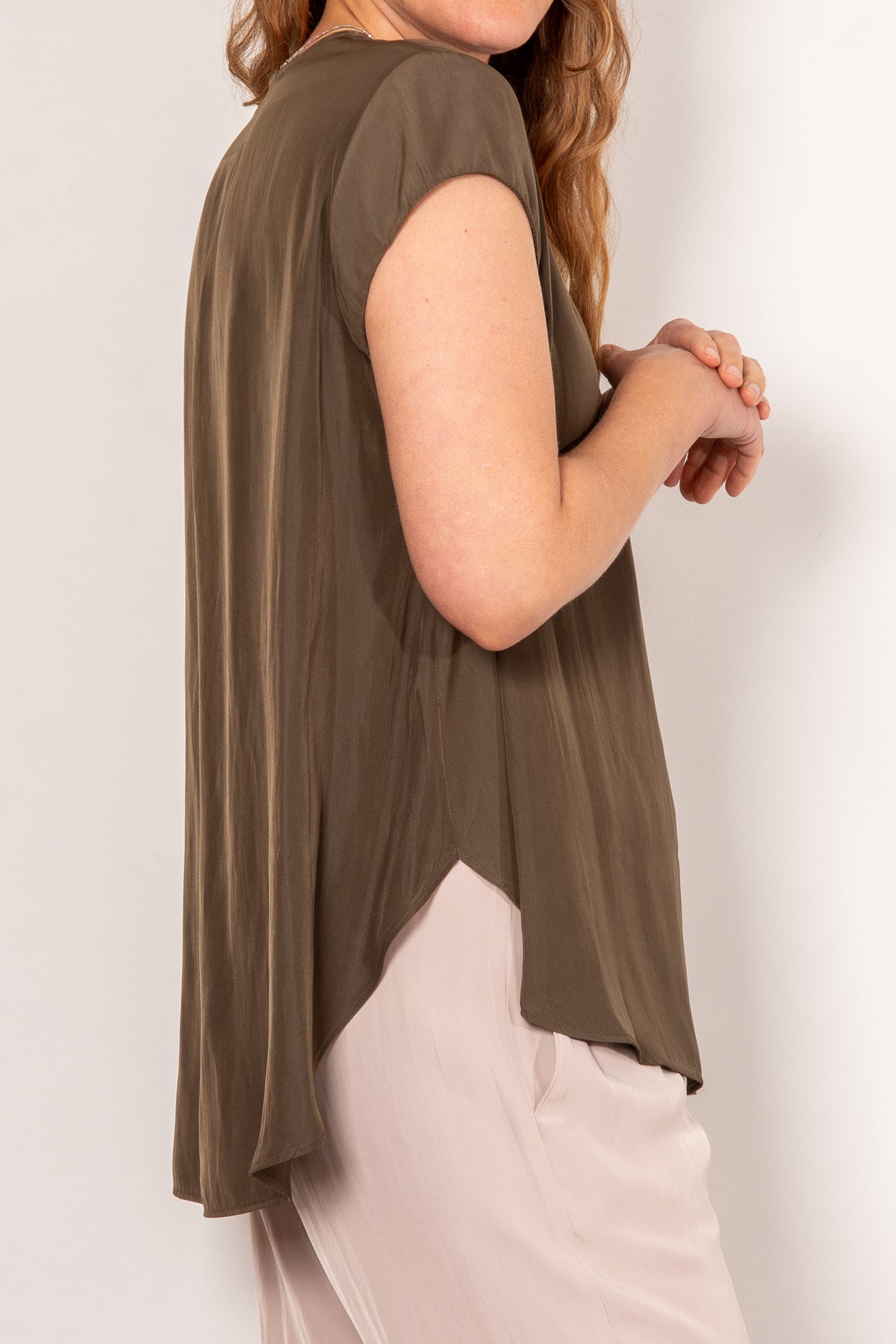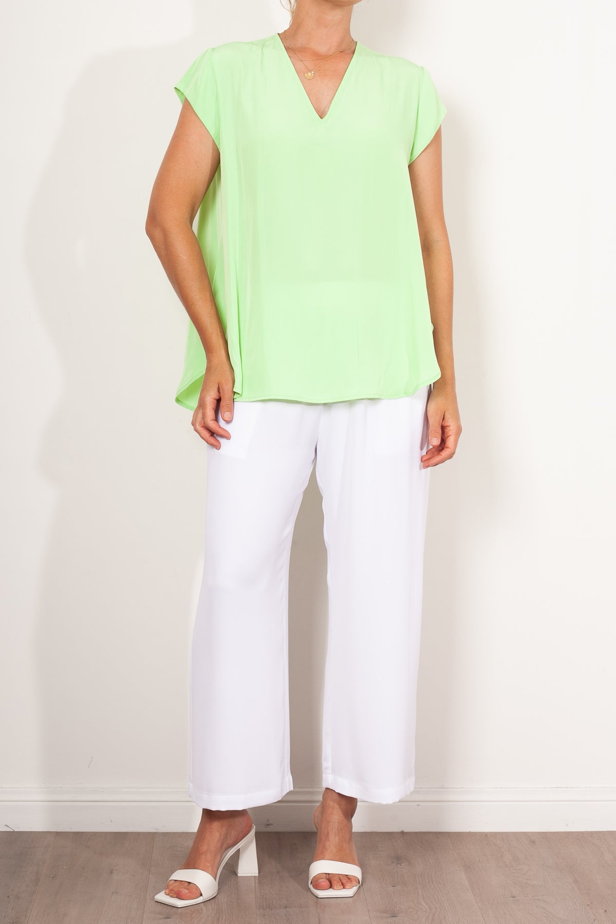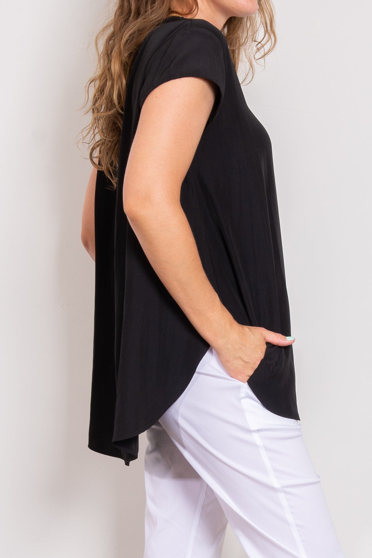 Crafted from Mela Purdie's fluid Mache, the Glide Top is cut for a slightly loose, A-line fit that is comfortable and figure flattering. With a longer length and curved hemline, this style features capped sleeves and a V Neckline.