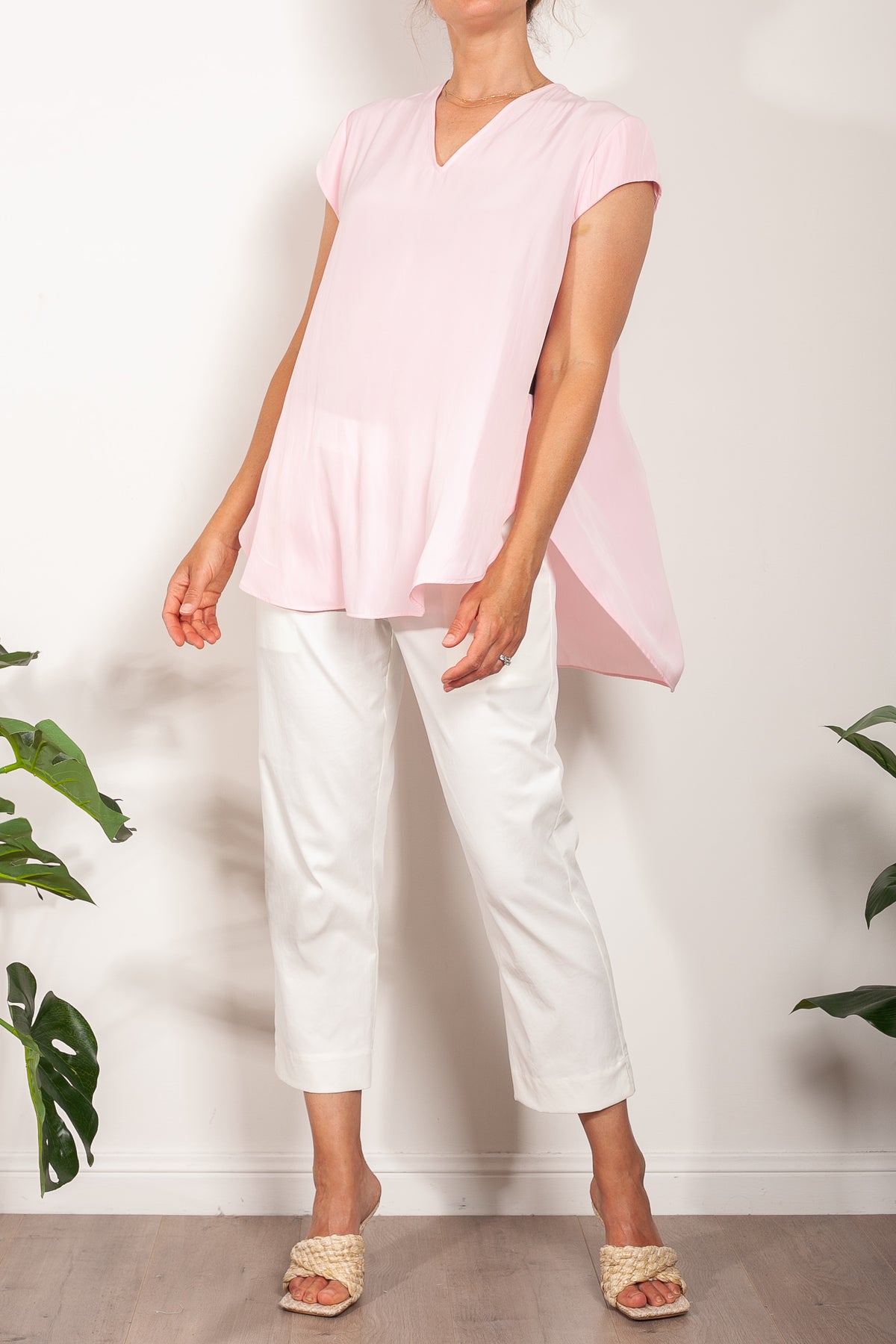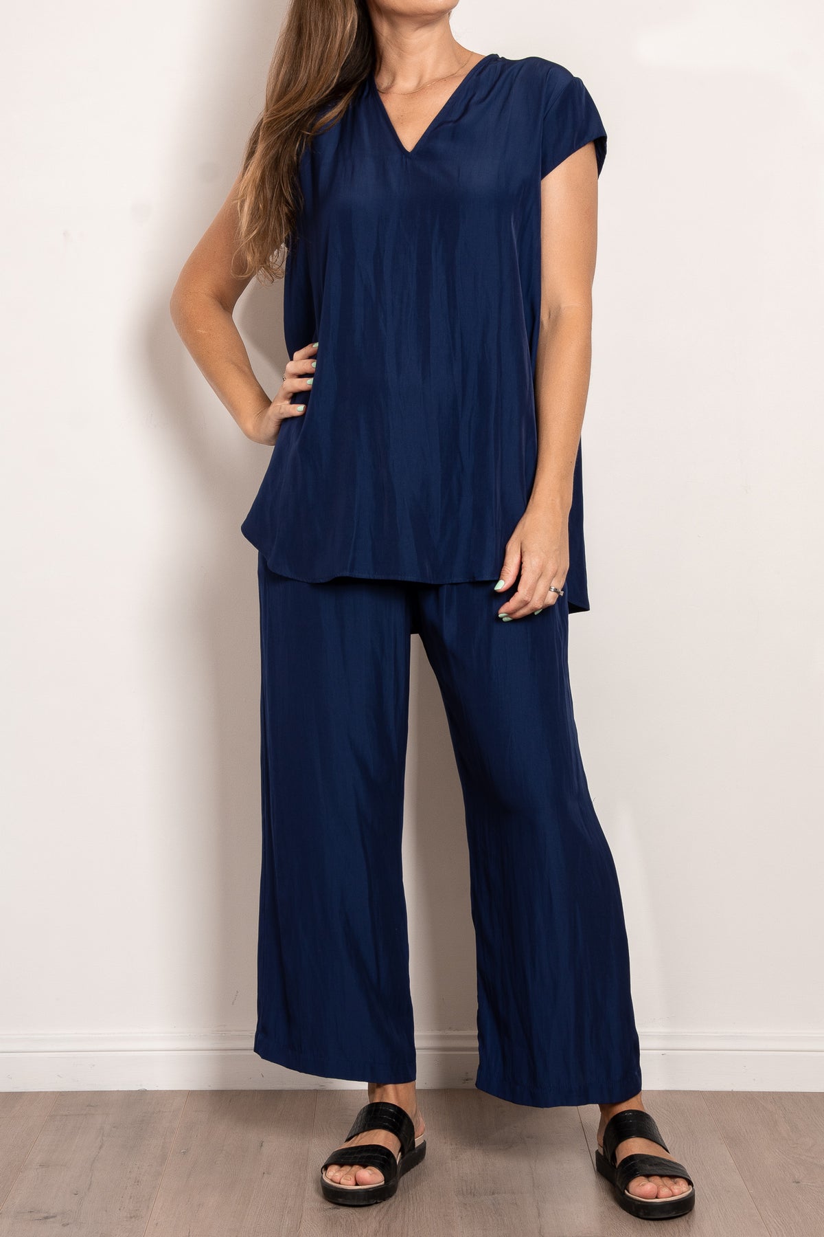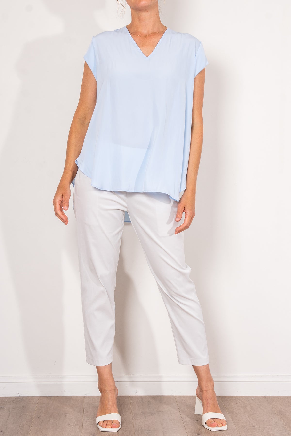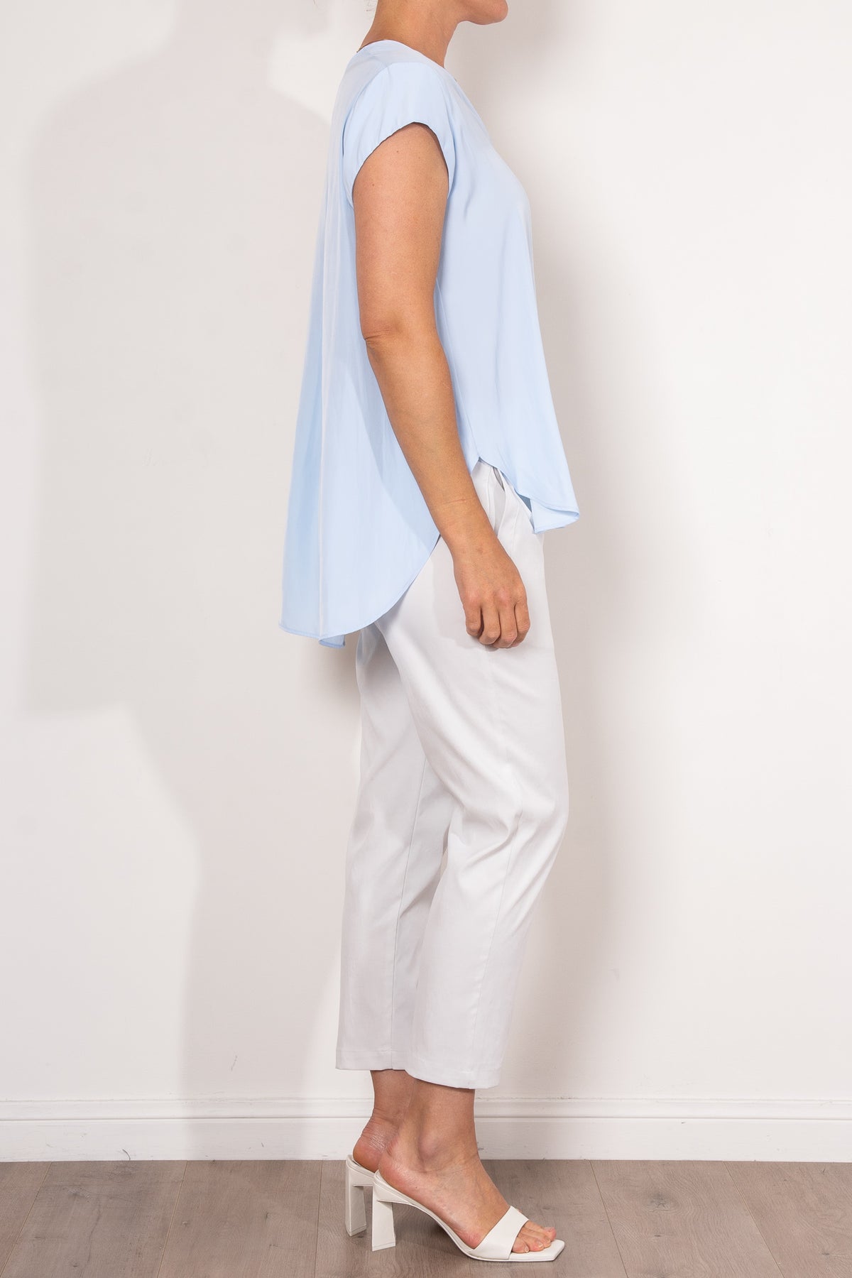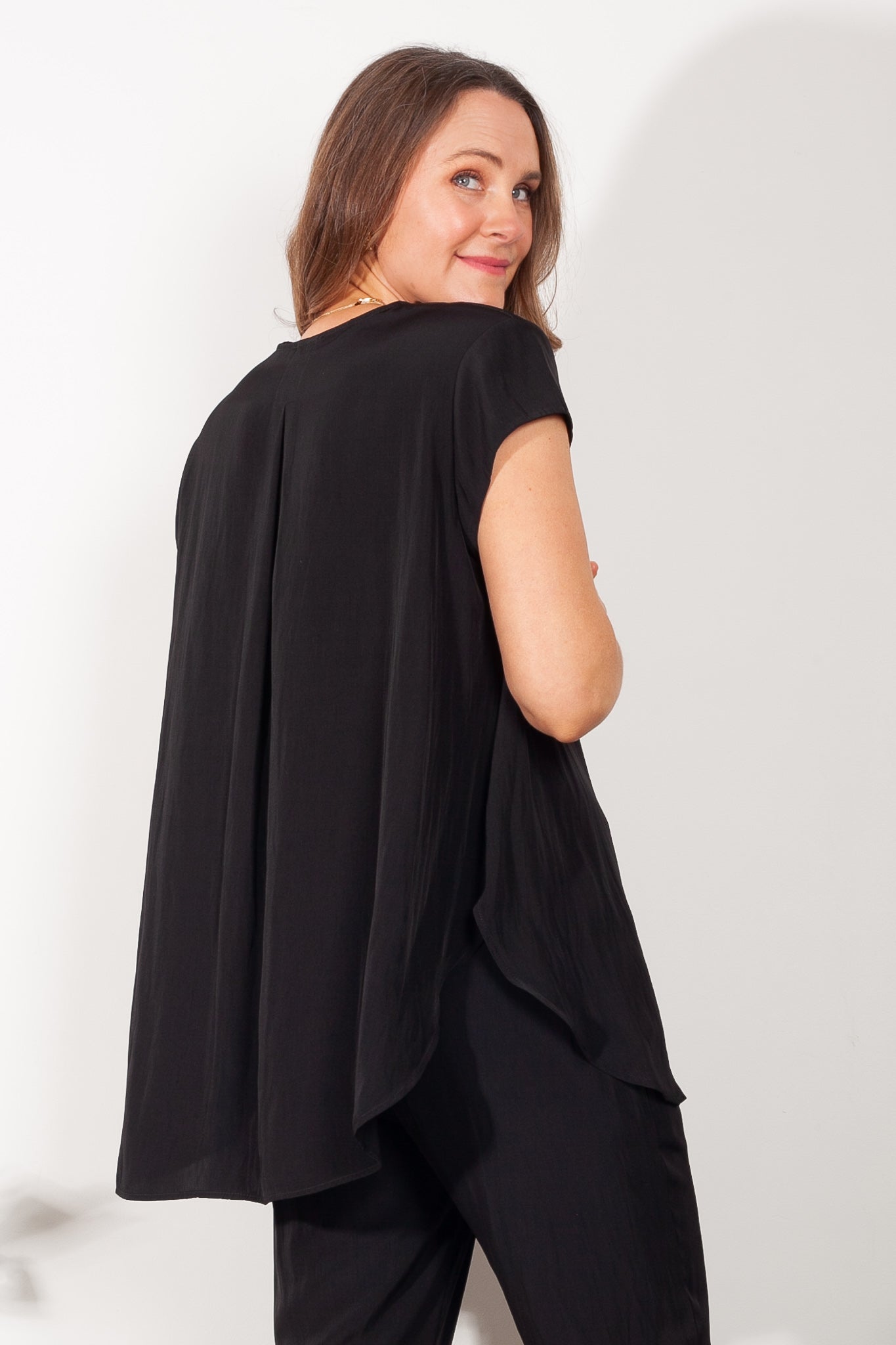 Crafted from Mela Purdie's fluid Mache, the Glide Top is cut for a slightly loose, A-line fit that is comfortable and figure flattering. With a longer length and curved hemline, this style features capped sleeves and a V Neckline.