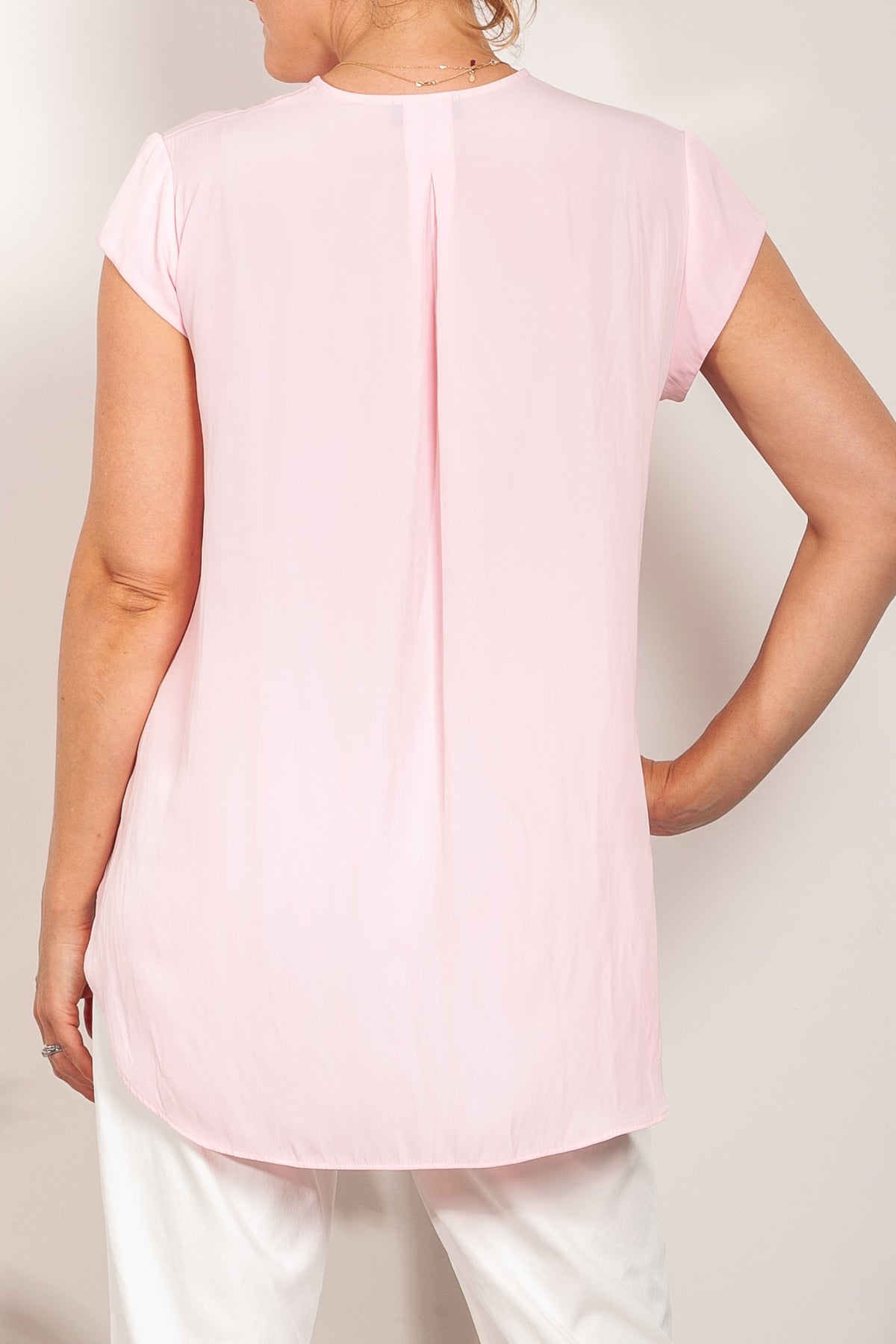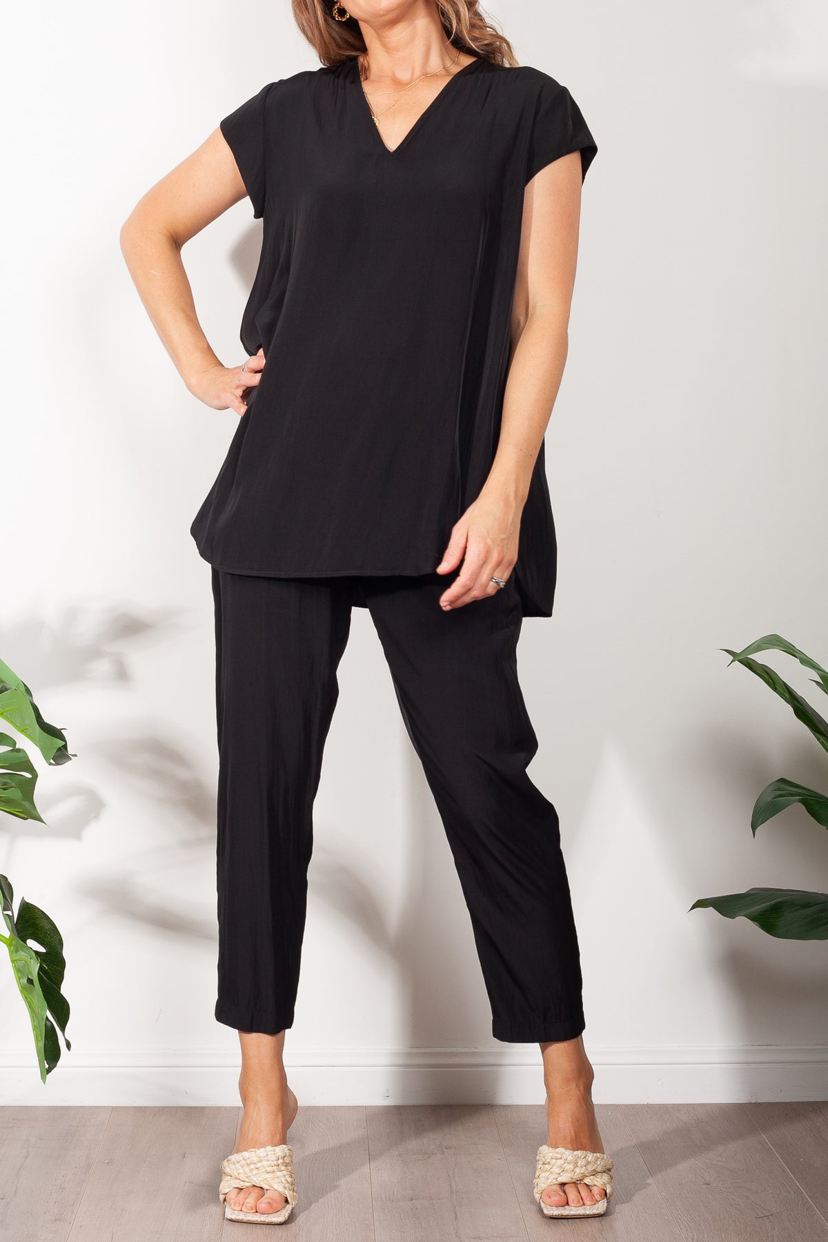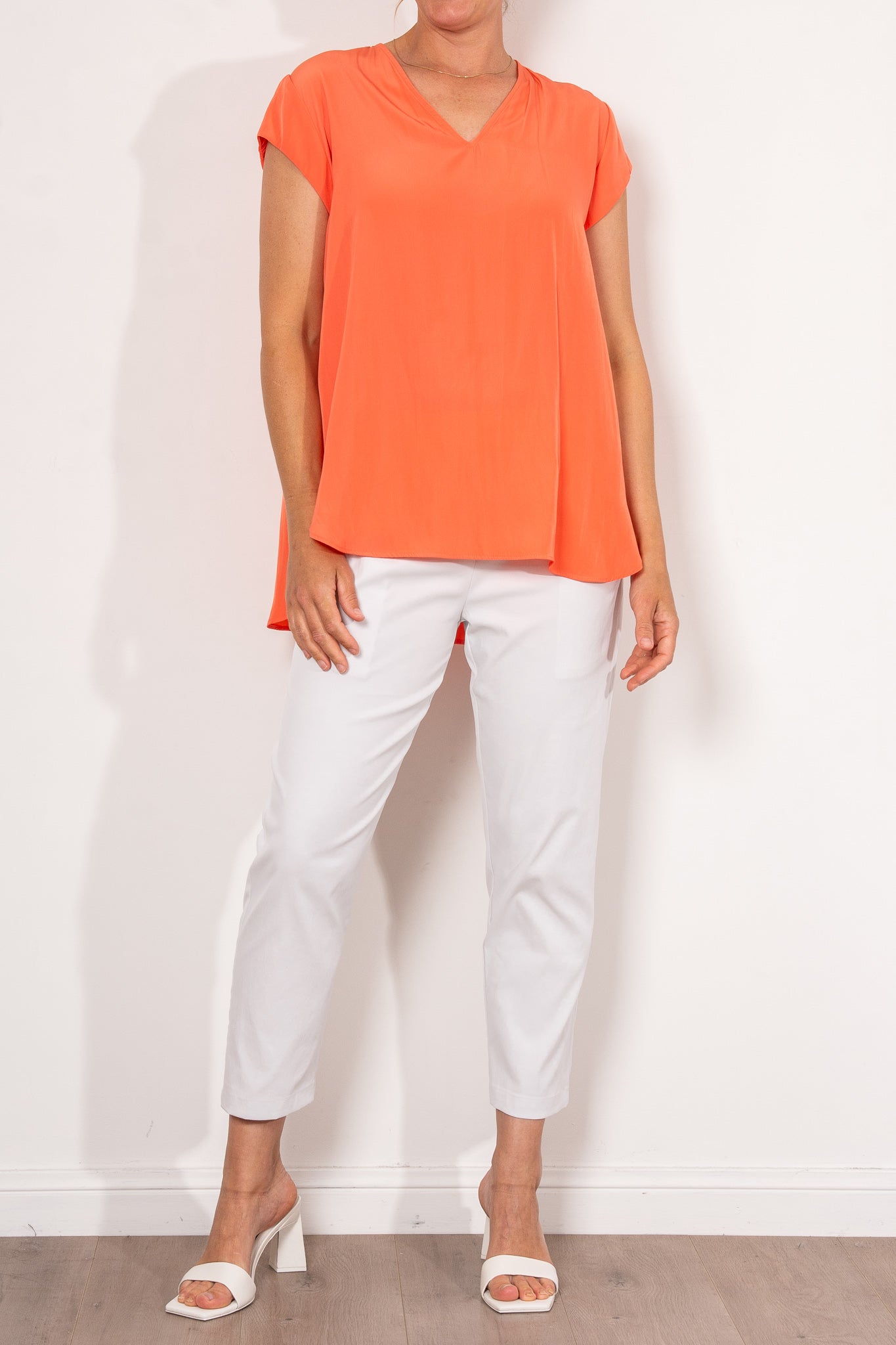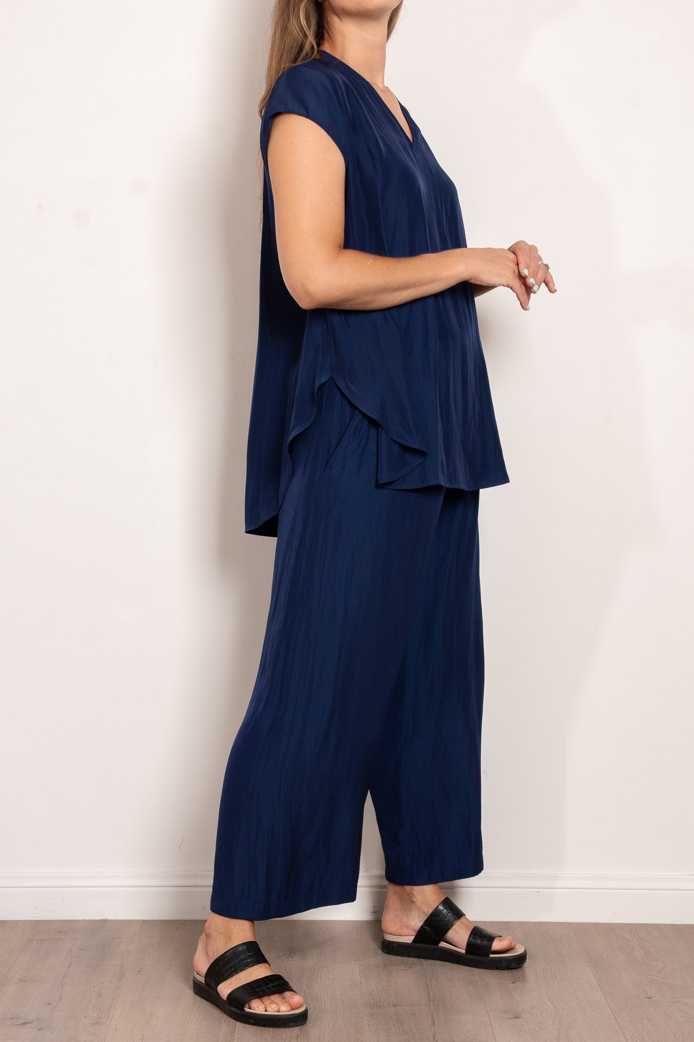 Crafted from Mela Purdie's fluid Mache, the Glide Top is cut for a slightly loose, A-line fit that is comfortable and figure flattering. With a longer length and curved hemline, this style features capped sleeves and a V Neckline.
